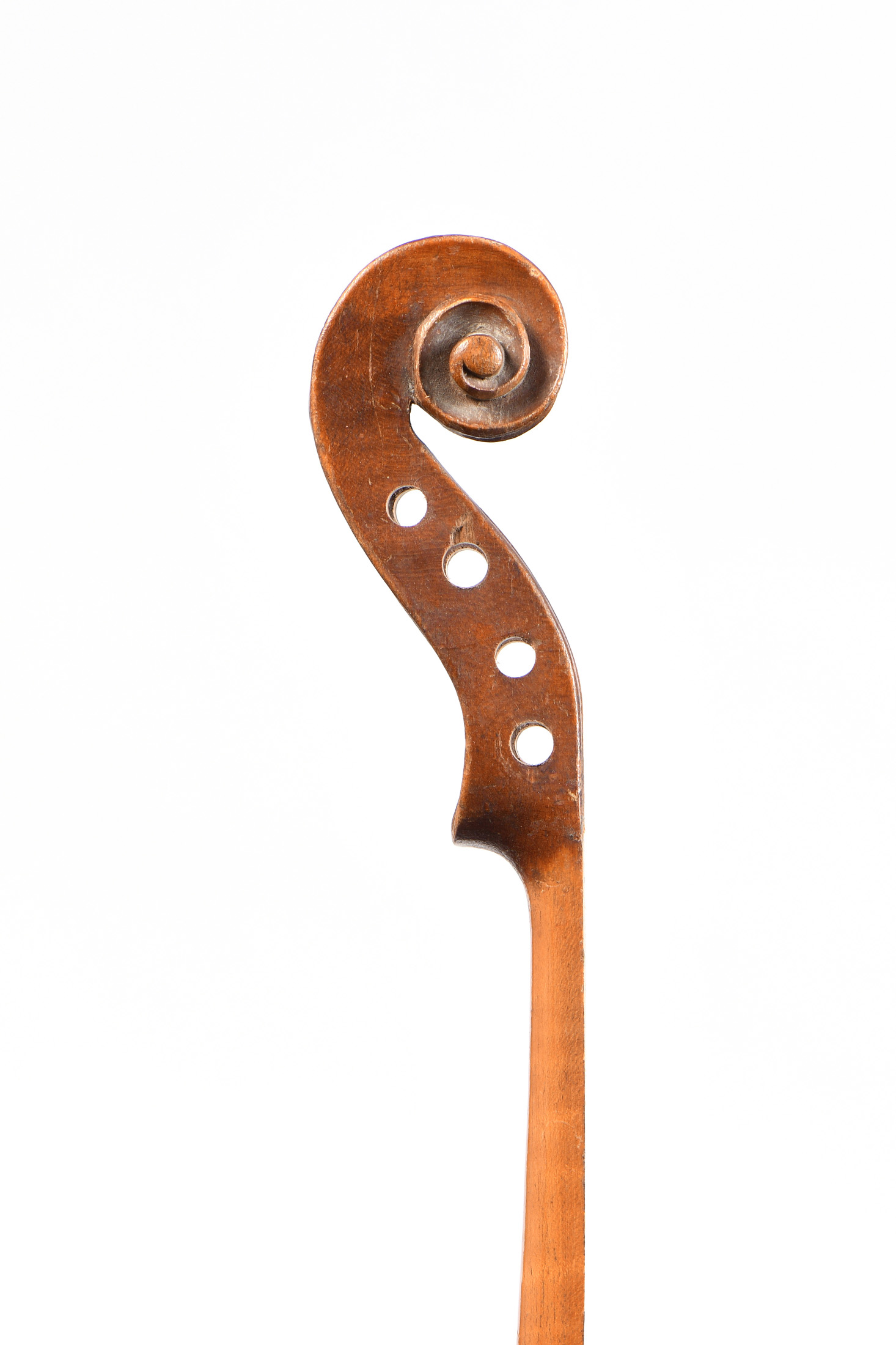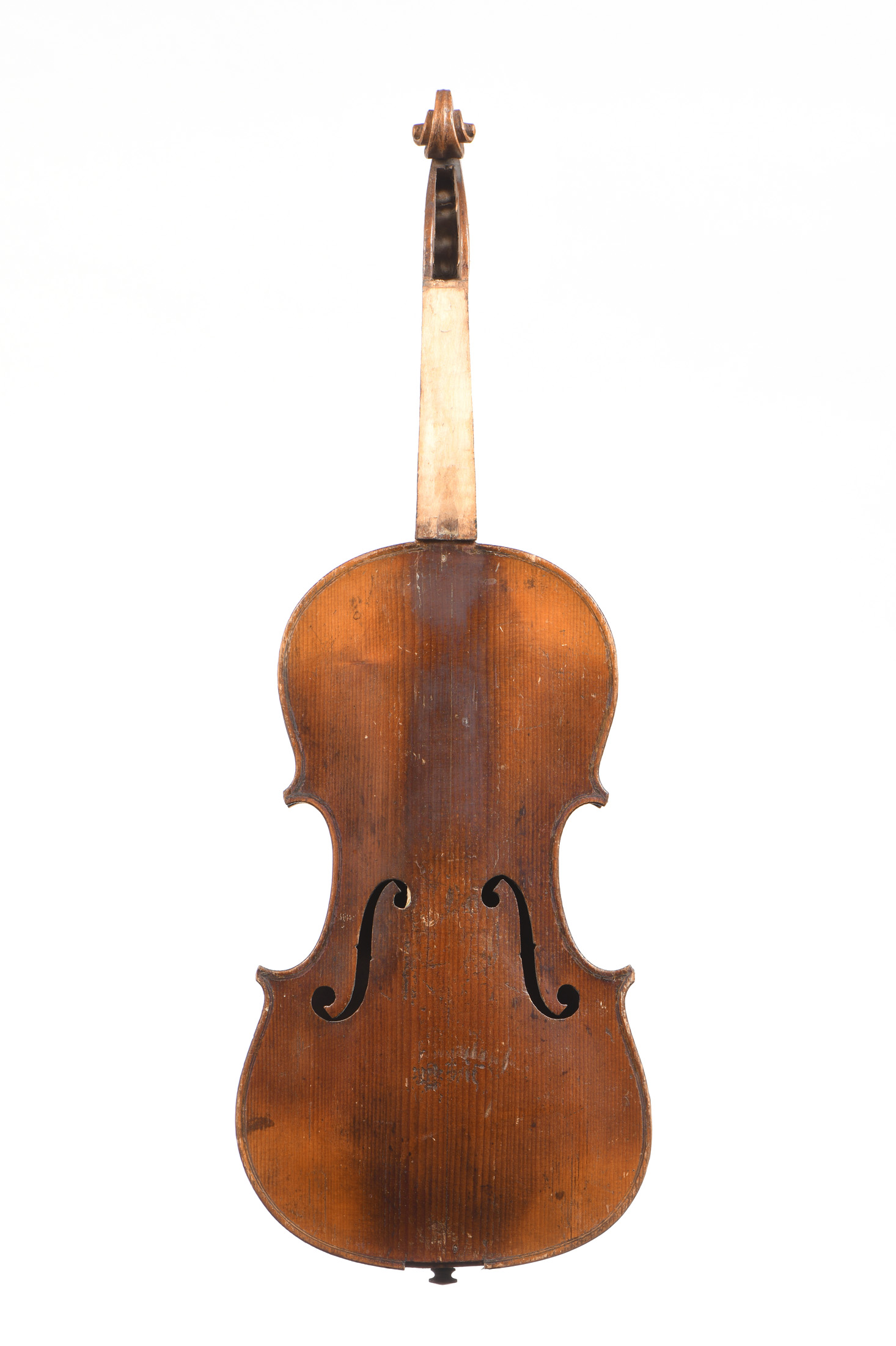 Manche baroque. Vernis brun doré. Fond de deux pièces. Table en épicéa aux pores larges et irréguliers. L'ensemble à restaurer: décollages, usures et cassures. 355 mm. Manque la touche.