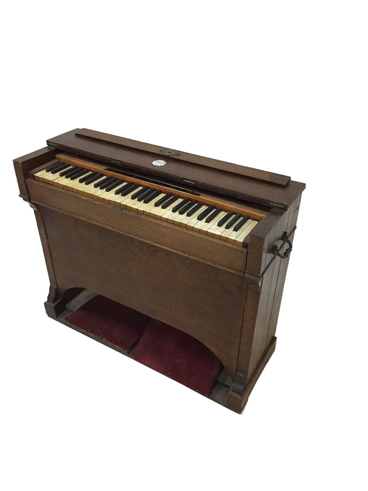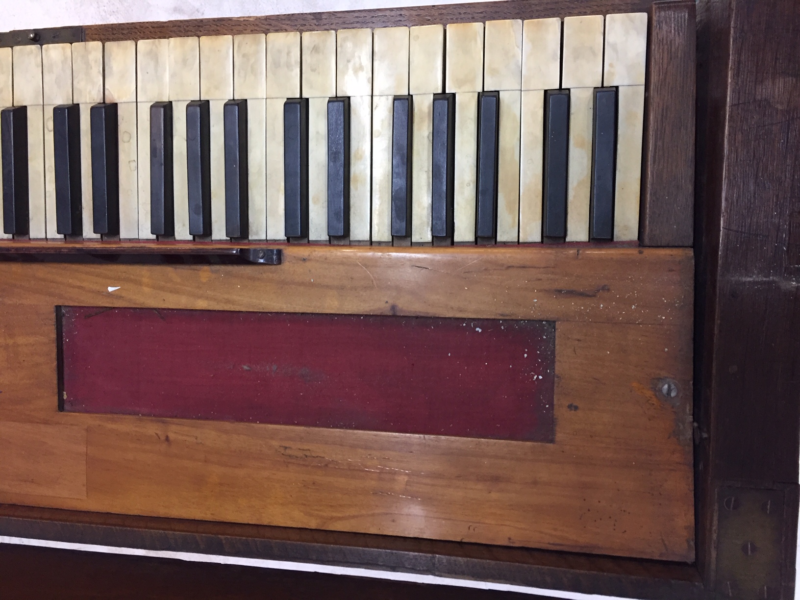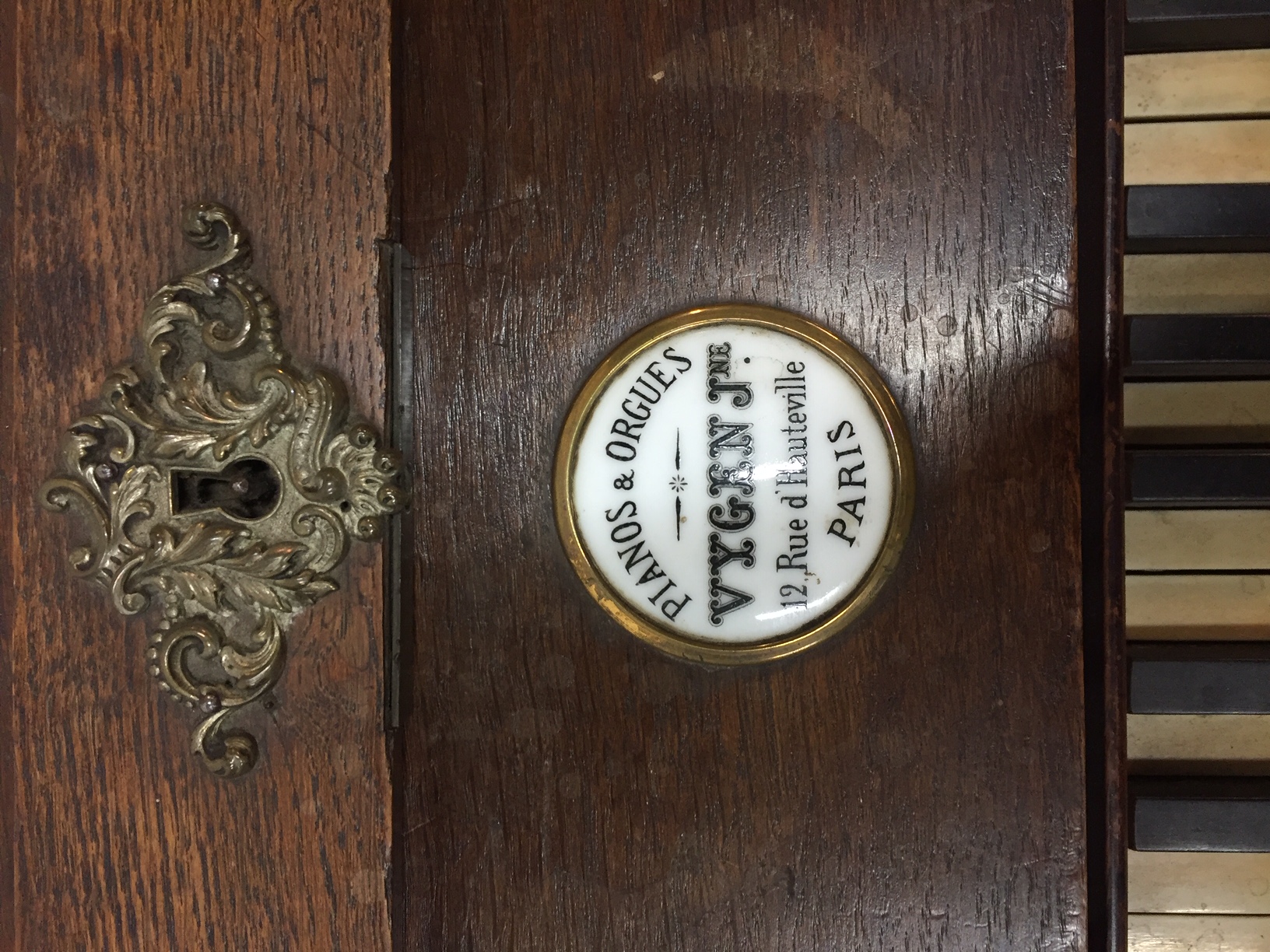 portant une plaque "PIANOS et ORGUES VYGEN Jne. 12 rue dHauteville. PARIS", En chêne. L'ensemble est à restaurer: système de soufflerie, traces vers...