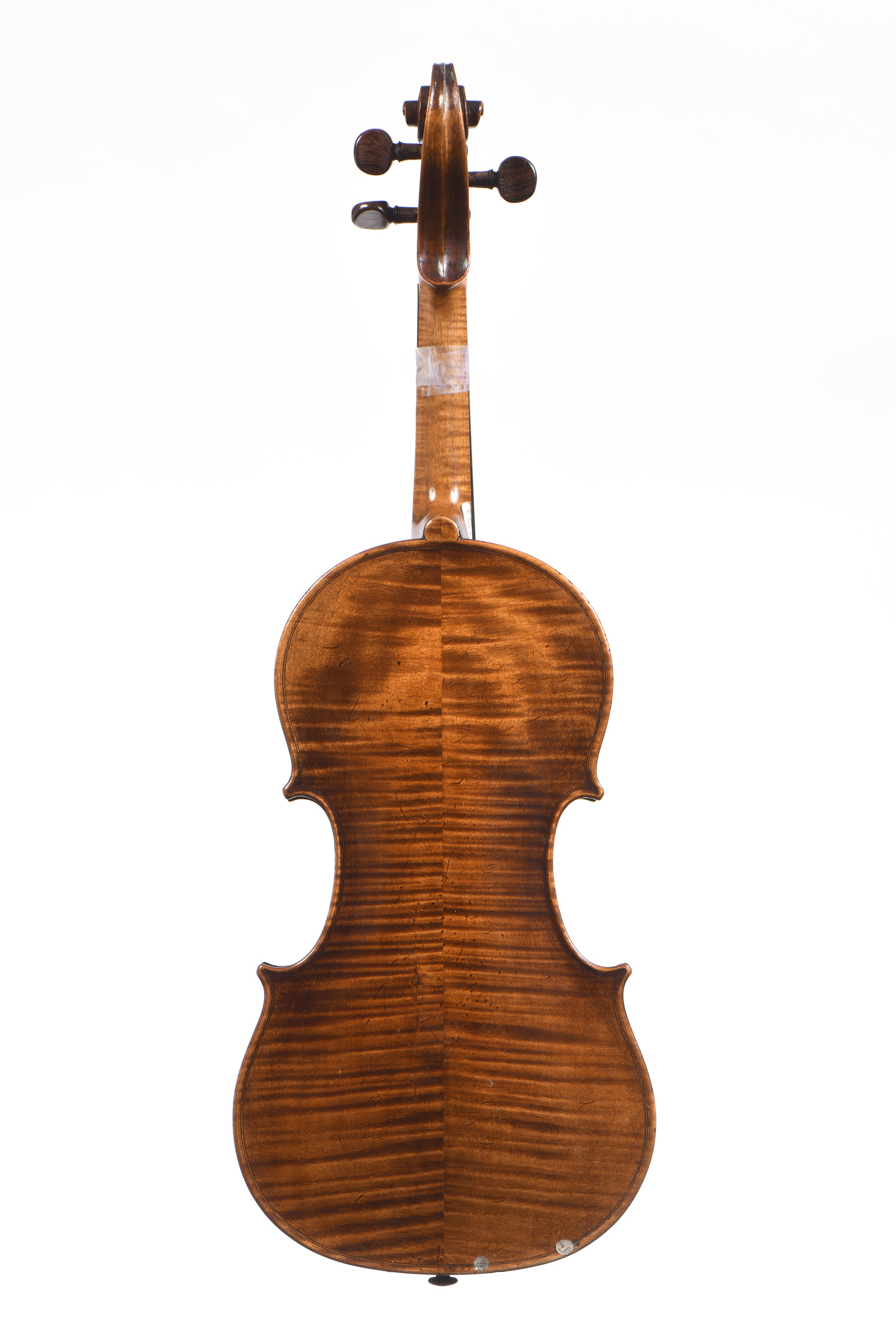 portant une étiquette Dominicus LAMPANELLI. Vernis brun doré. Fond de deux pièces. Touche à recoller. Cassure à la tête recollée. 357 mm.
