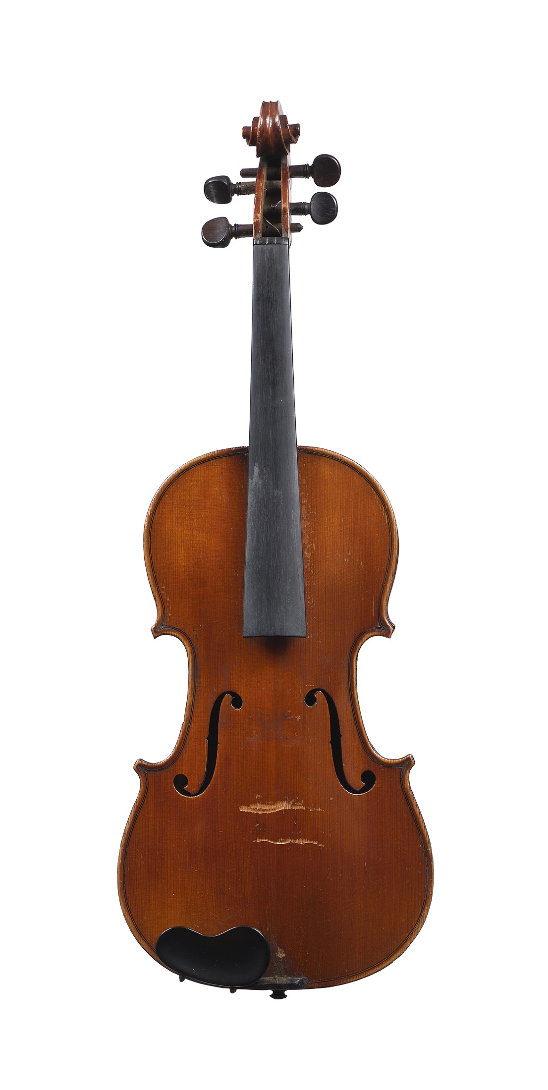 portant l'étiquette "Modèle d'après Stradivarius...". Fond d'une pièce en érable. Vernis brun orangé sur fond doré. Usure à la table. Bon état général.