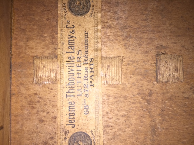 fait dans les ateliers Jerome Thibouville Lamy dont elle porte l'étiquette "Jerome Thibouville Lamy et Cie. LUTHIERS. 68 bis à 72 rue Réaumur. PARIS.".Table en épicéa. L'ensemble est à restaurer.
