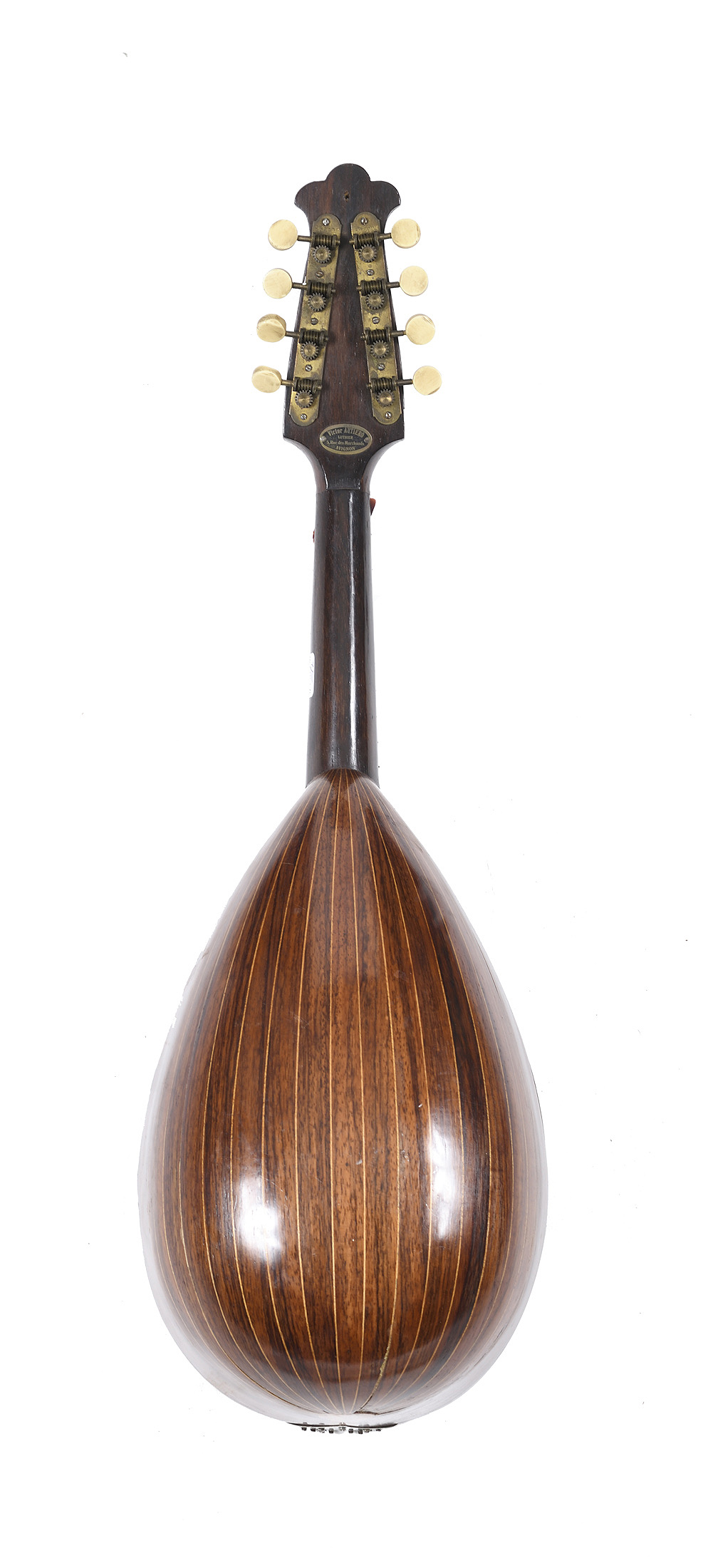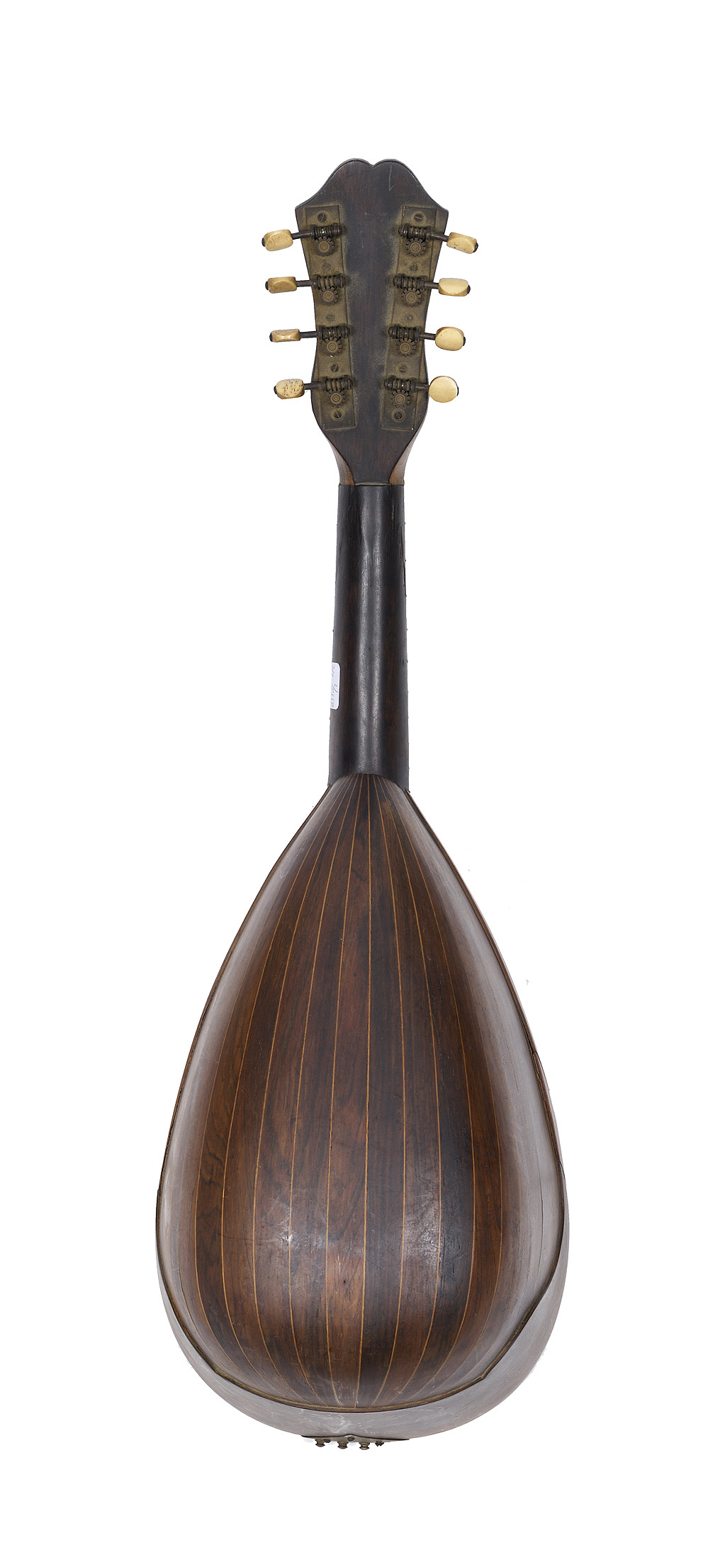 Lot de deux mandolines napolitaines à fond bombé. Diverses cassures: l'ensemble à restaurer. Etiquettes "STRIDENTE Via Antonio 22..." "PASQUALE SORIANI..."