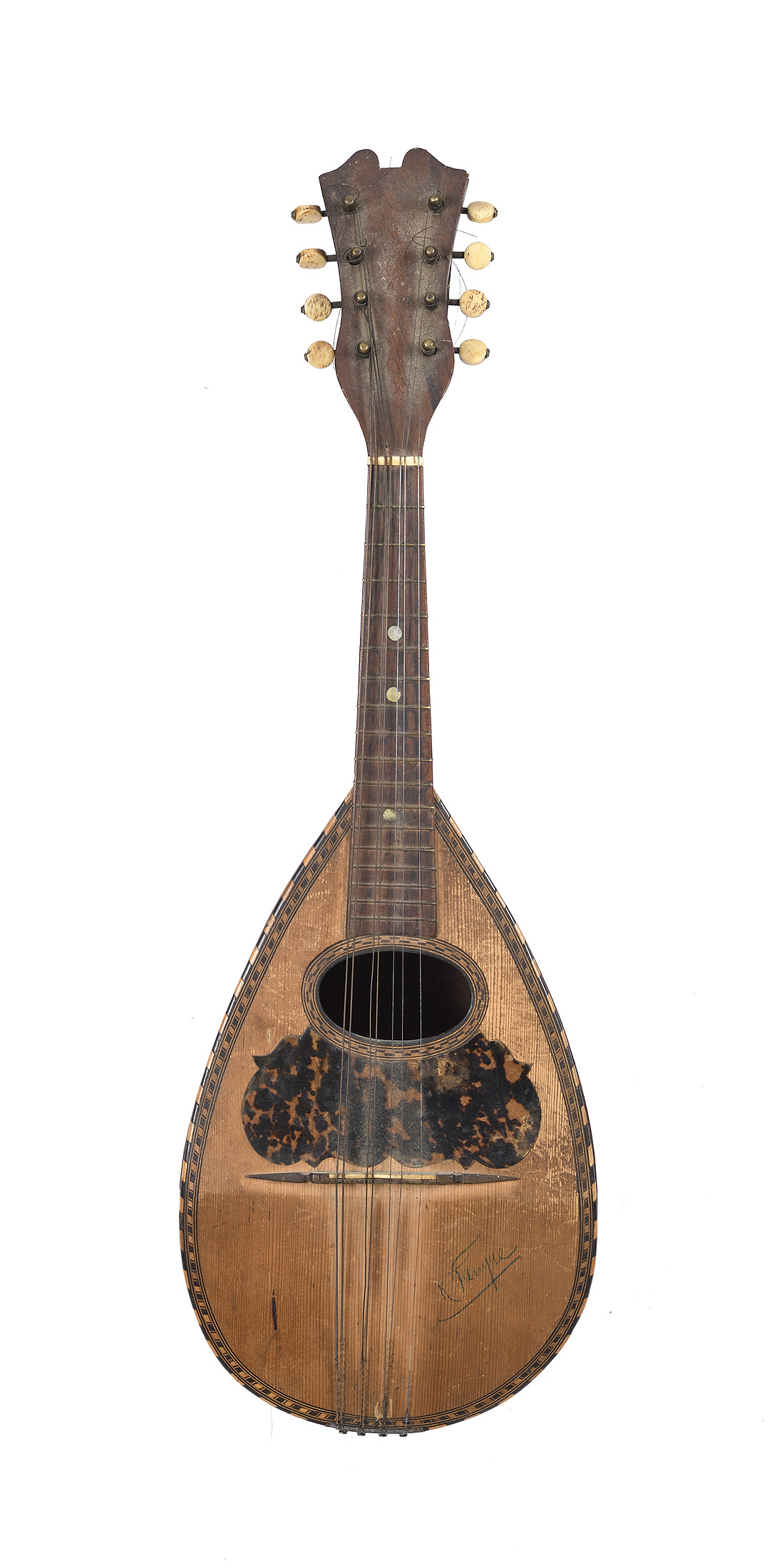 Portant une signature sur la table. Bords incrustés. Table en épicéa. Fond bombé. L'ensemble est à restaurer.