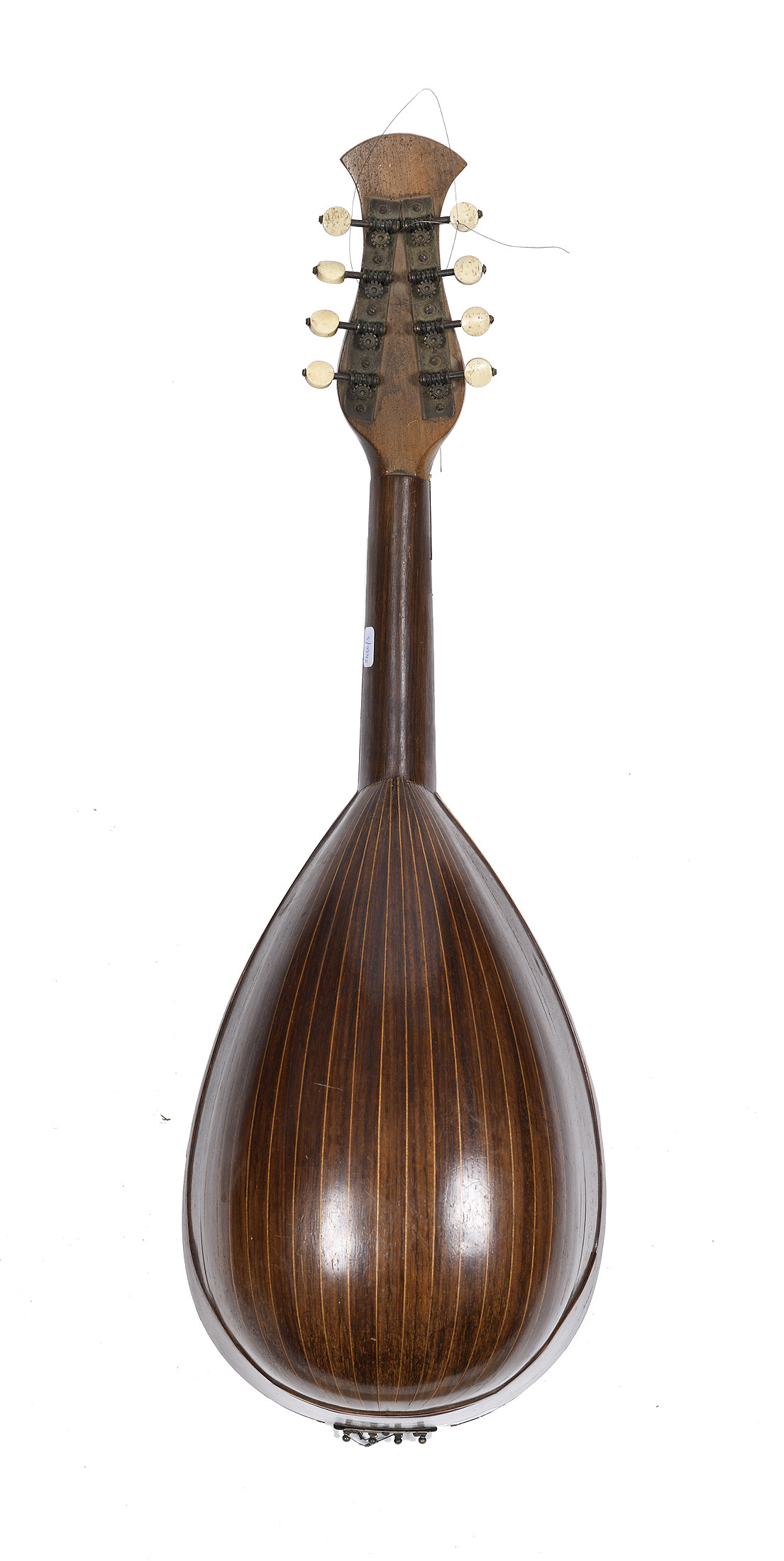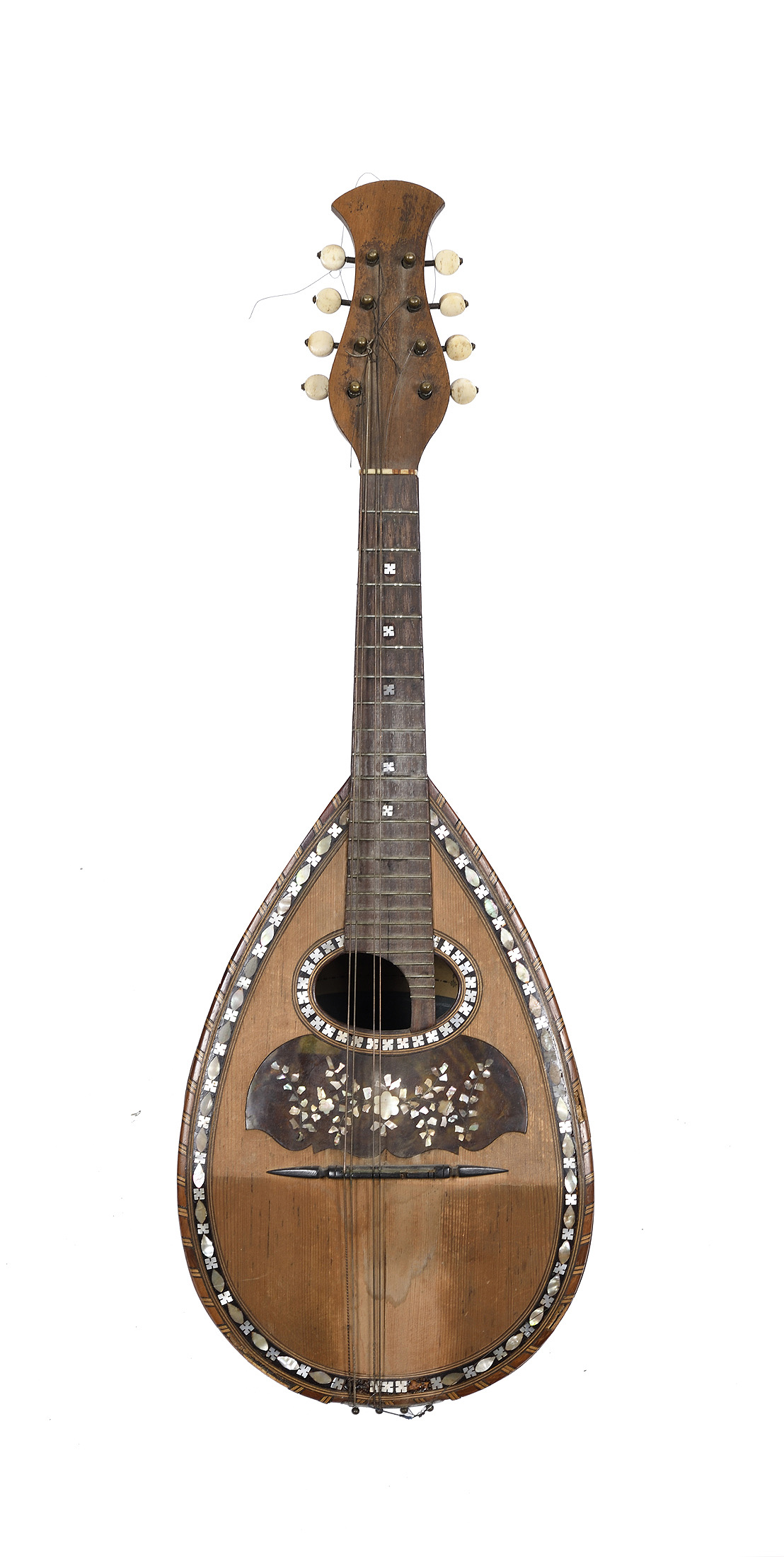 Portant une étiquette "AGOSTINO TIERI Alievi dei Fratelli Yinacci Frabricanti di strumenti armonici. 196 Via duomo. Napoli." Table en épicéa avec bords incrustés de nacres... Fond bombé. L'ensemble à restaurer.