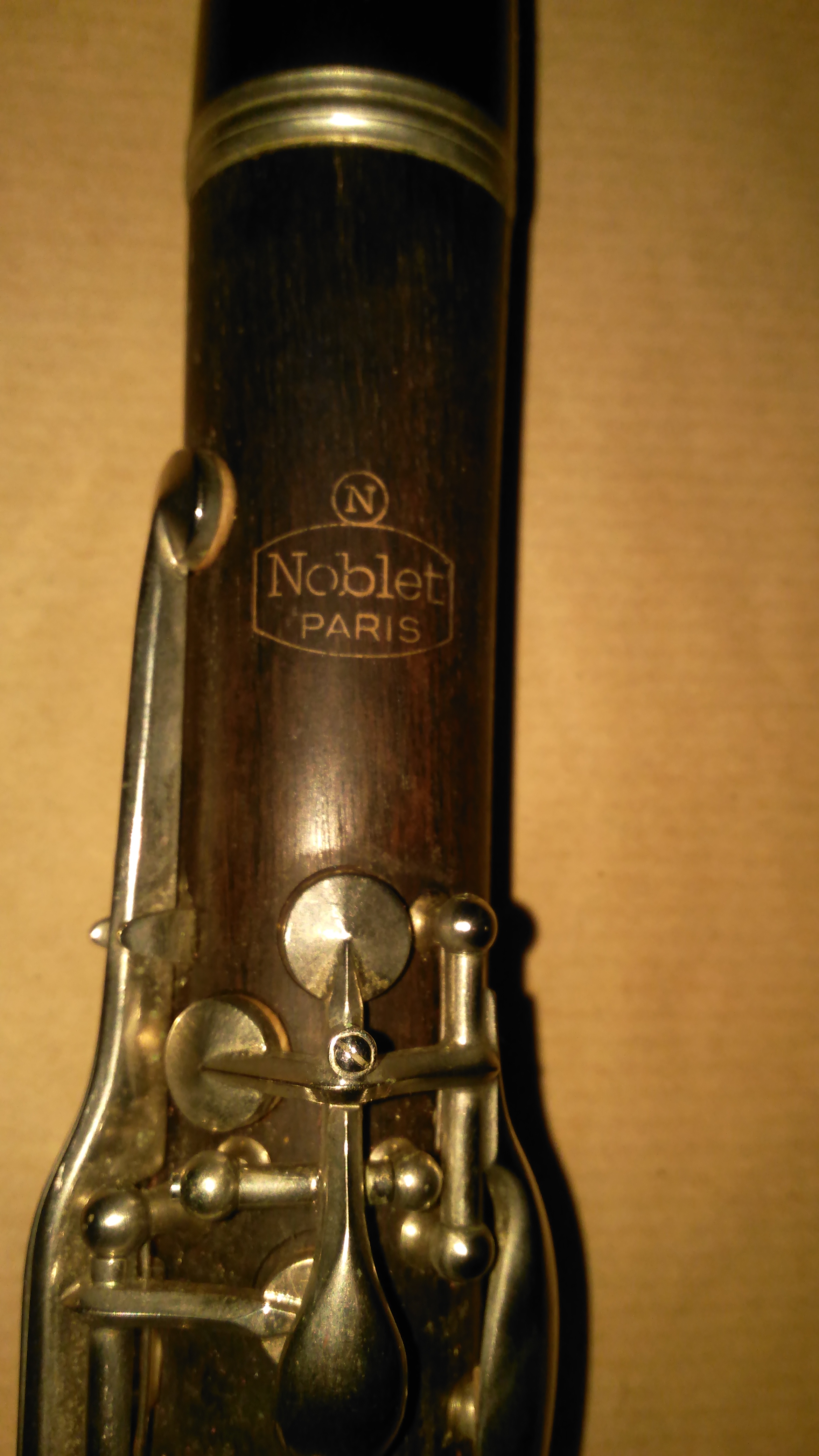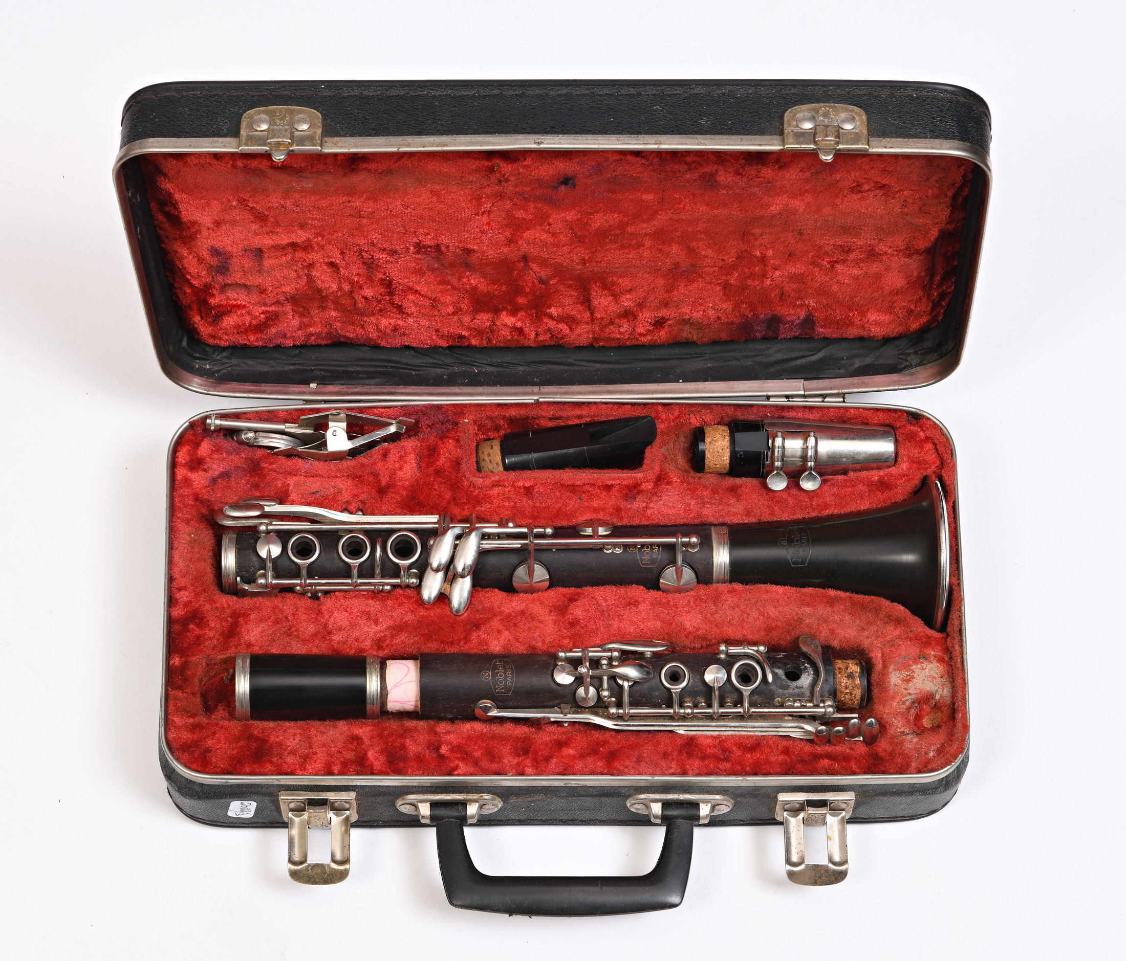 Clarinette d'étude portant la marque Noblet PARIS. Bois et bakélite. En l'état: Tampons, lièges, ressors à revoir. Avec boite.