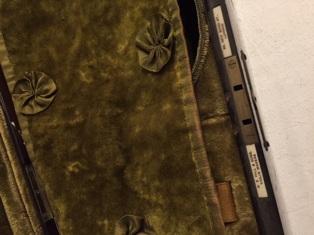 En placage de bois de palissandre. Intérieur en velours Vert. Portant la marque "W.E HILL and Sons Violin Makers. 88 New Bond Street. LONDON". Manques et altérations: A restaurer.