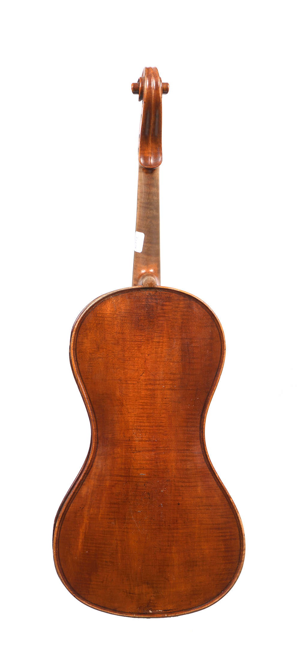 Violon sans coins portant une étiquette apocryphe "François LUPOT. Luthier Paris 1819." Fond d'une pièce en érable. Vernis brun sur fond doré. 362 mm. Diverses cassures.