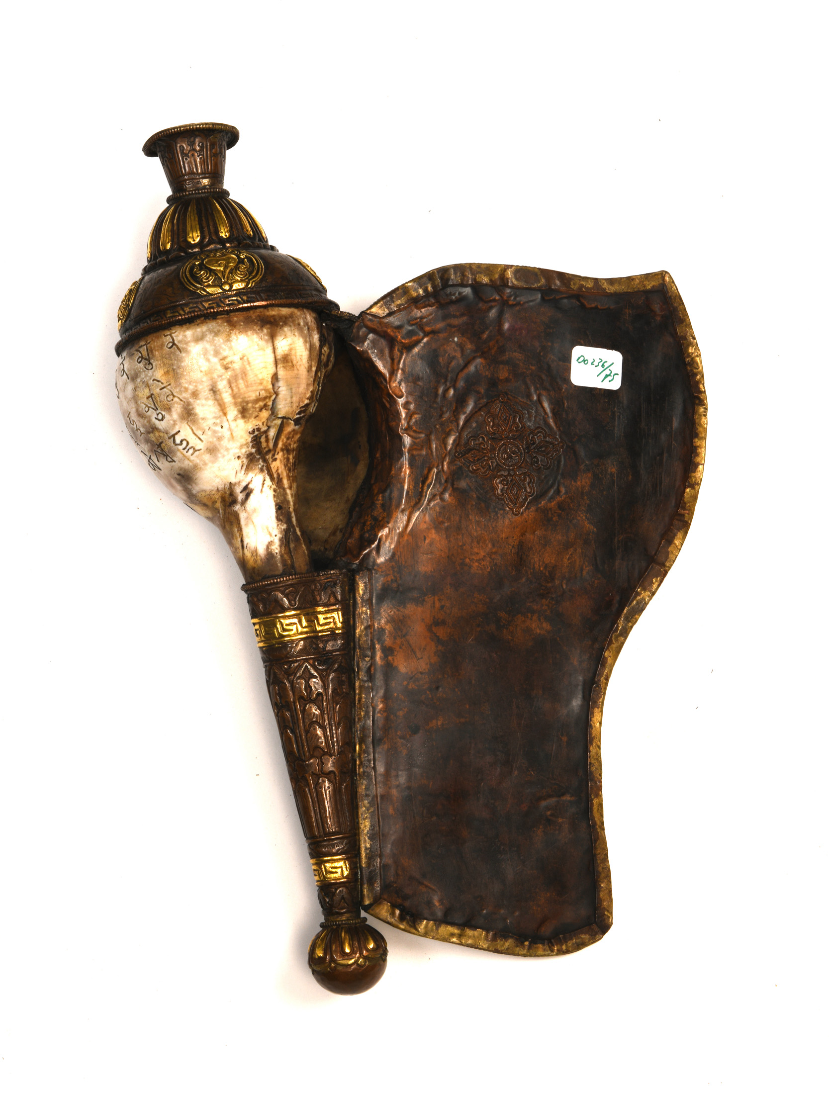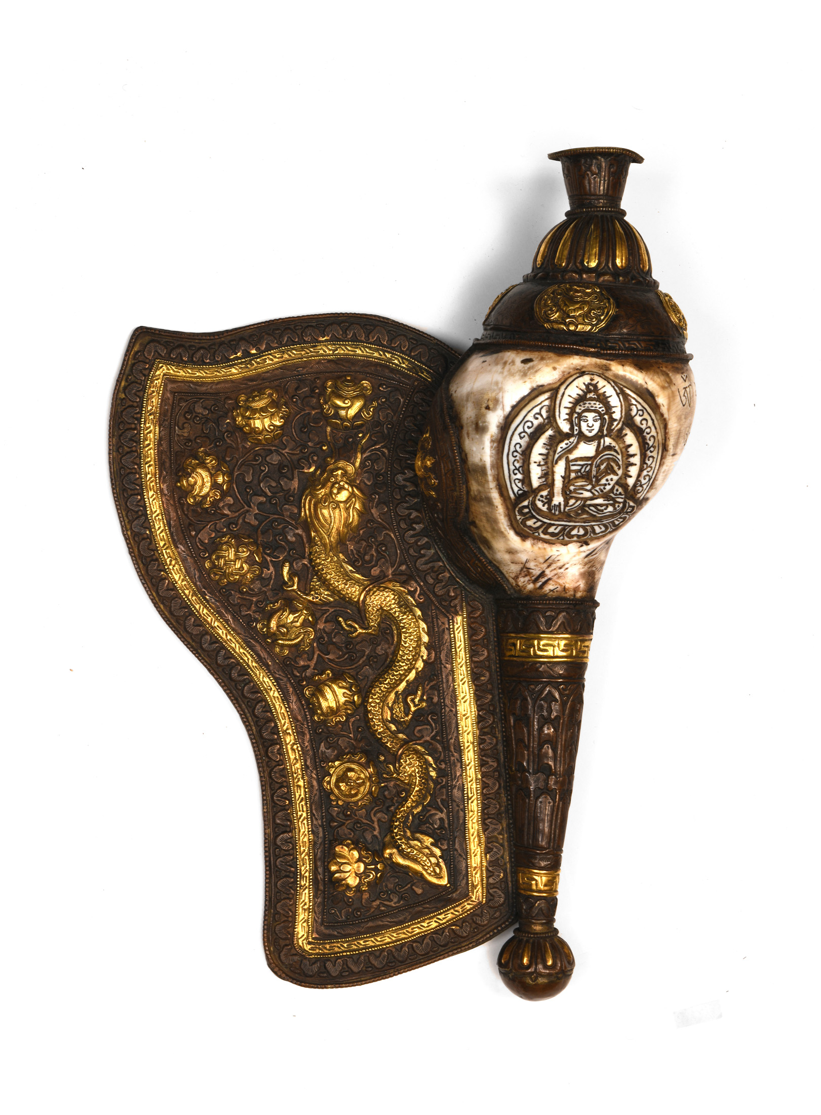 Conque de cérémonie ornée de huit dragons bouddhiques. Monture en bronze patiné et doré.