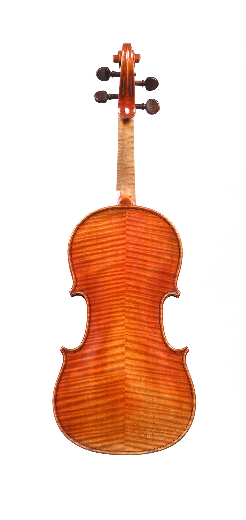 dont il porte l'étiquette " Lutherie d'art. Christian OLIVIER et Paul BISCH...1927. PARIS N°82" avec les marques au fer. Fond de deux pièces en bel érable aux ondes moyennes et régulières. Eclisses et tête du même bois. Table en épicéa aux pores irréguliers. Vernis brun orangé sur fond doré. 358 mm.