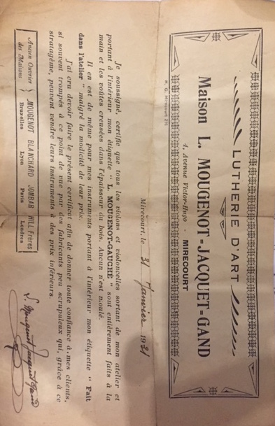Avec certificat "Lutherie d'art Maison Mougenot... 31 Janvier 1931". Avec boite et Trois archets sans valeur commerciale.