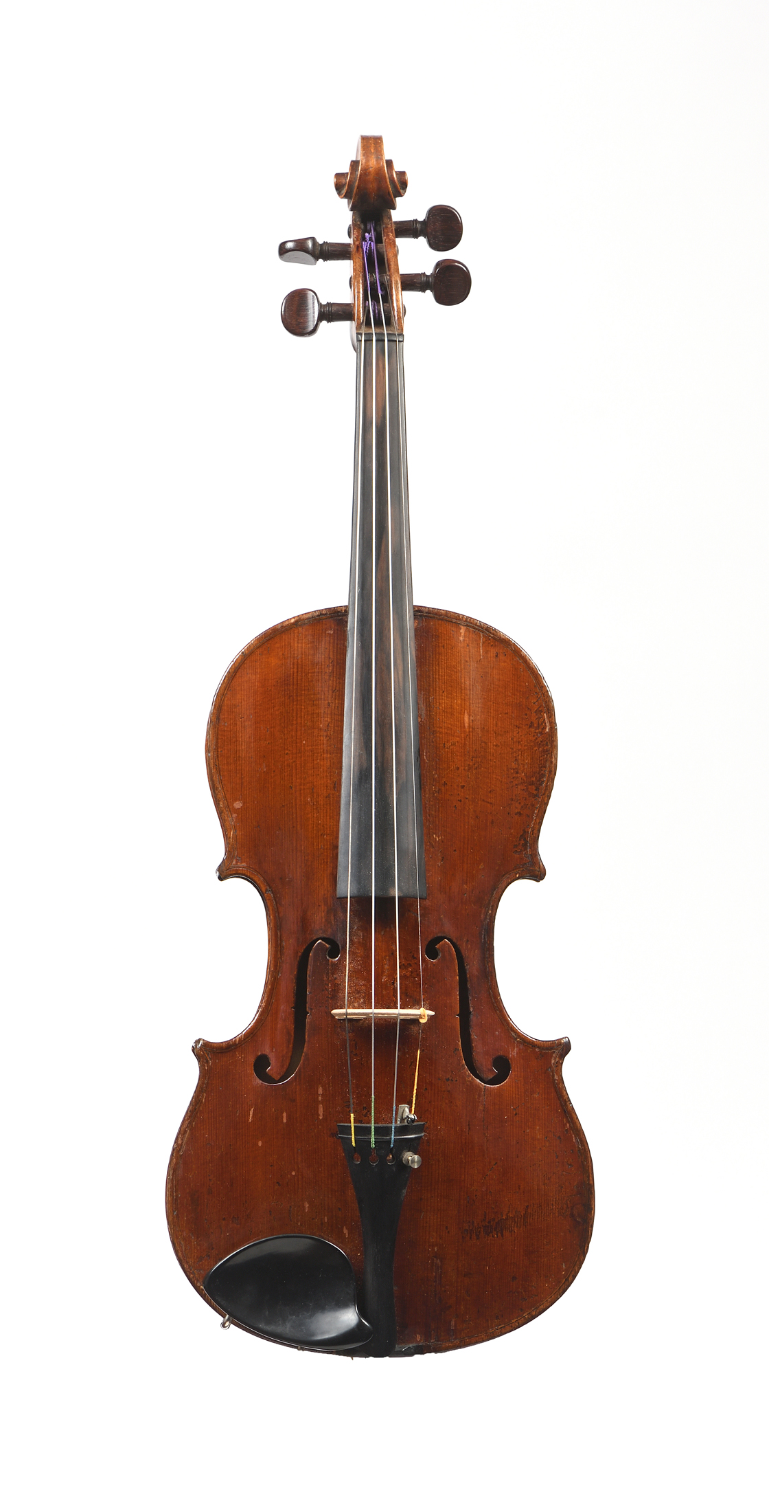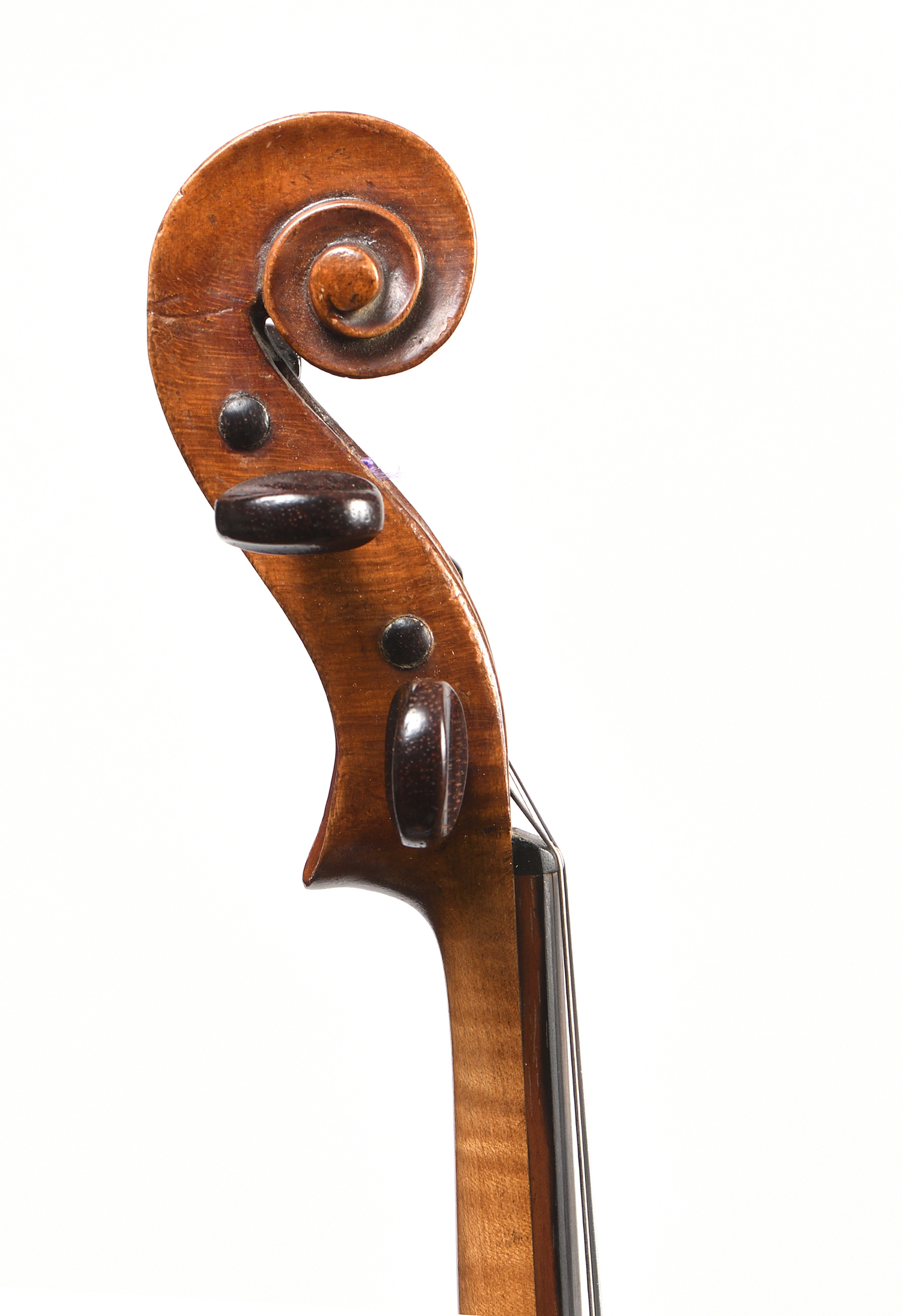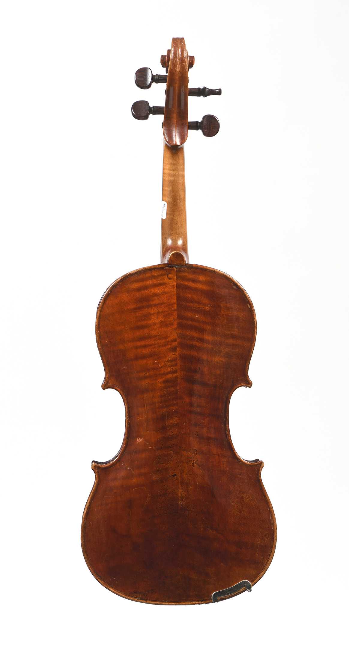 fait dans le style de DERAZEY, au début XIXe à Mirecourt. Fond de deux pièces en érable. Restauration au talon du manche. Vernis brun doré. 357 mm.