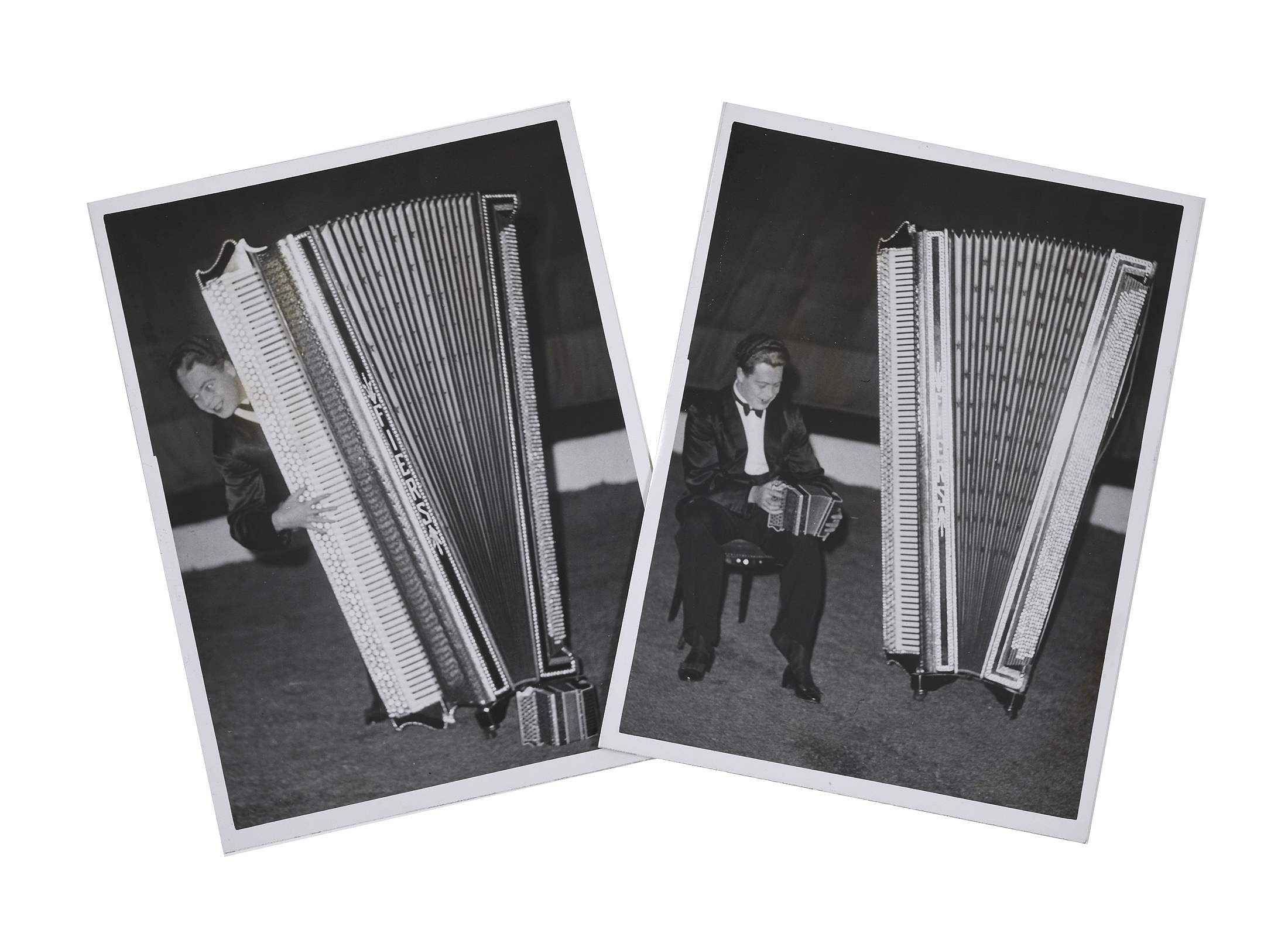 Lot de deux Photographies représentant Jean Fiers le clown, musicien. Tirages Argentiques d'époque. Portant les cachets d'agence et des lettres tapuscrites.