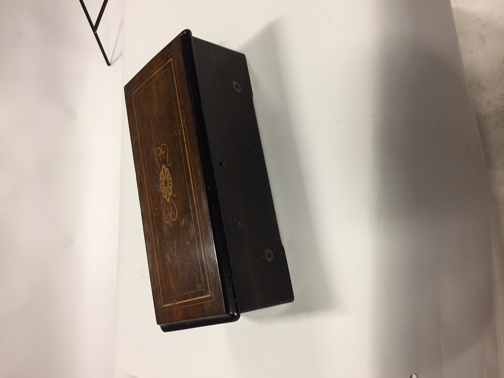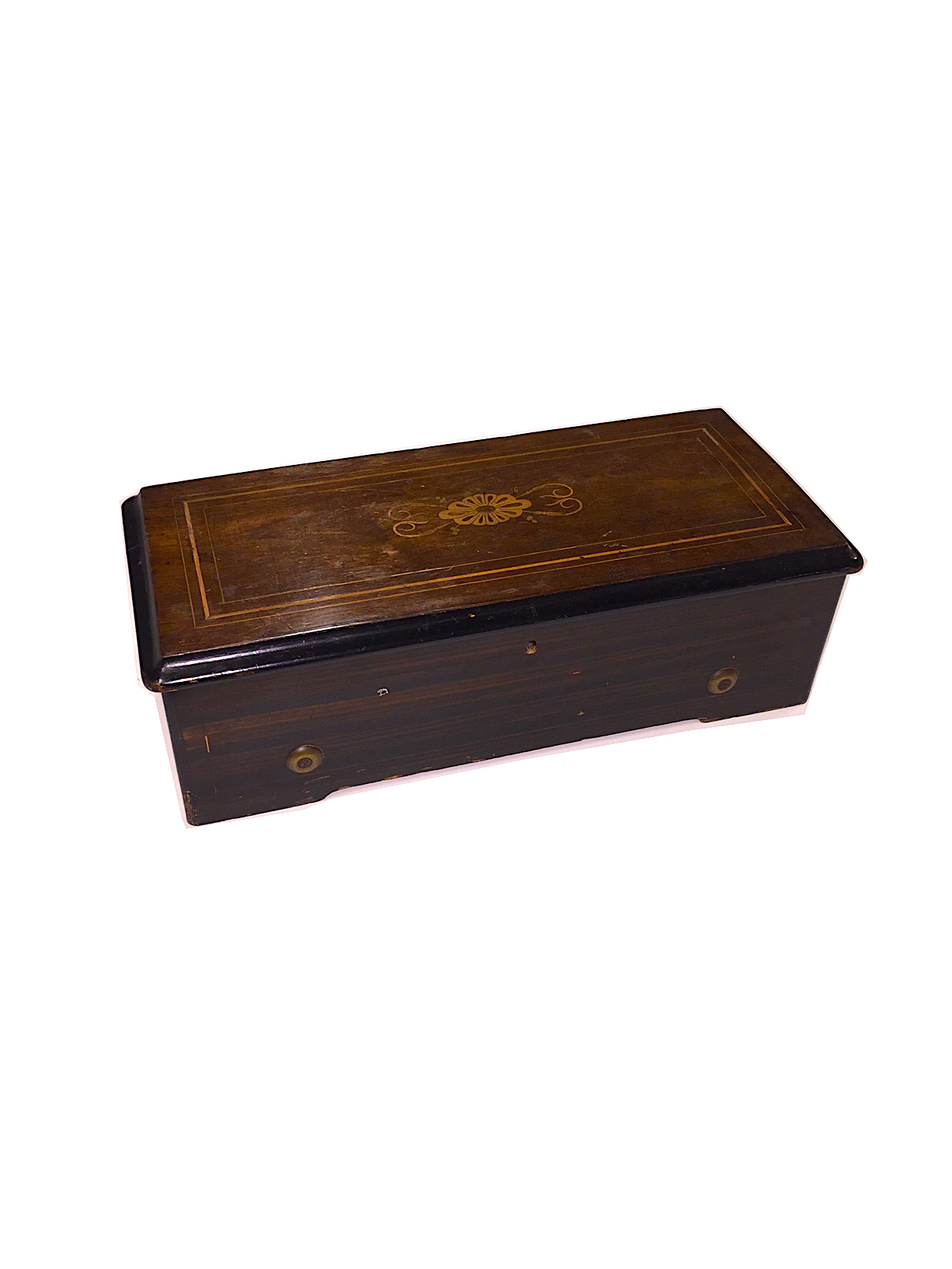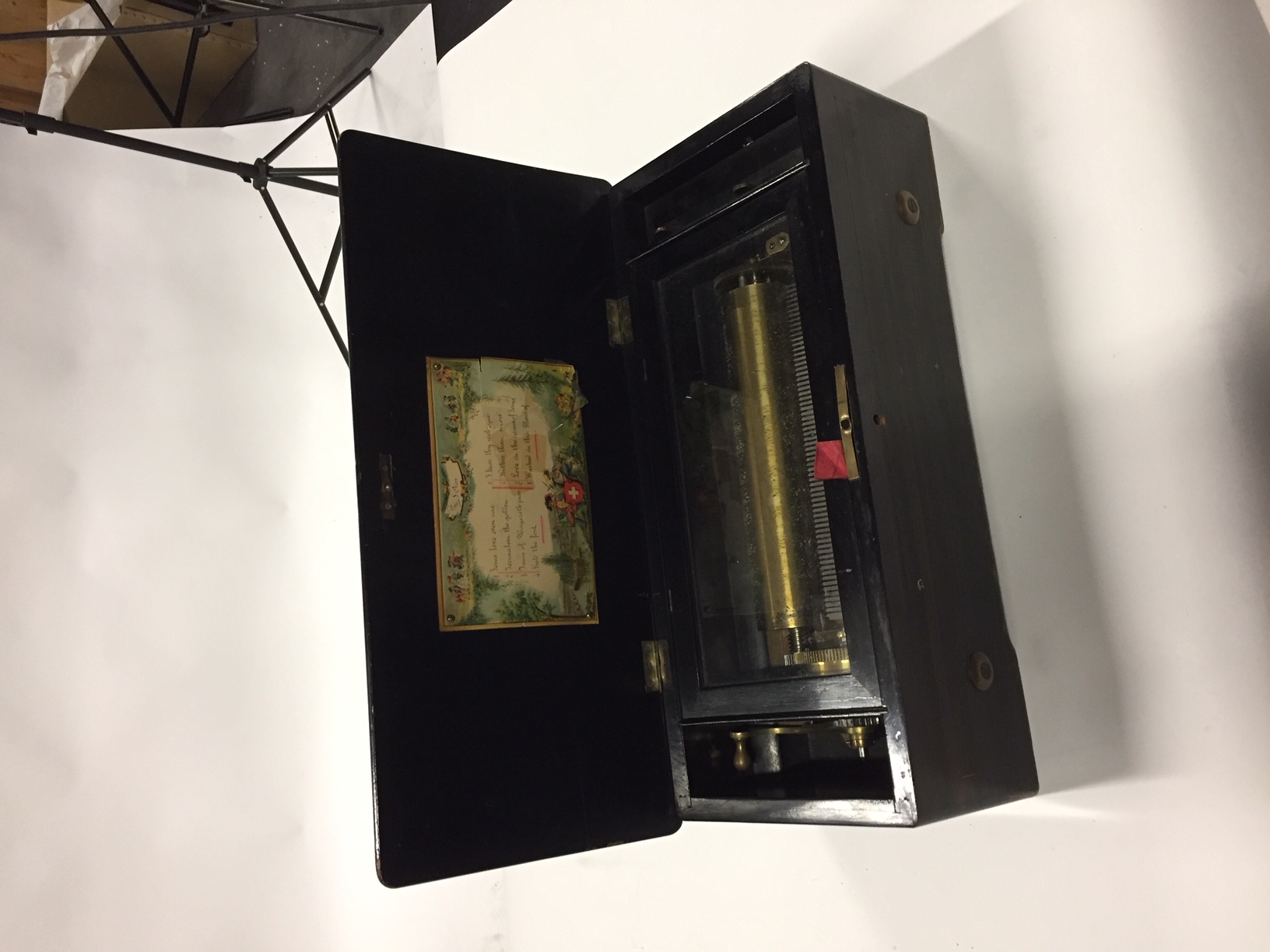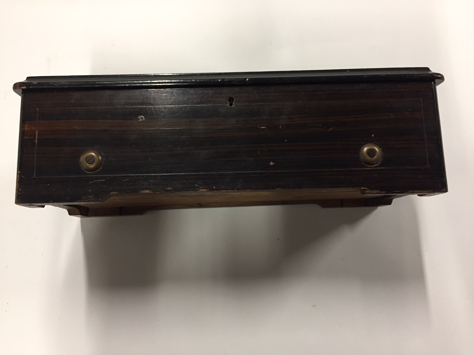 Caisse en bois noirci et plaquage de bois exotique. Boite à musique à cylindre jouant huit airs. En état de marche. Rayures, chocs et manques de plaquage 48 X 21 X 14 cm