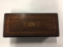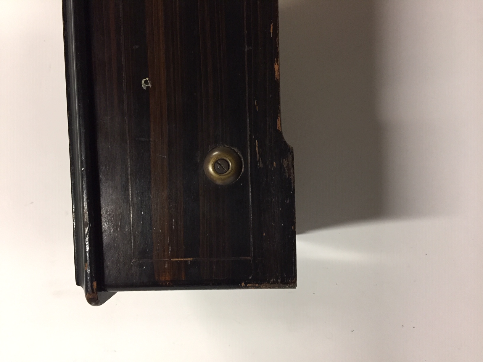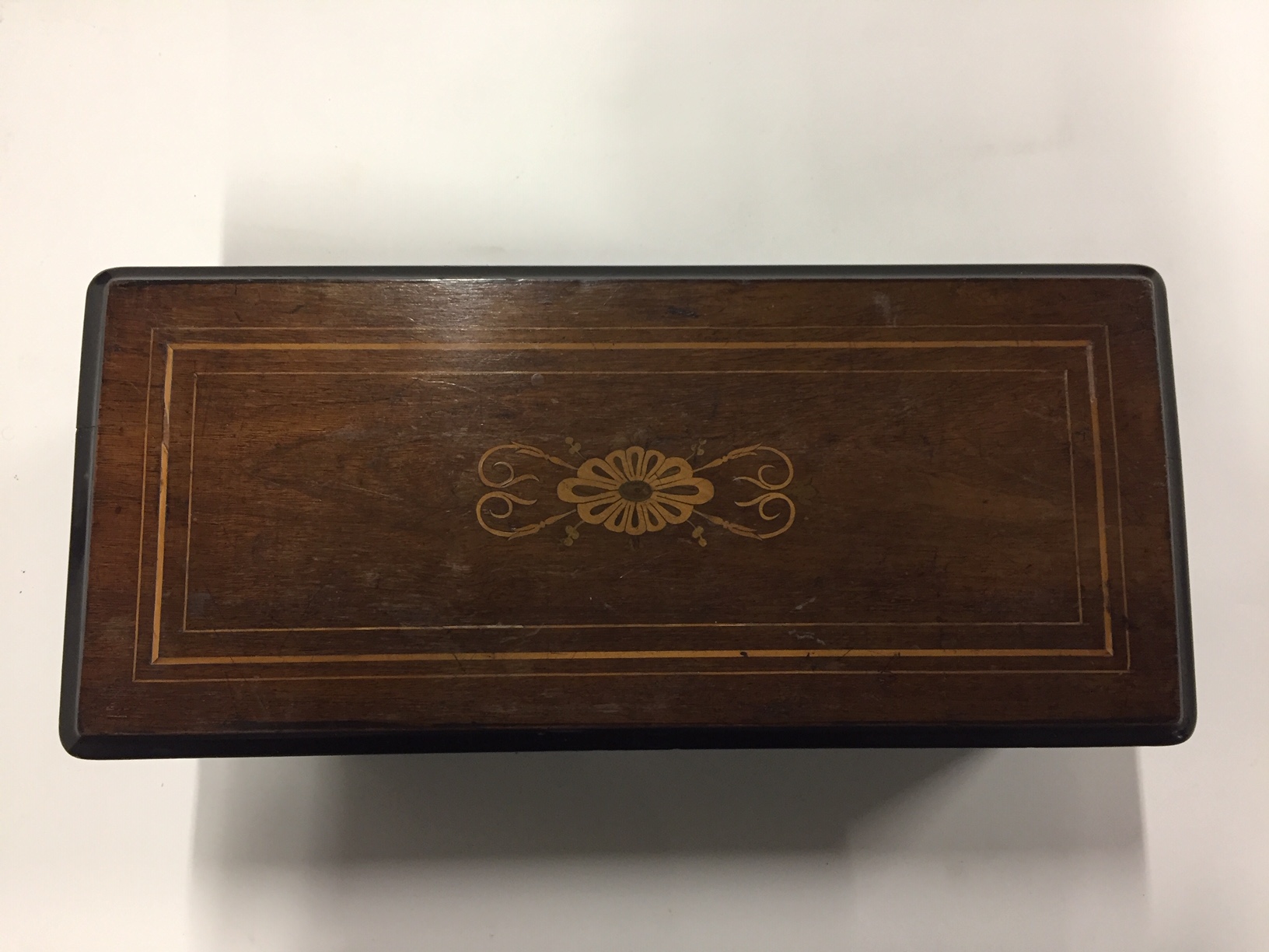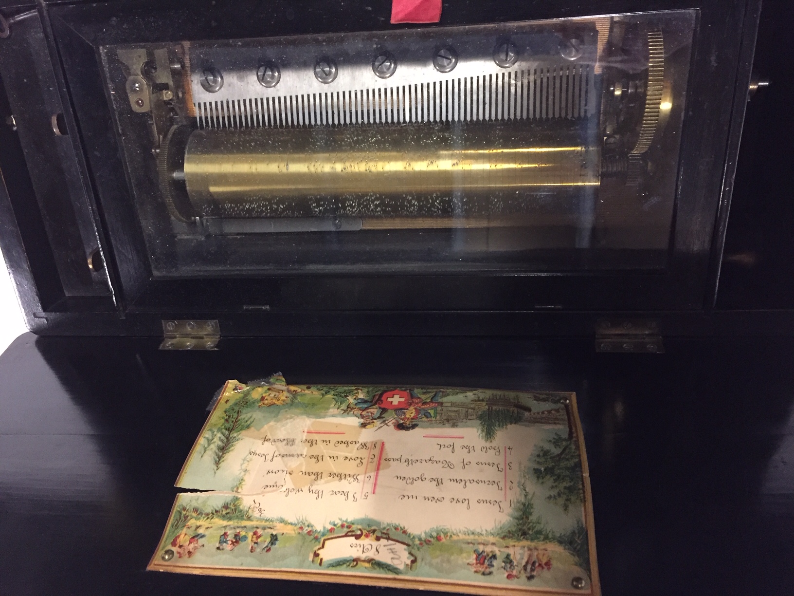 Caisse en bois noirci et plaquage de bois exotique. Boite à musique à cylindre jouant huit airs. En état de marche. Rayures, chocs et manques de plaquage 48 X 21 X 14 cm