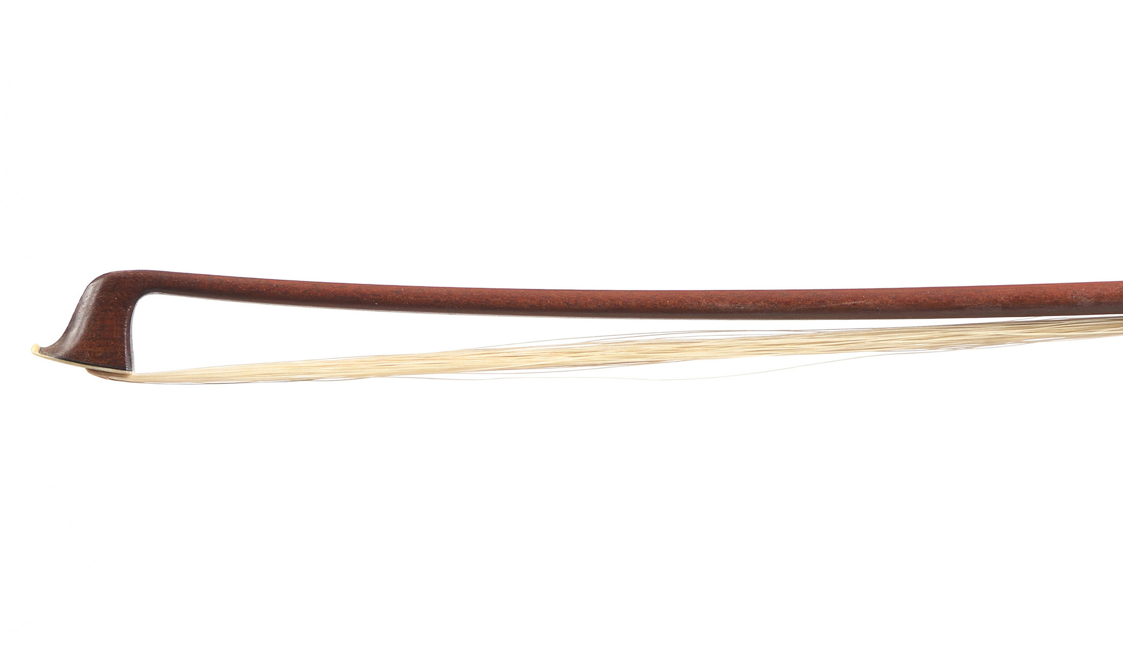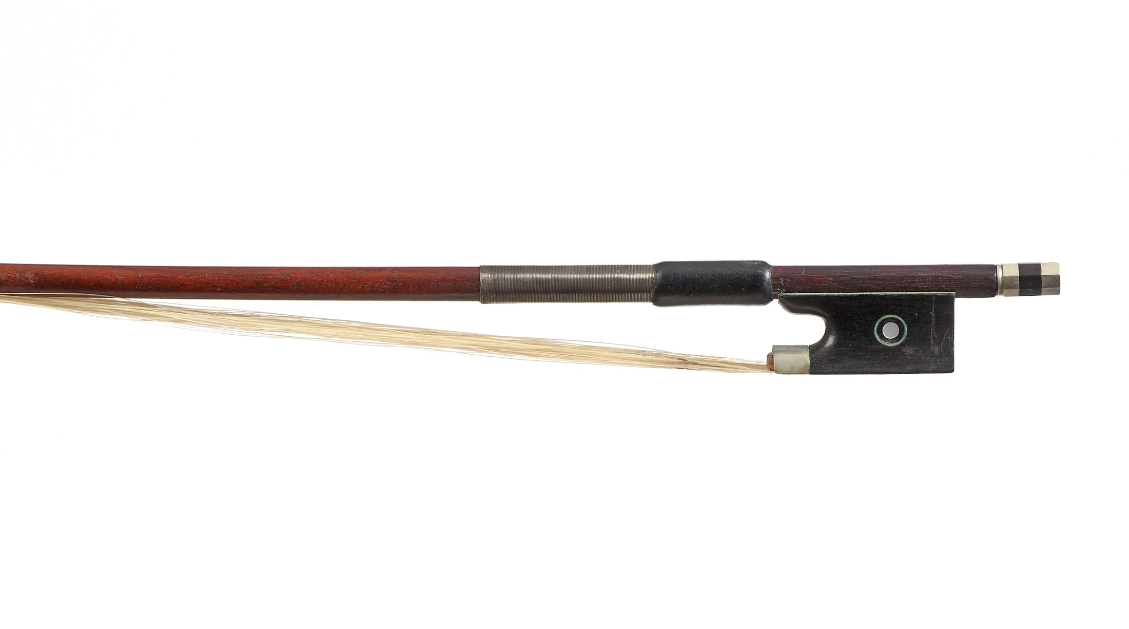 Baguette en pernambouc. Hausse ébène montée maillechort. Portant une marque au fer "PARIS". Petite marque à la tête. 735 mm. 62 g. Une petite cassure au pan.