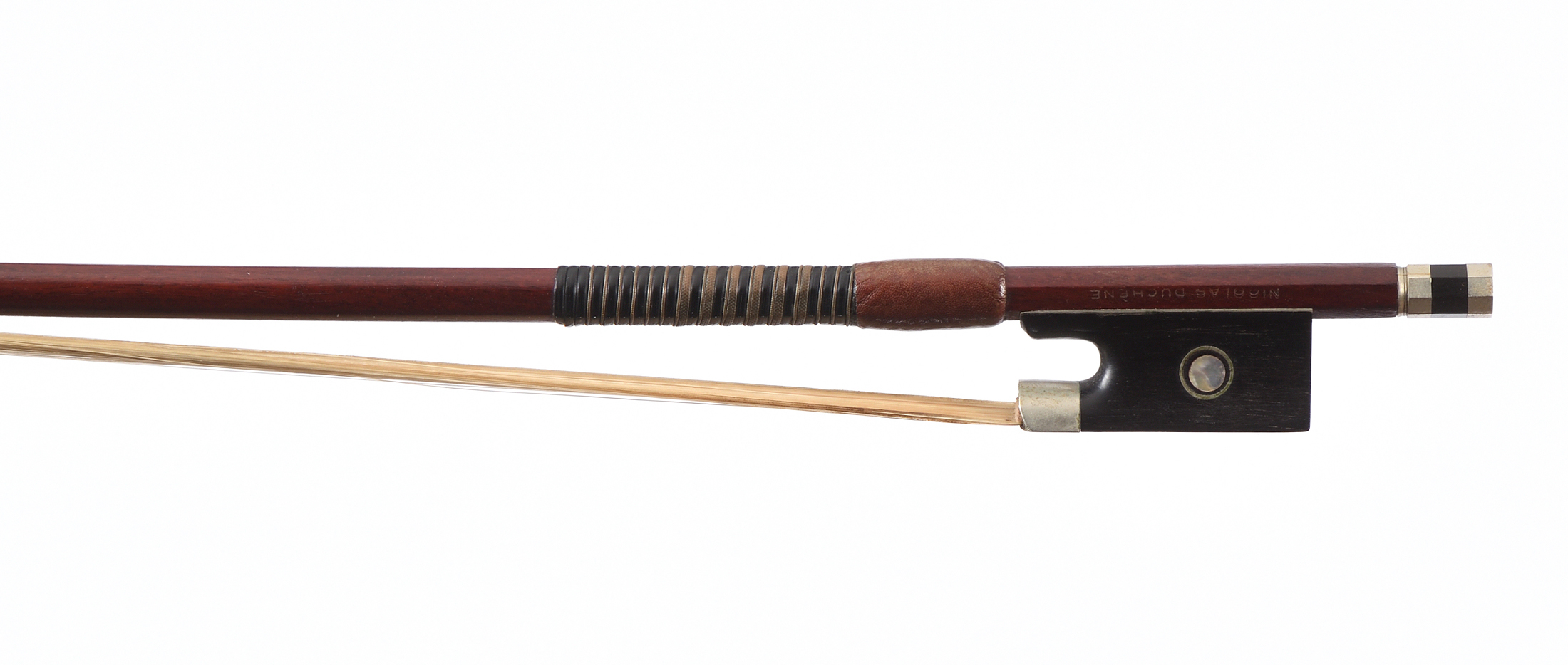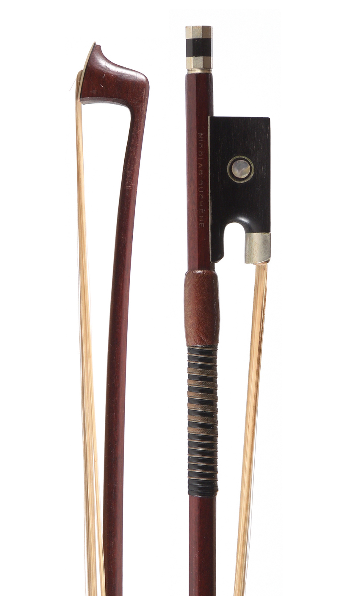 portant une marque au fer "NICOLAS DUCHENE". Baguette ronde en bois de pernambouc. Hausse ébène montée maillechort, avec grain cerclé. 60,9 g. 722mm.