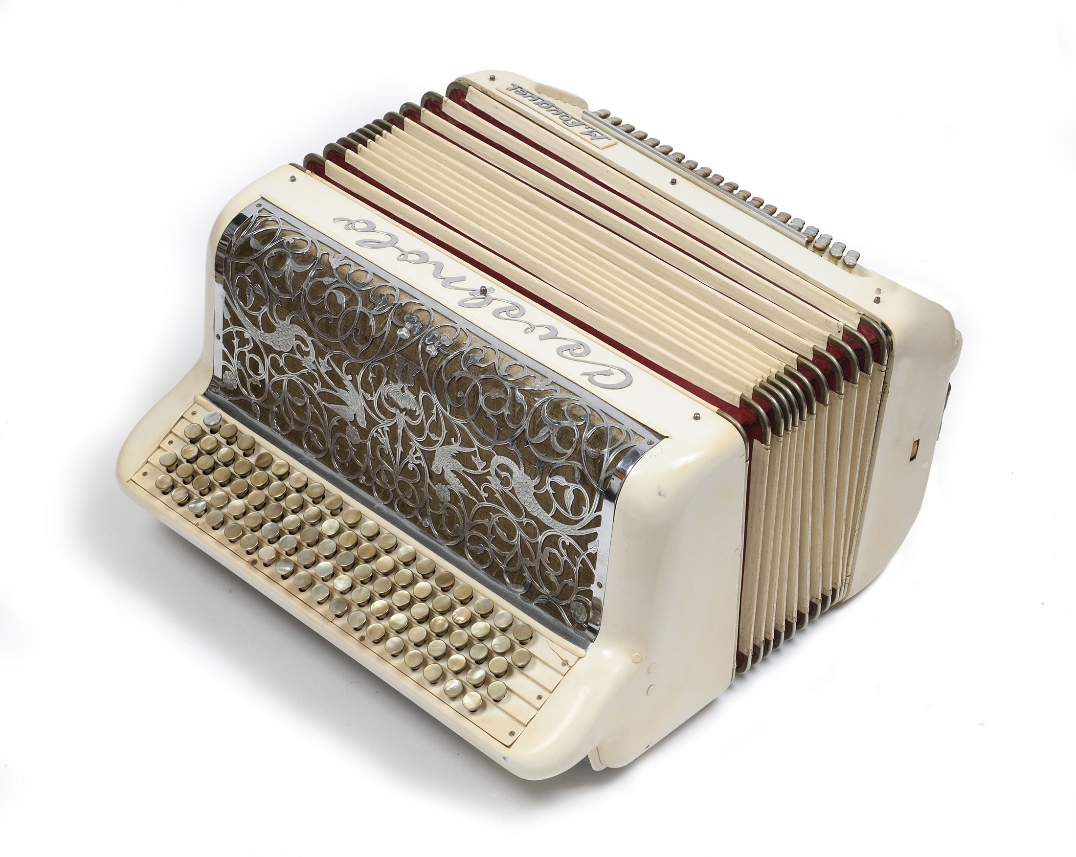 Fait à Lyon par CAVAGNOLO. A bouton. 6 rangées de basse, 5 rangées d'aigue. En bakélite blanc. Bouton en nacre. L'ensemble à restaurer. Avec boite.