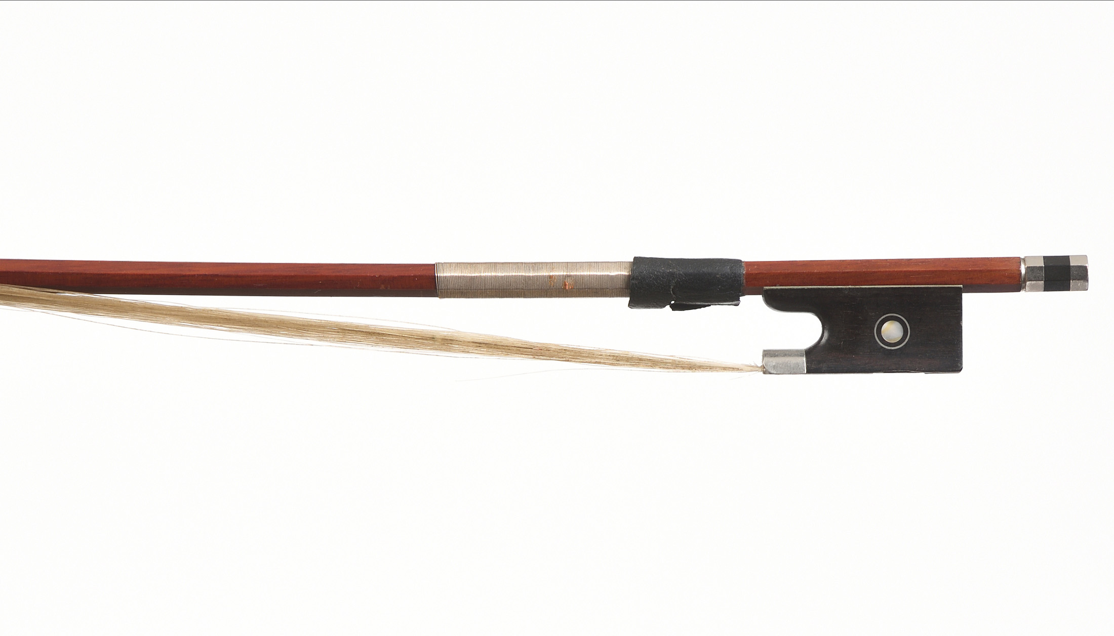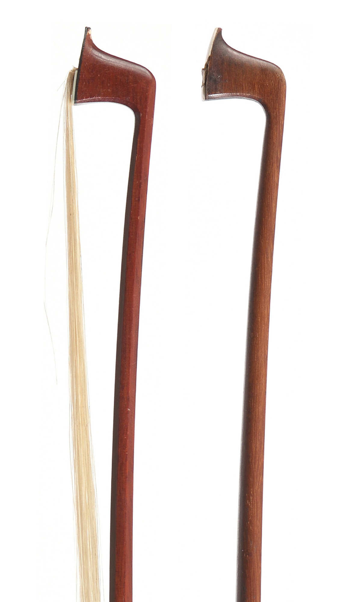 Deux archets de violon dont un fait à Mirecourt. Une Baguette en pernambouc.