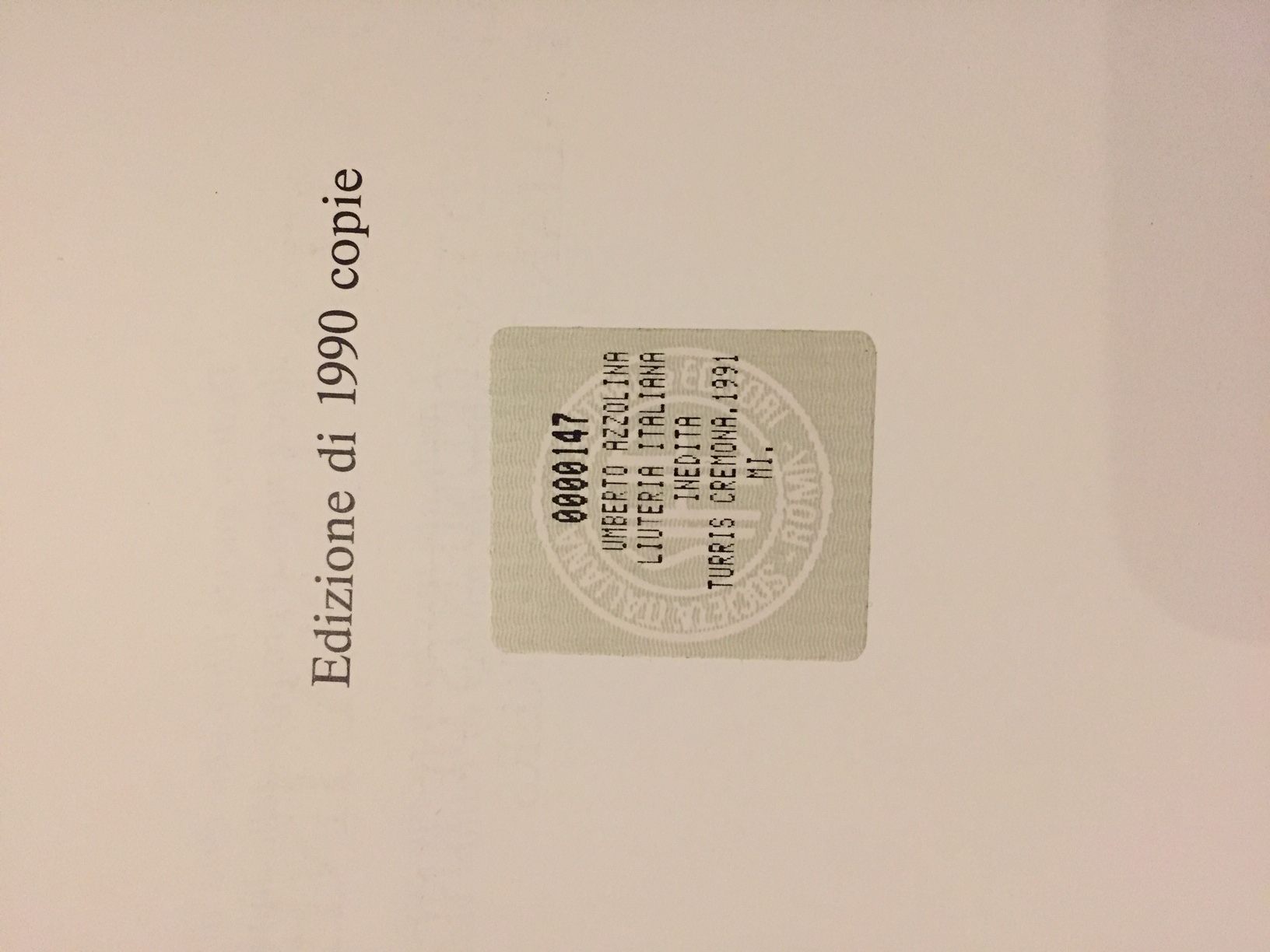 Umberto azzolina. Liuteria Azzolina. Unpublished Instruments of Known Italian violin makers. Editrice Turris Cremona. Edizione di 1990 copie. 0000147. Perfect condition. Parfait état.