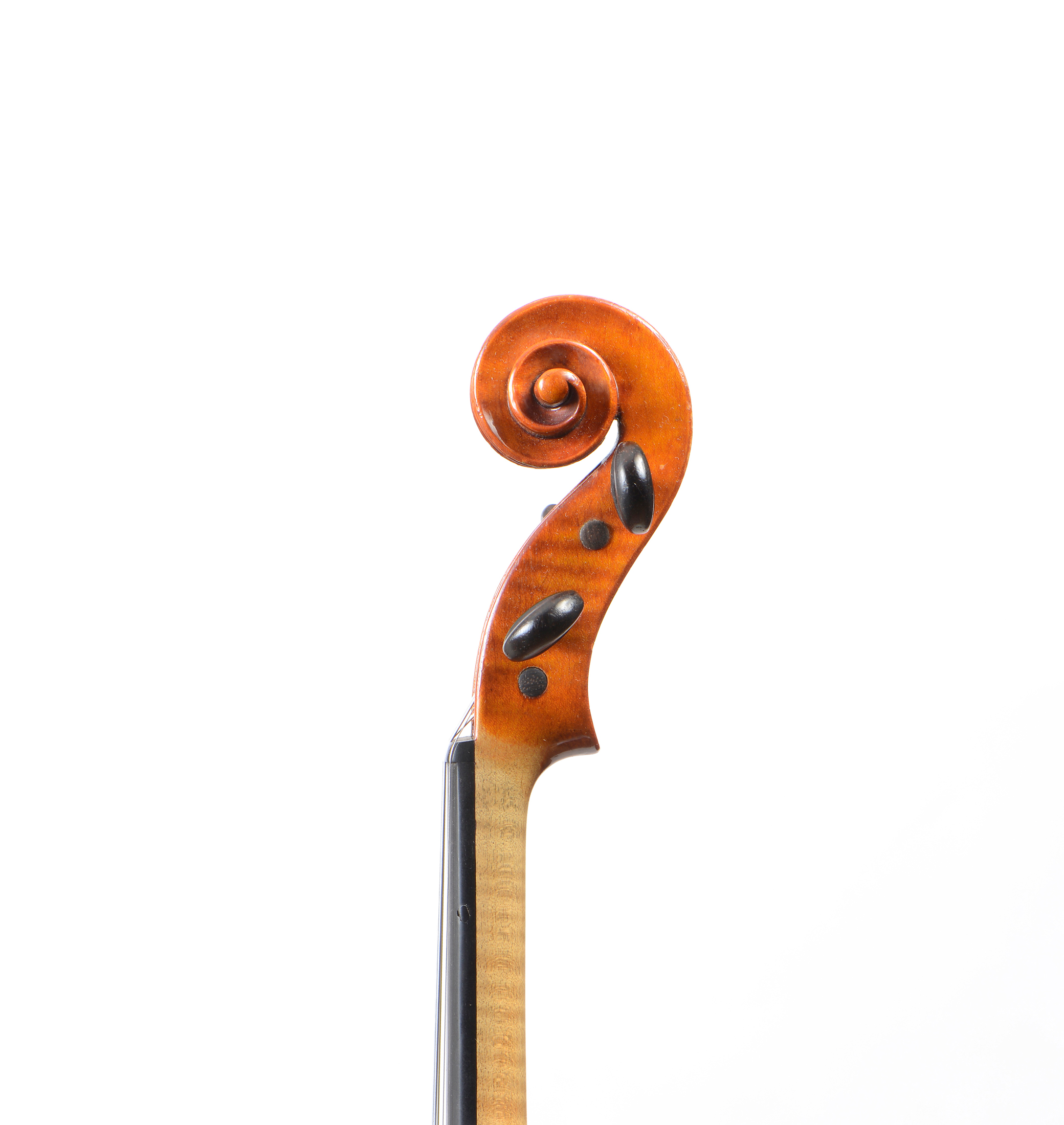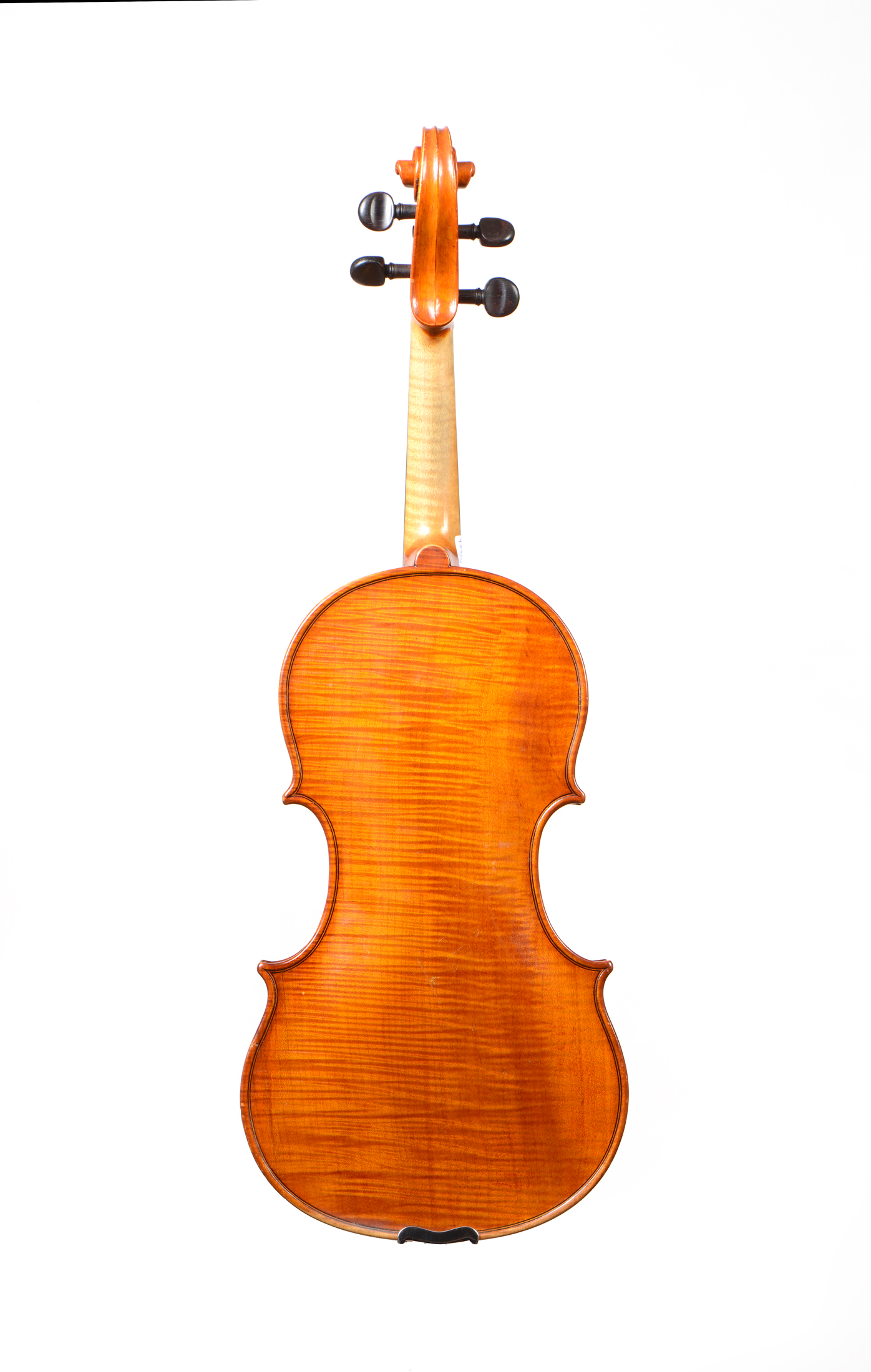 portant uen étiquette ainsi la marque au fer originale. Fond d'une pièce d'un érable aux ondes fines légèrement maillées. Eclisses et tête du même bois. Vernis orangé brun sur fond doré. 359 mm.
