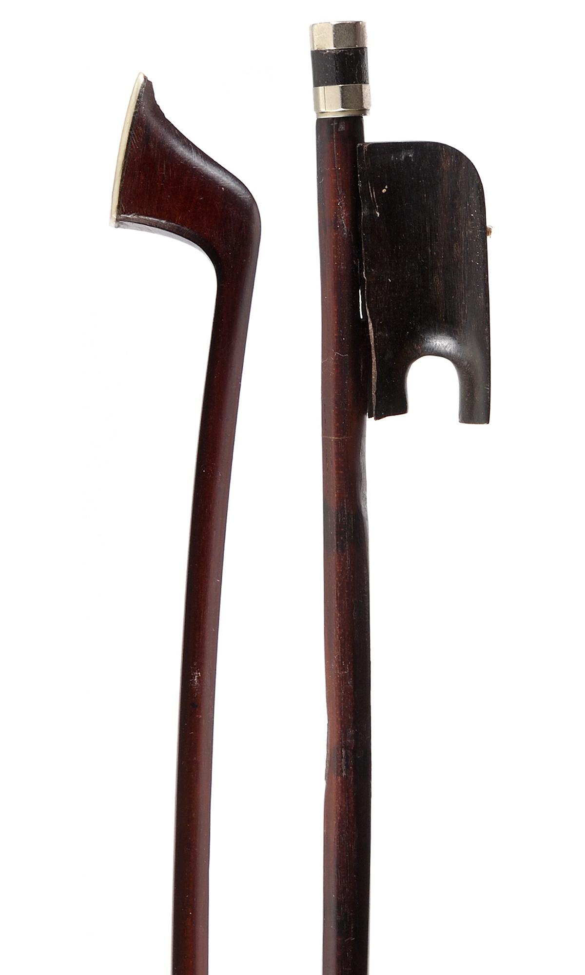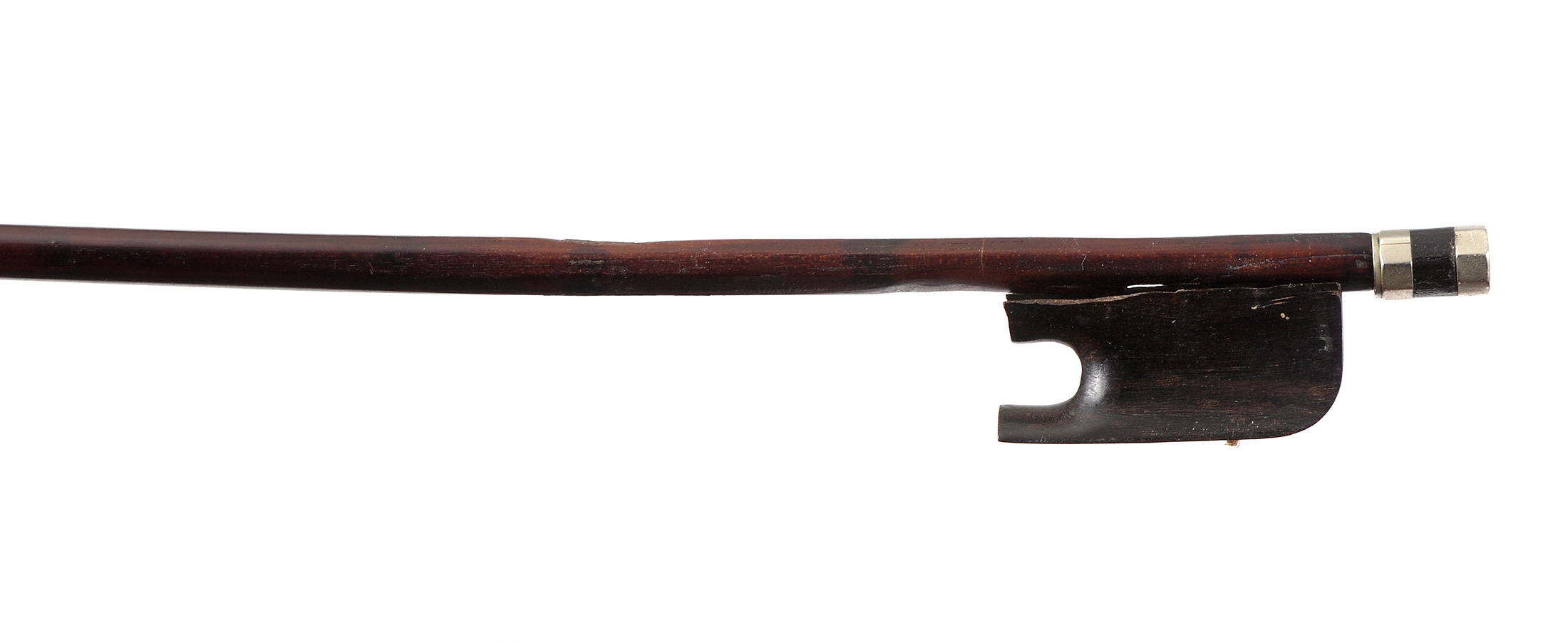 Archet Français du XIXe. Hausse probablement SIMON, à restaurer. Baguette ronde en beau bois de pernambouc. Usure au pan. Hausse ouverte en ébène dans le style de SIMON. Cassure au pan. L'ensemble est à restaurer. 684 mm. 63,5 g sans mèche, ni garniture.