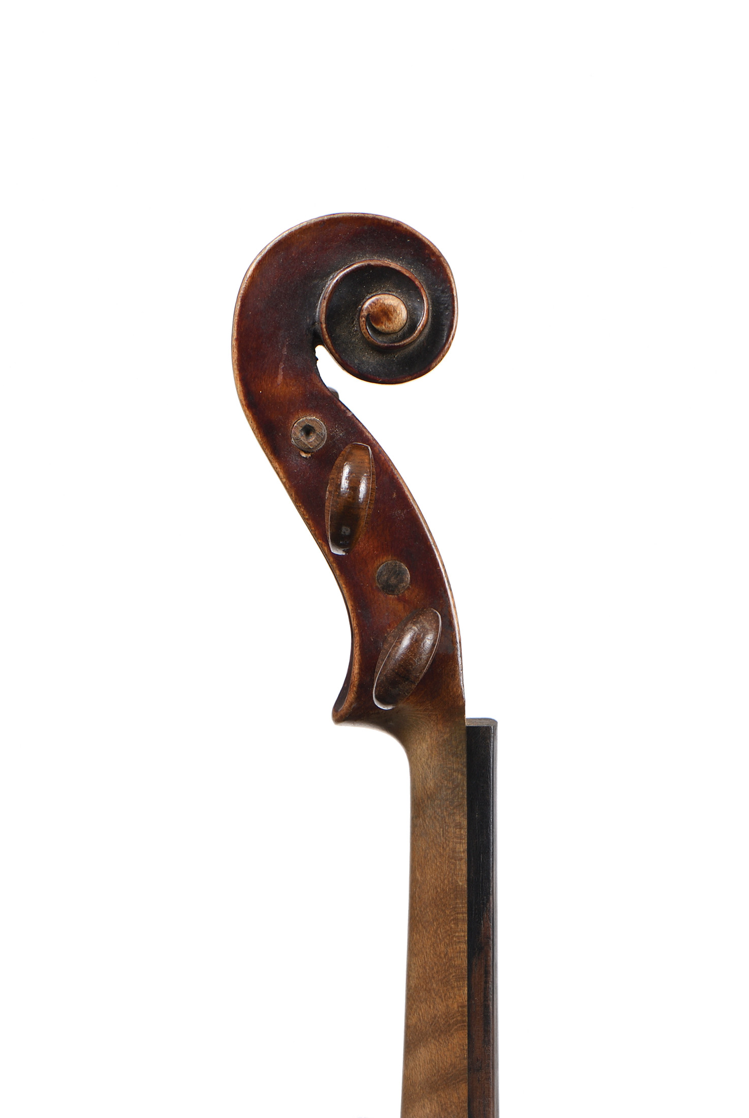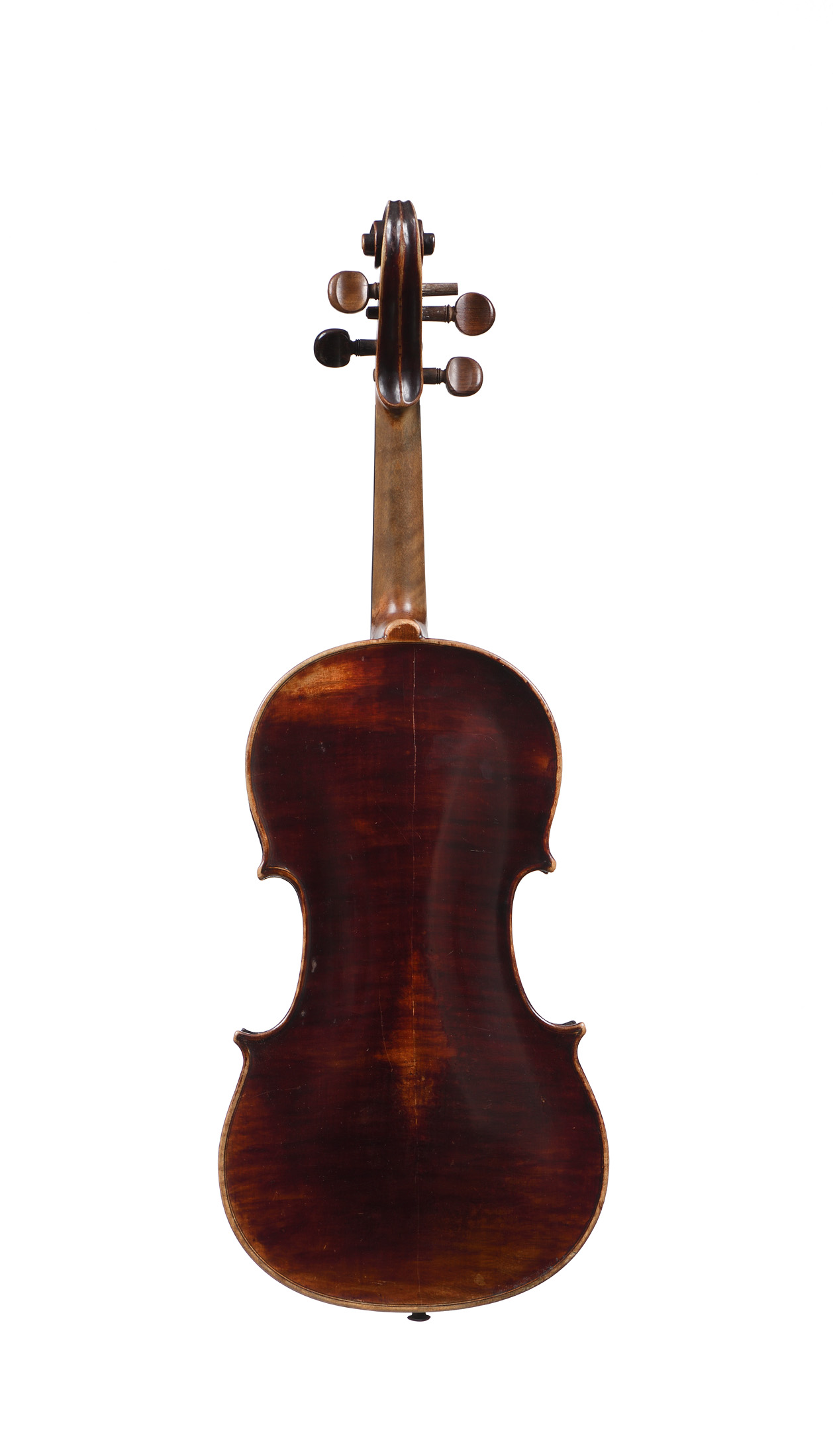 portant une étiquette illisible. Fait en copie d'Italien. Fond de deux pièces en bel érable. Vernis brun rouge sur fond doré.359 mm.