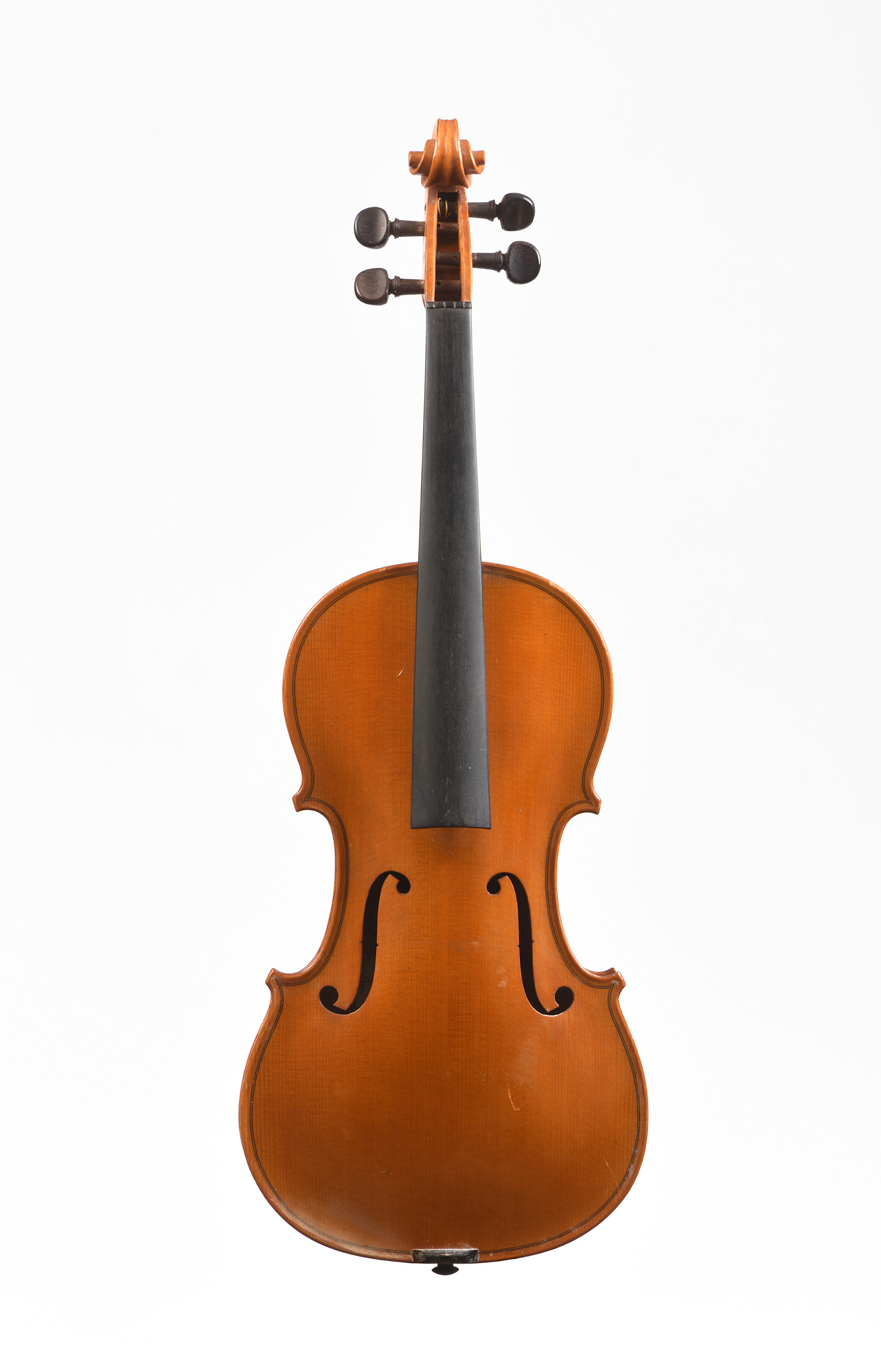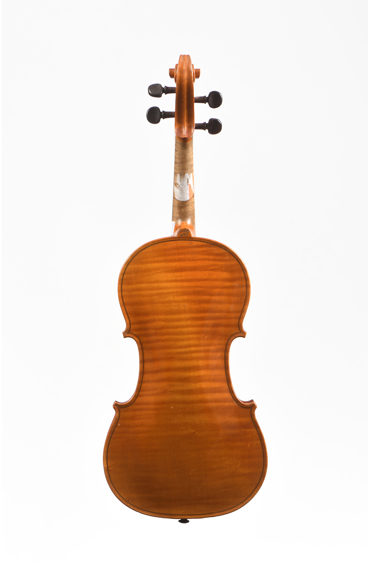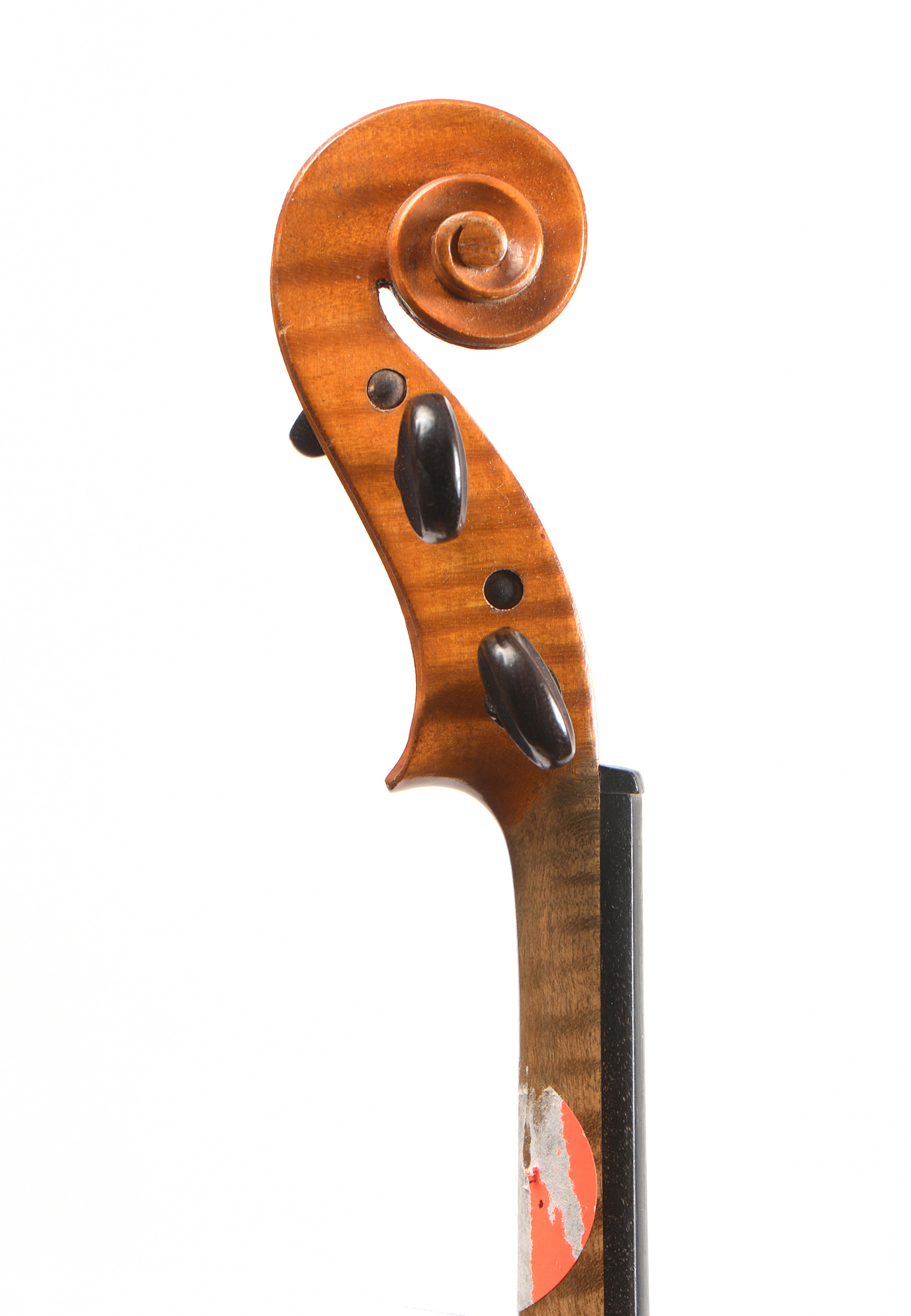 portant une étiquette "F.BRETON breveté... de SMG... A Mirecourt 1831" et la marque au fer au talon du manche. Vernis brun doré. Fond d'une pièce en bel érable. 360 mm. Bon état général.