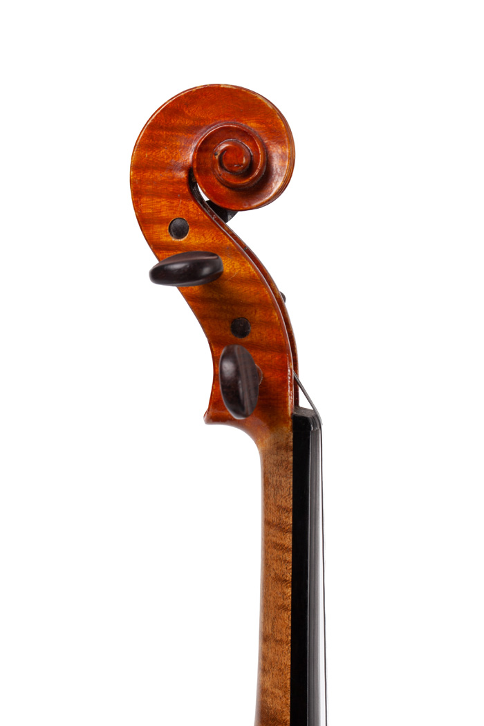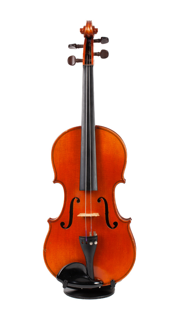 portant une étiquette "Modèle d'après Antonius Stradivarius... 1721". Fond de deux pièces en érable. Vernis brun doré. 359 mm. Avec boite et archet.
