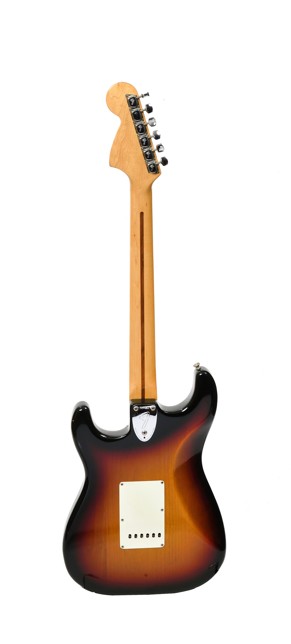 Stratocater de 1973. Custom Body. Made in USA. Numéros de série: 514127. Avec accastillage et électroniques d'origine. Sunburst. Avec étui FENDER d'origine et tige de vibrato. Usures.