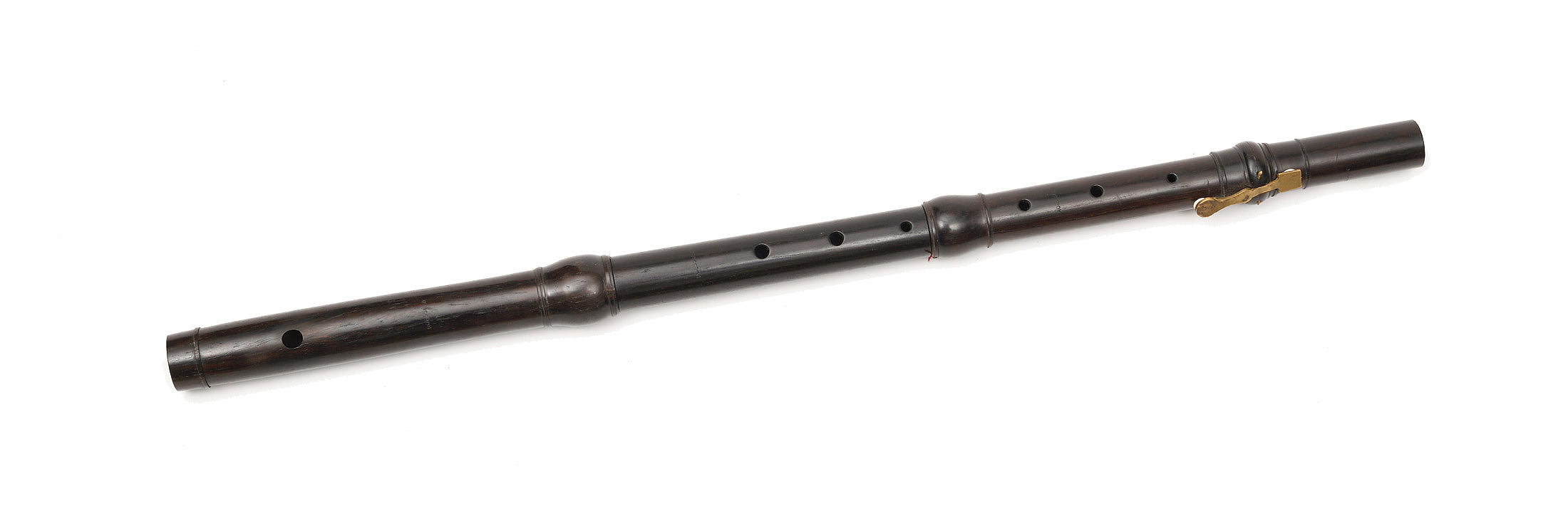 Portant la marque ROESSLER. Flûte Baroque en ébène. une carré clef en laiton. Diapason 415 Hz. Deux fentes réparées.