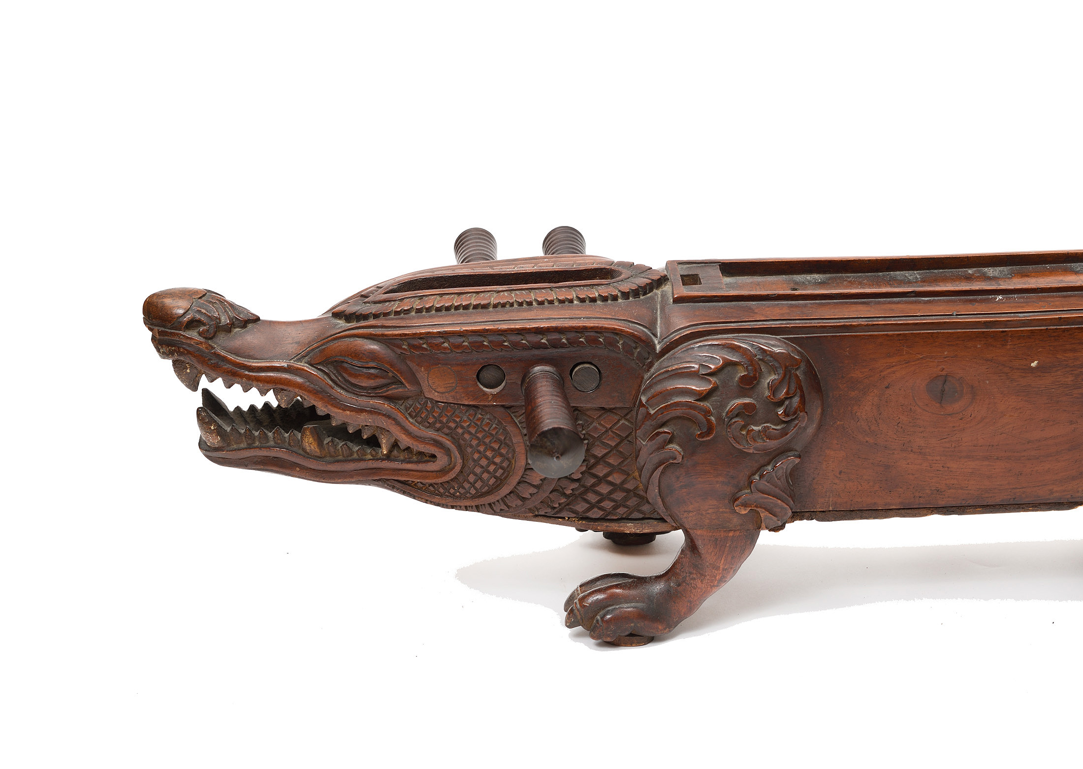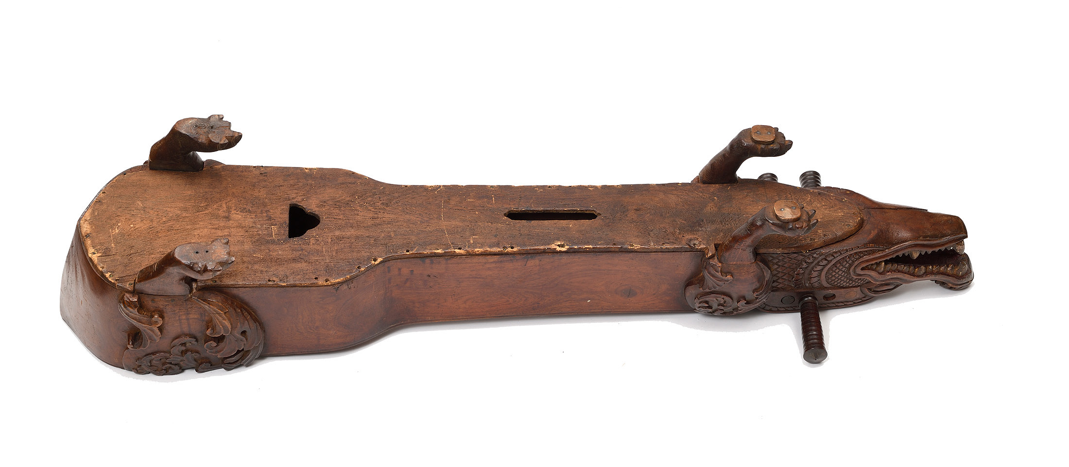 probablement Thailandais. Cithare d'Asie du Sud Est, en forme de crocodile stylisé. Tête et quatre pieds sculptés. Trois chevilles. Diverses cassures. L'ensemble en bon état de conservation.