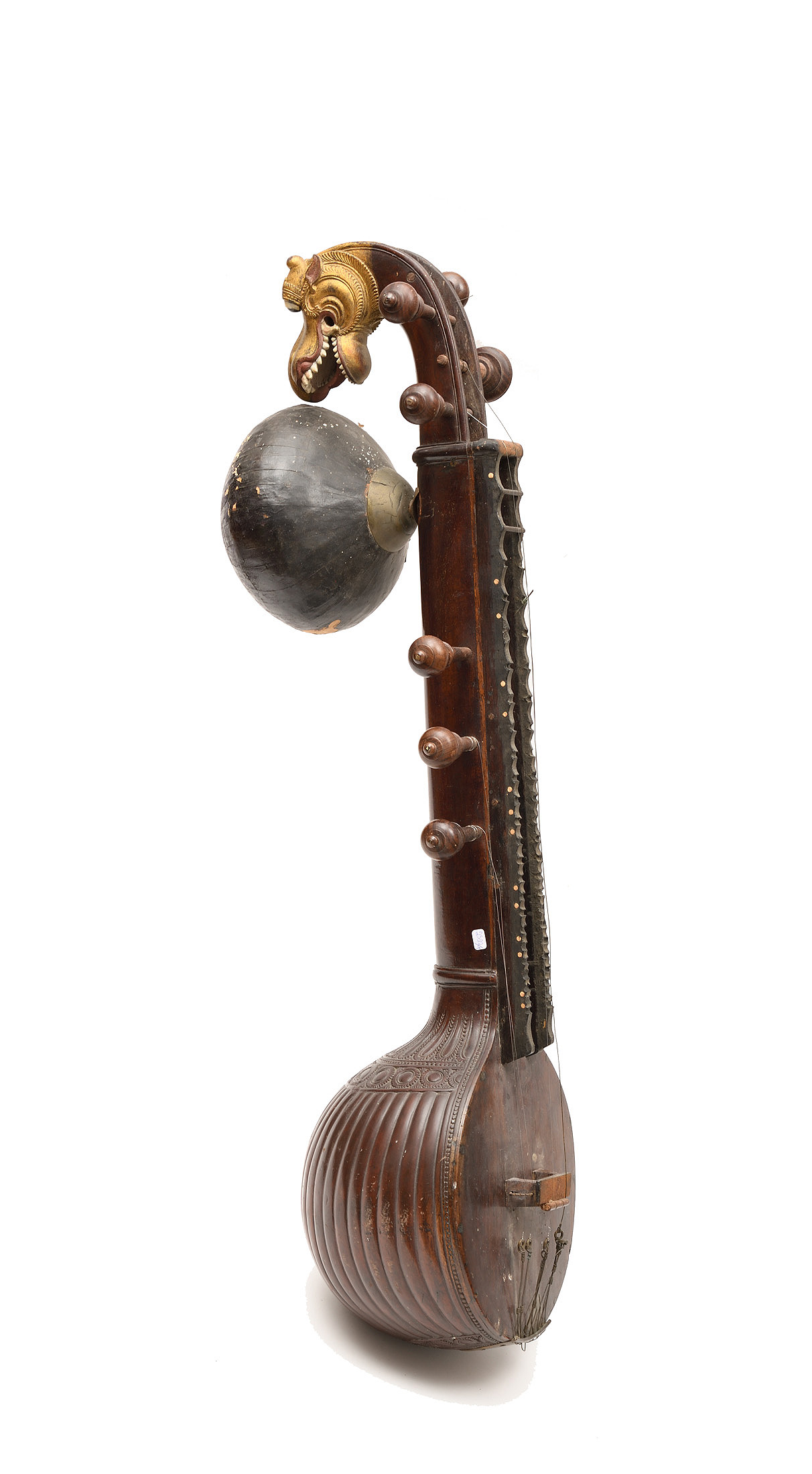 Intéressant luth ancien Indien "Vînâ Saraswati", portant le nom de la déesse hindoue Saraswati. Tête sculptée d'un dragon. Caisse sculptée en calebasse. L'ensemble est à restaurer. Avec résonateur abimé.