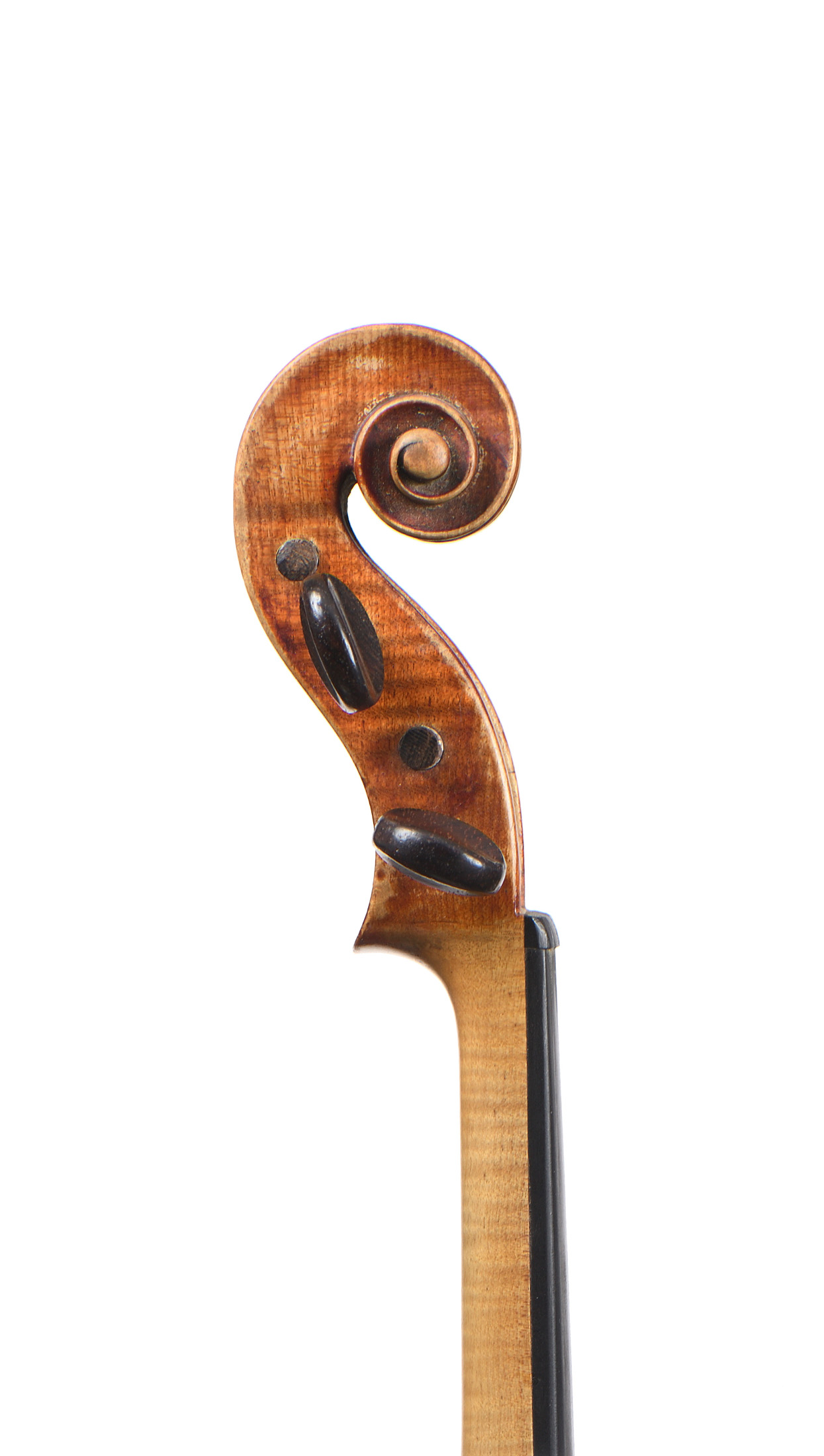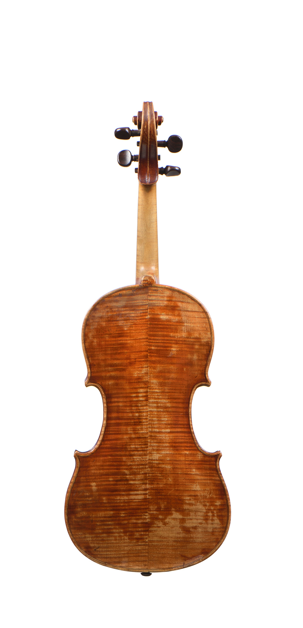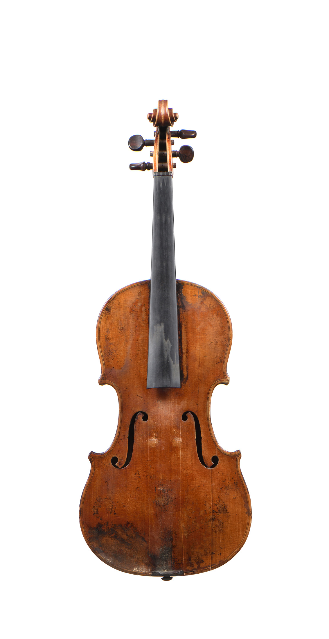 Beau violon Français portant une étiquette de "Joannes Baptista Guadagnini 1775". Fond de deux pièces en érable aux ondes moyennes et régulières. Table en épicéa aux pores serrés et irréguliers. Diverses cassures de table. L'ensemble est à restaurer. 361 mm.