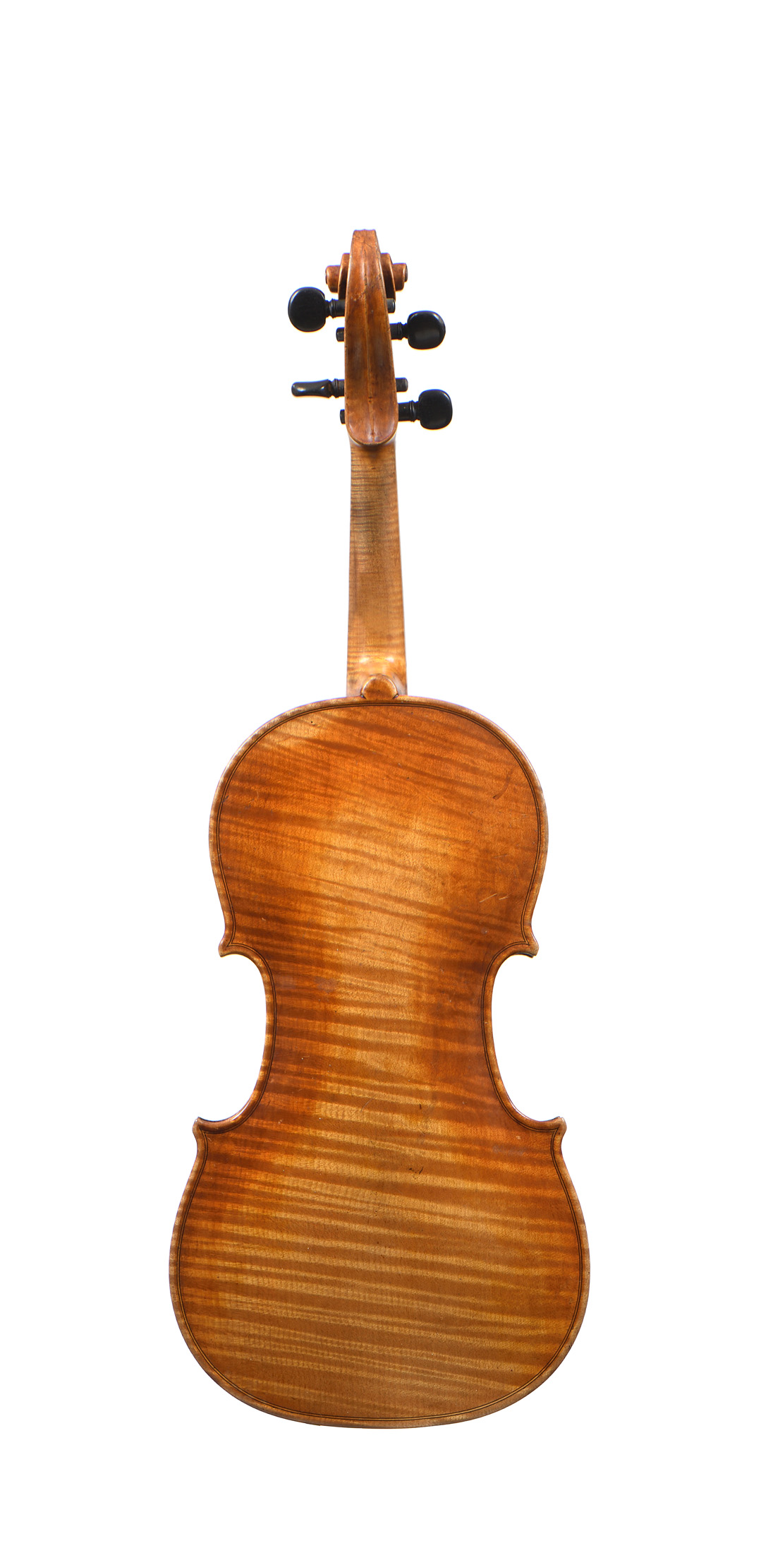 dont il porte l'étiquette originale "Franciscus Maria Pupunatus fecit Lausannae..." et le tampon FMP. Fond d'une pièce en bel érable flammé aux ondes régulières. Table en épicéa moyennement serré au centre s'élargissant sur les bords. 362 mm. Vernis brun miel sur fond doré. Bon état général.