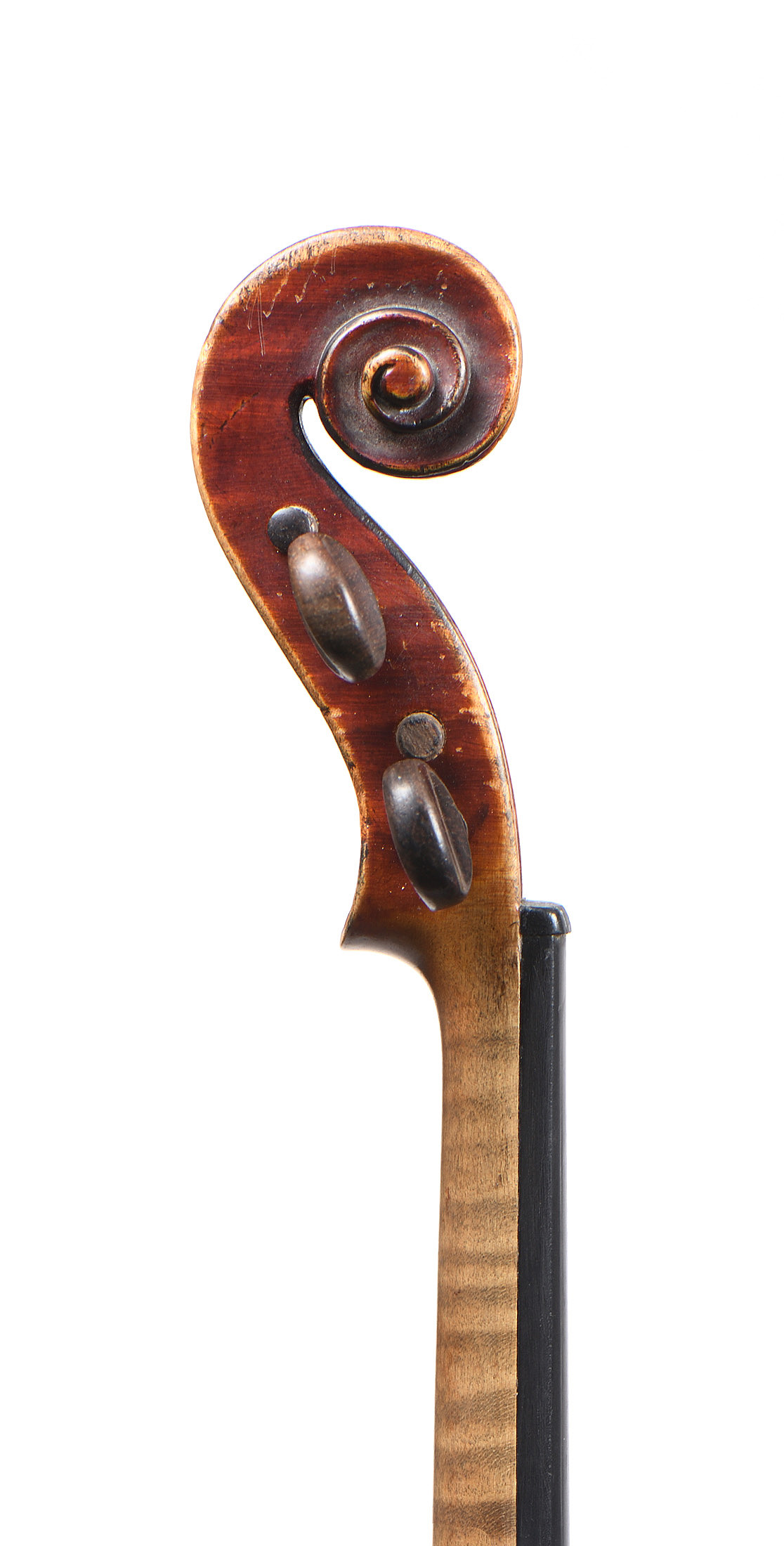 portant une étiquette Nicolas ANTONY, et la marque au fer sur le tasseau du manche "JD". Fond de deux pièces en bel érable aux onde régulières. Vernis brun rouge sur fond doré. 360 mm. Une cassure de table au sillet.