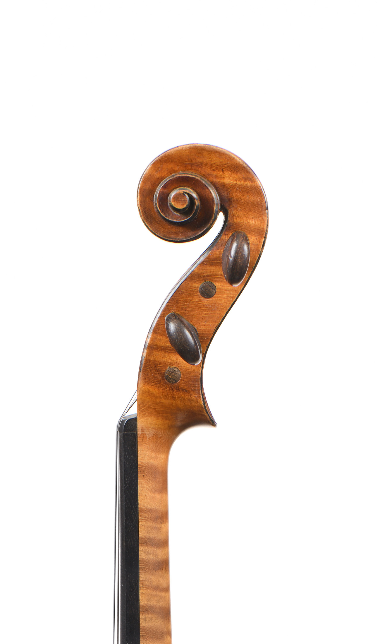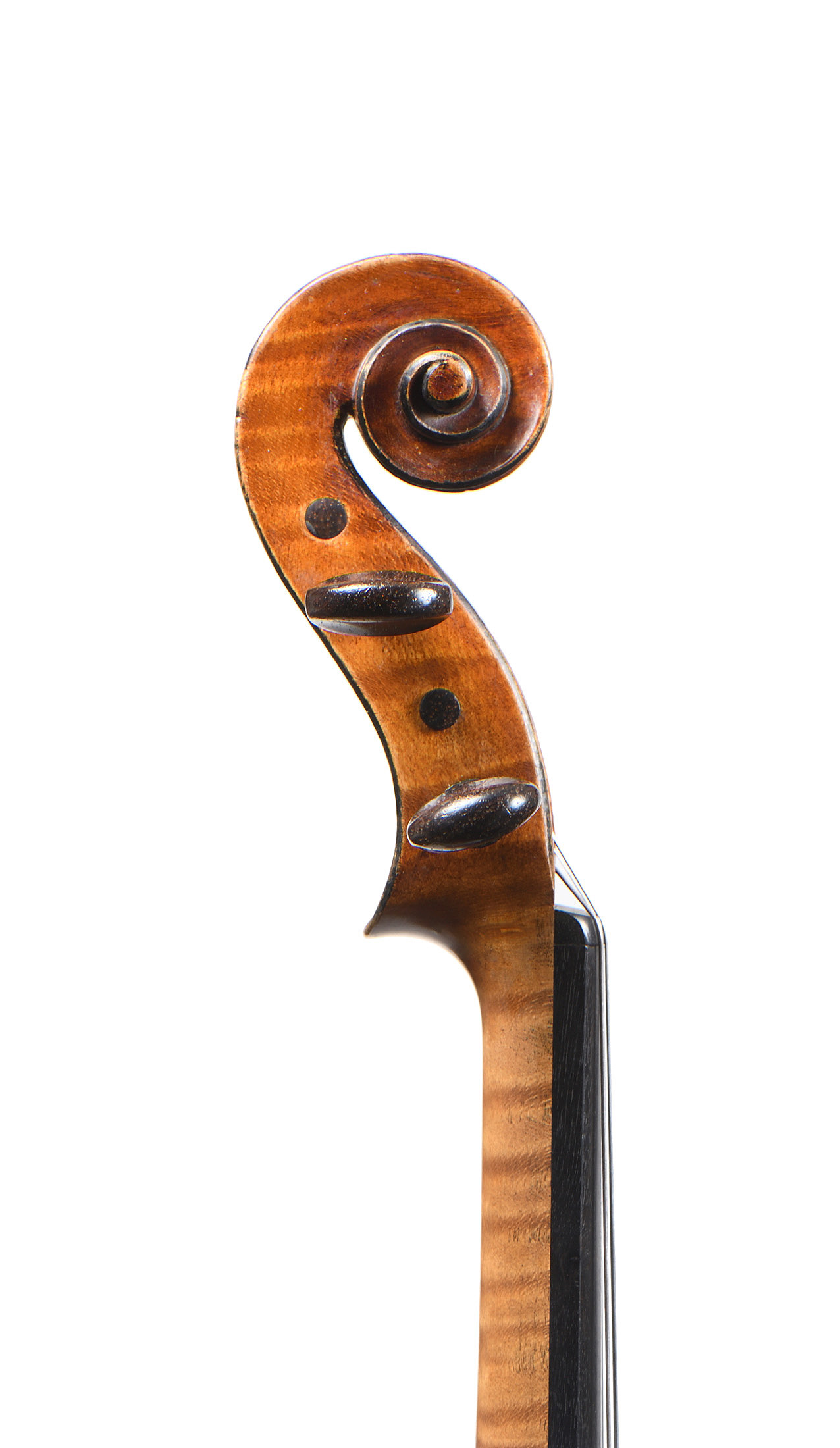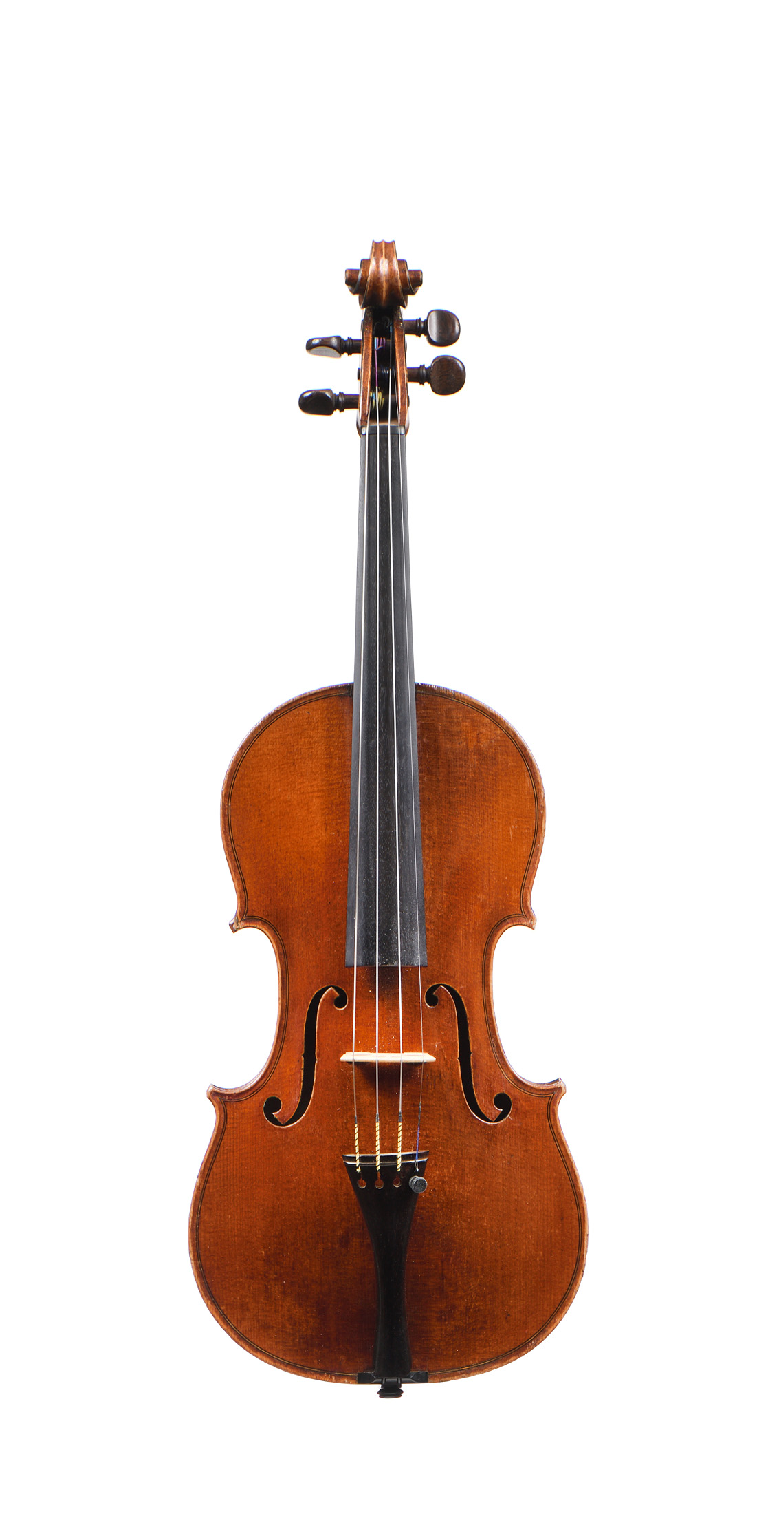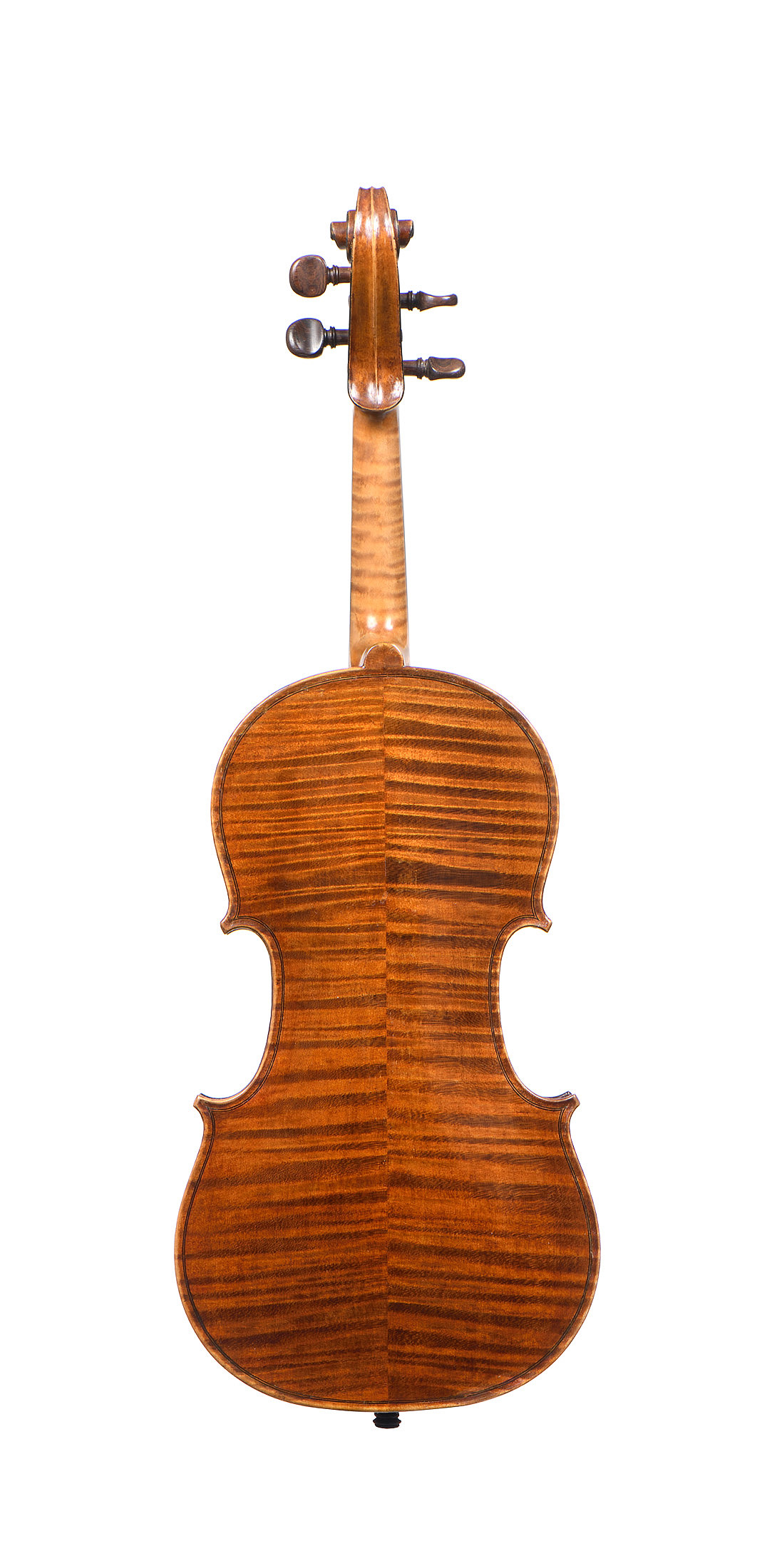 Très beau violon Anglais, probablement fait par HILL à Londres vers 1920. Fond de deux pièces en bel érable aux ondes régulières. Vernis brun/Miel sur fond doré. 355 mm.