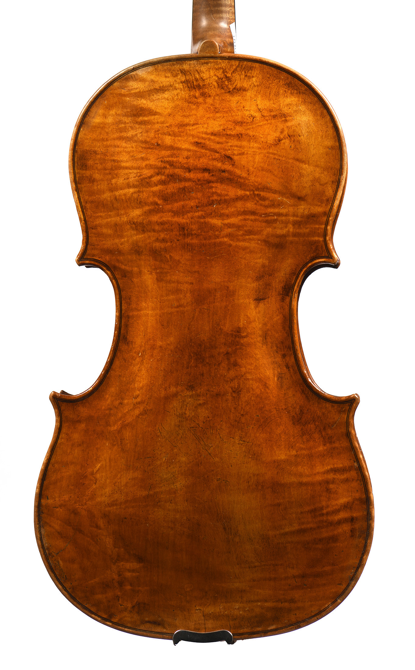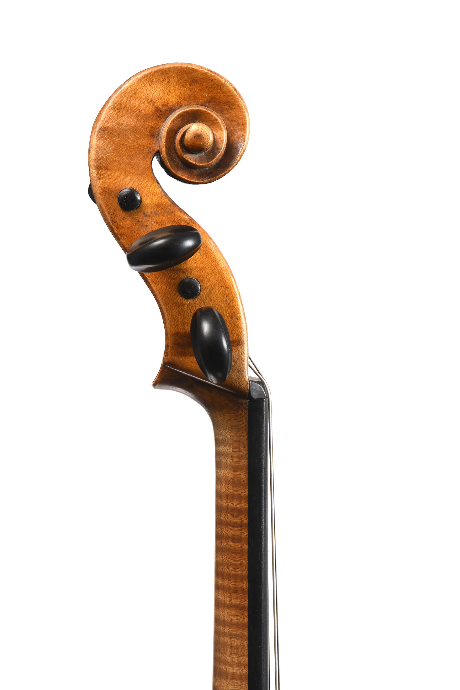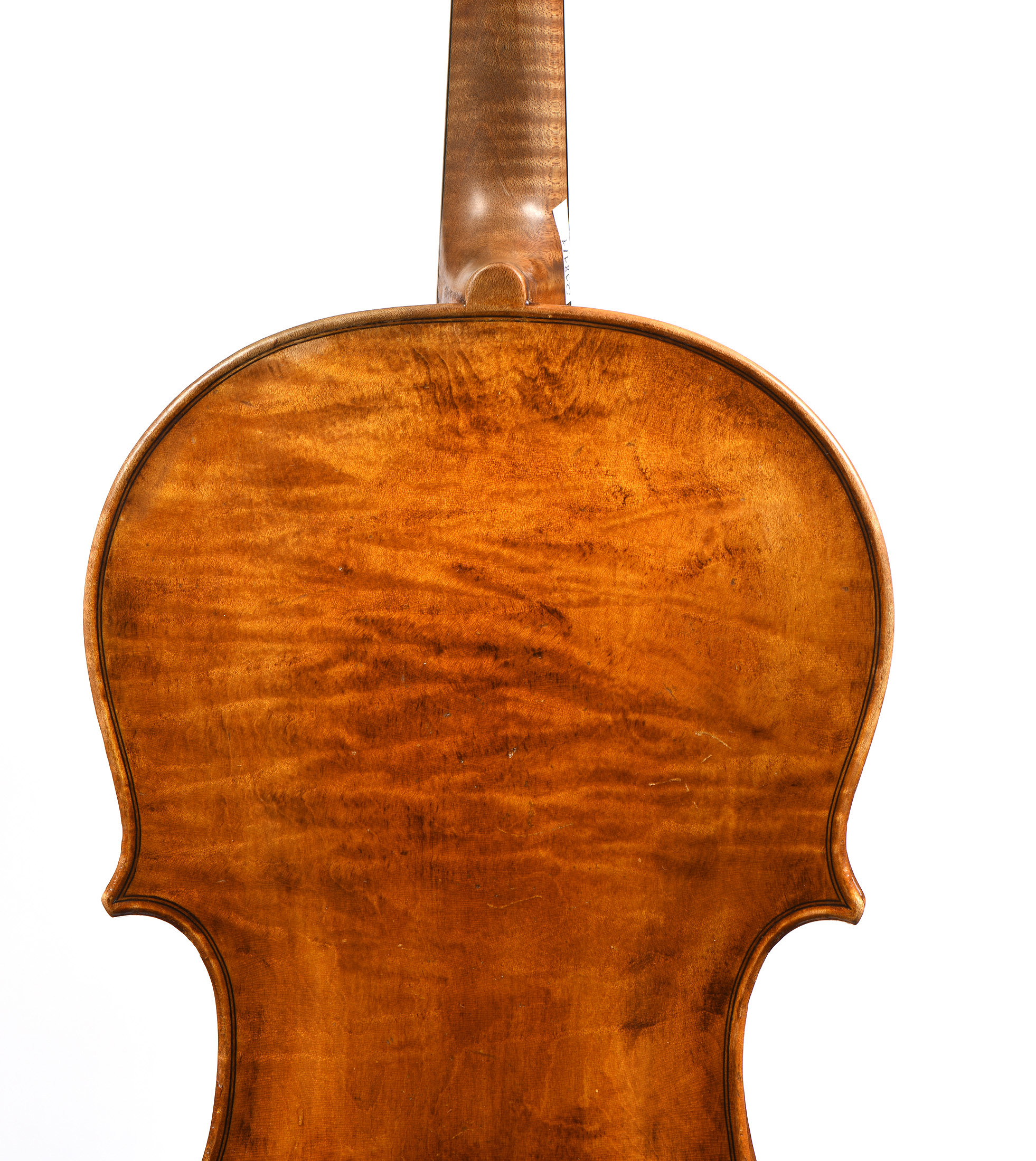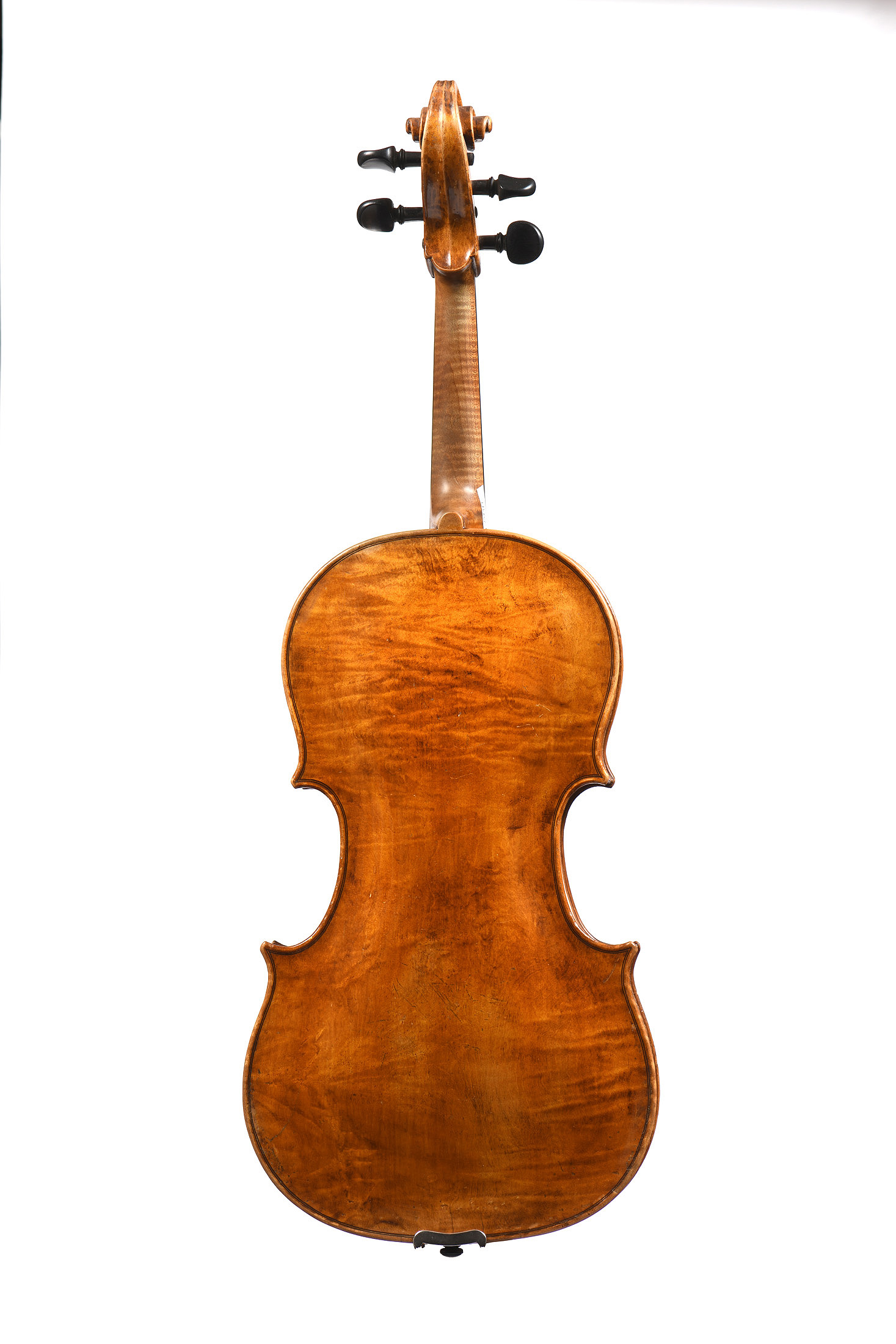 probablement de l'école Italienne, fait vers 1950. Portant une étiquette apocryphe "Leandro BISIACH della scuola Cremonese...". Beau fond d'une pièce d'un bel érable coupé sur couche. Vernis brun sur fond doré. 415 mm.