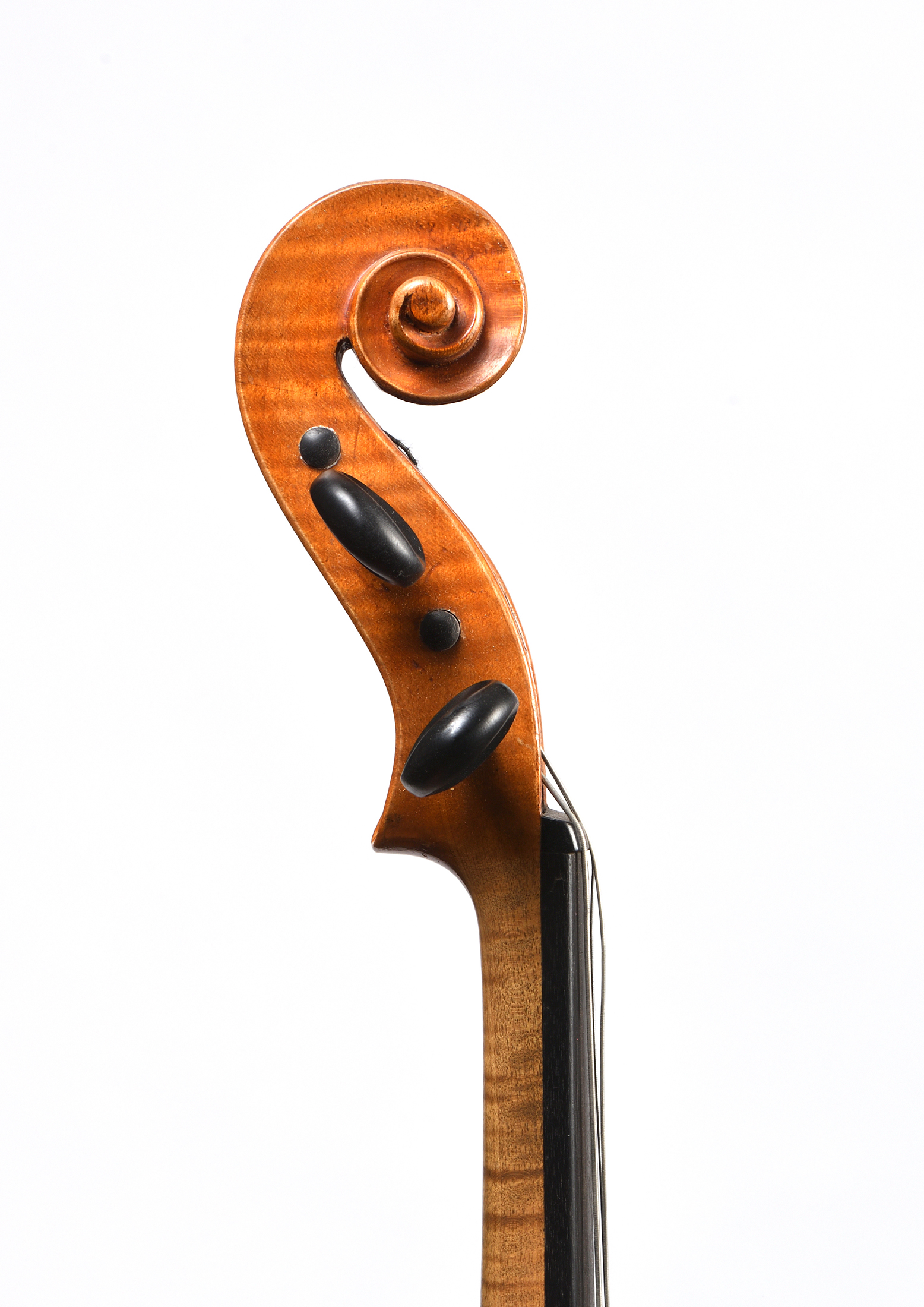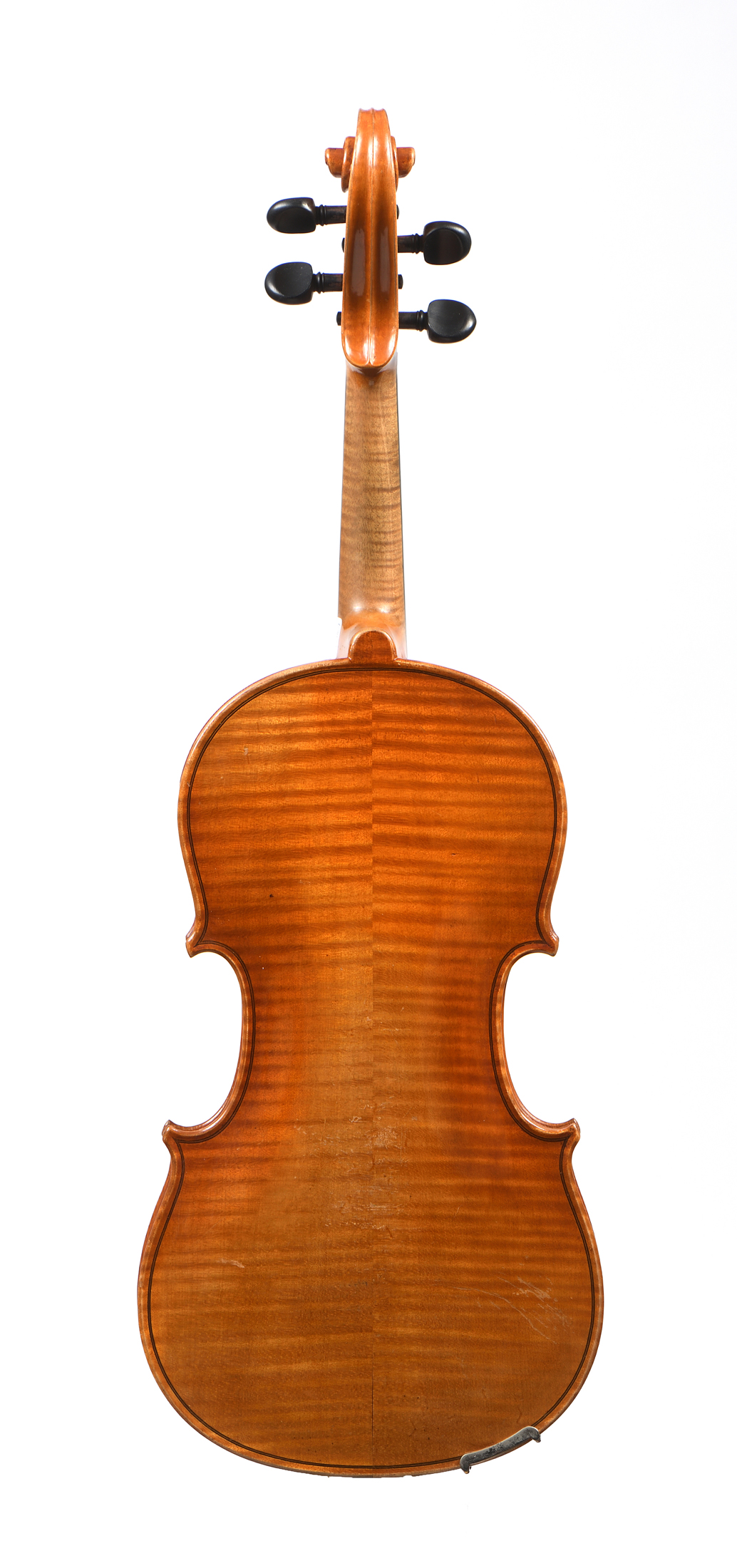 dont il porte l'étiquette au millésime de 1929, Fait à Budapest. Fond de deux pièces en bel érable. Vernis brun orangé sur fond doré. 390 mm.