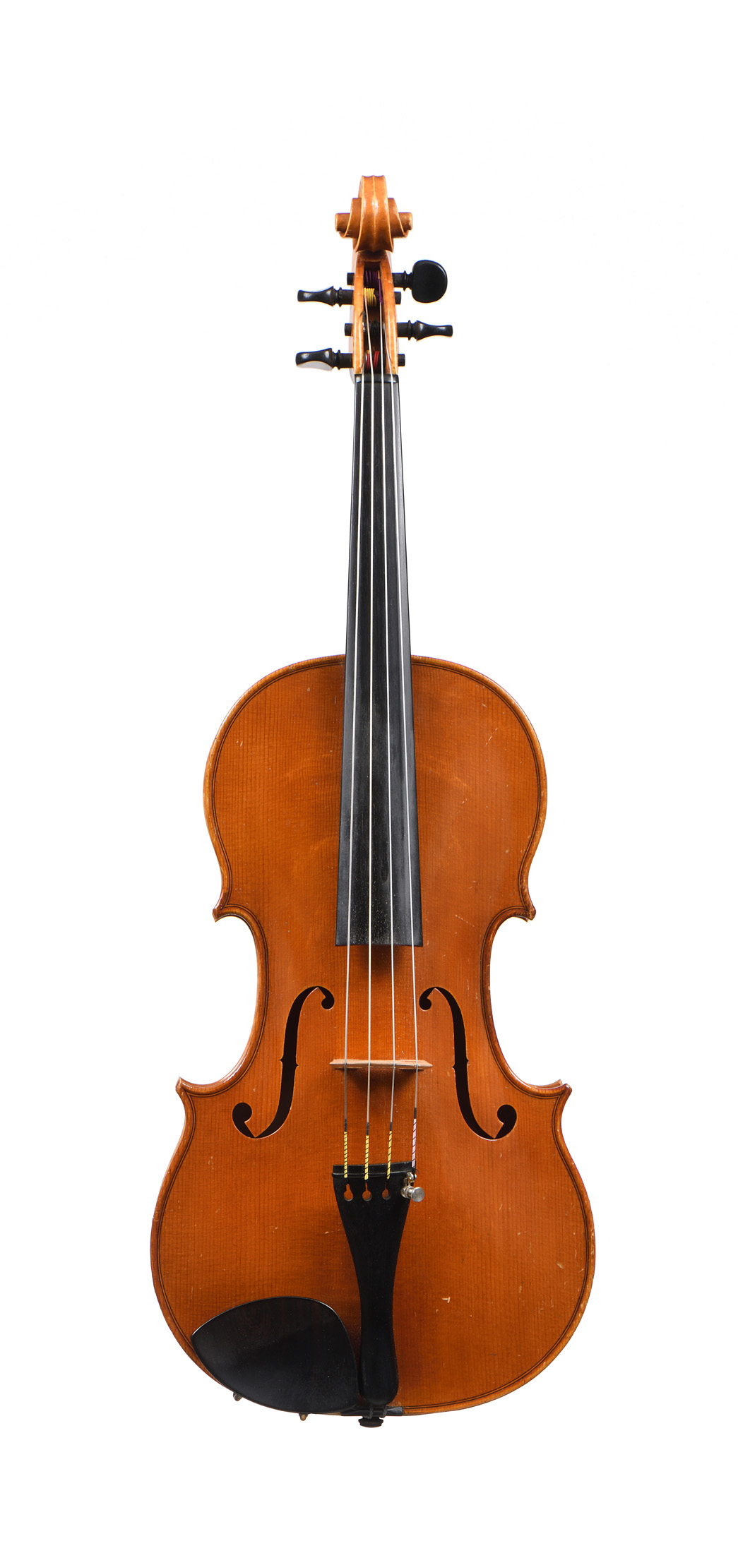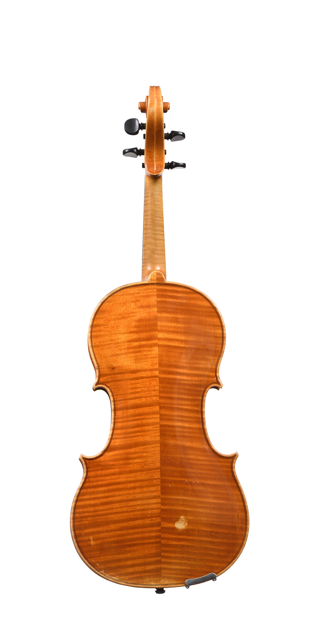dont il porte la marque au fer originale. Beau fond de deux pièces en érable. Eclisses et tête du même bois. Vernis brun doré. 410 mm.