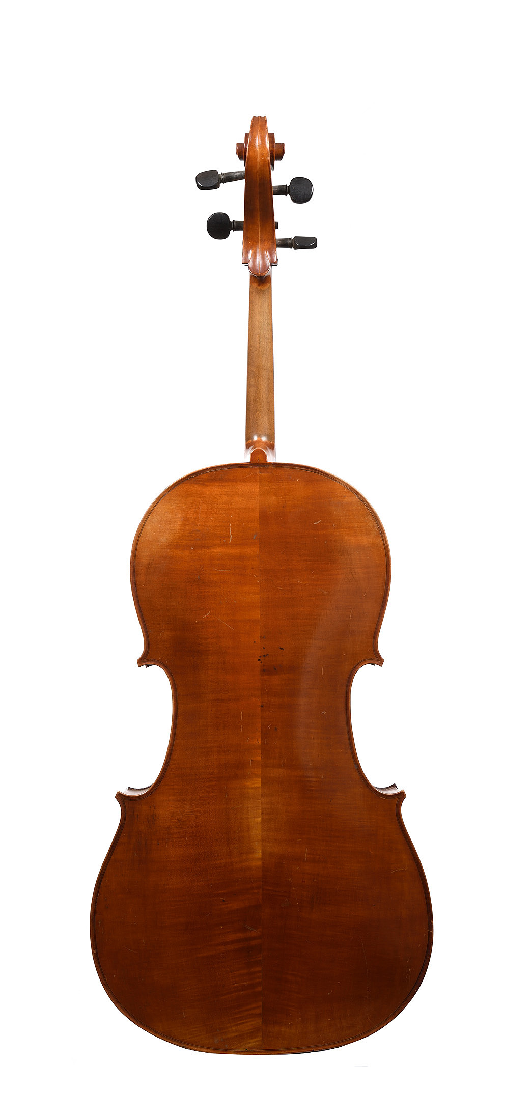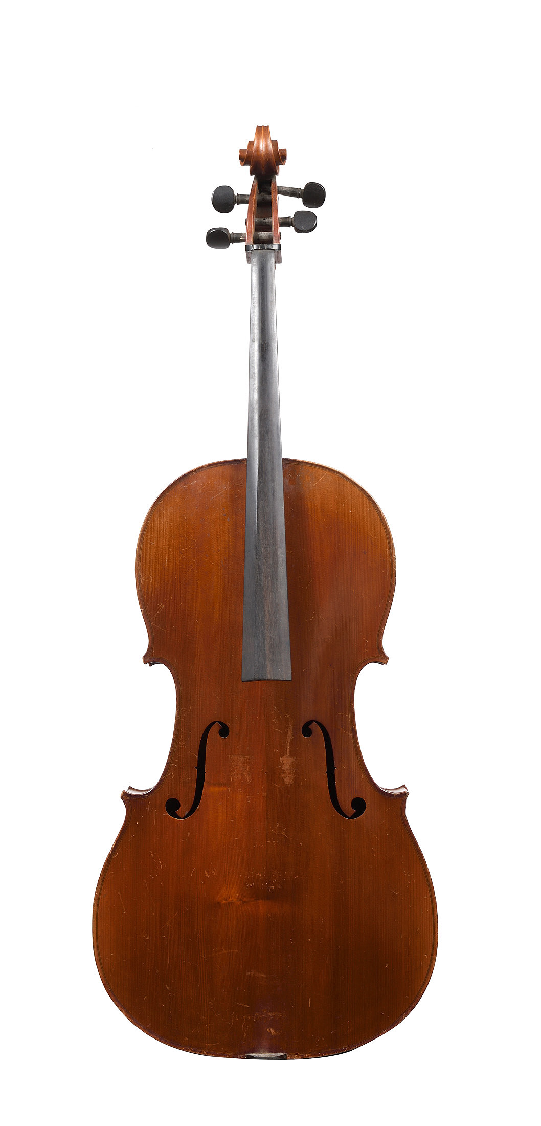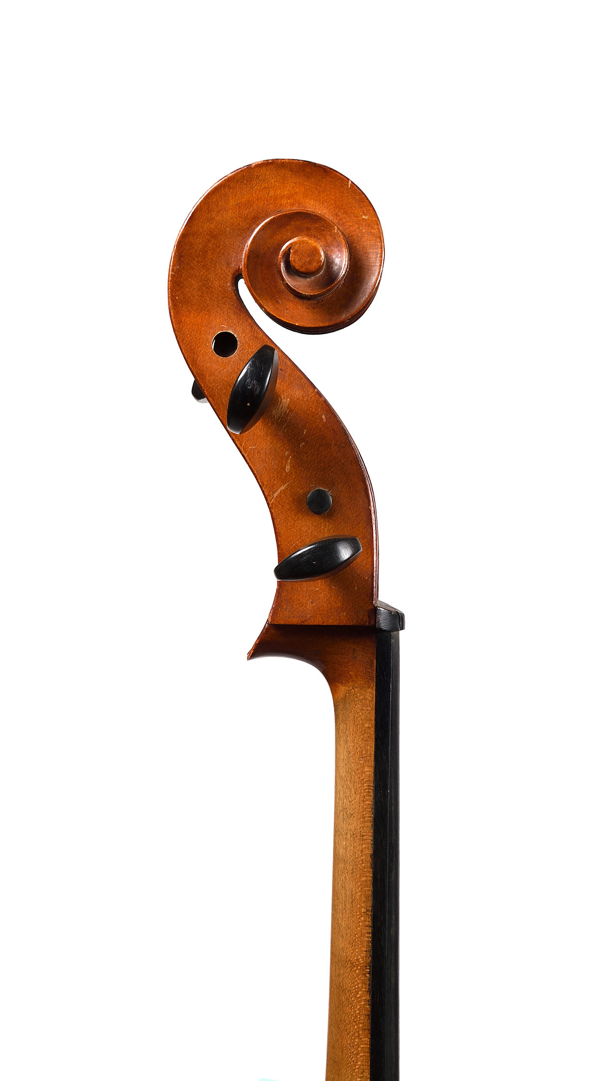 Fait à Mirecourt vers 1900, portant une étiquette "Copie de Antonius Stradivarius...1721". Fond de deux pièces en érable. Table en épicéa. Vernis brun orangé sur fond doré. Joint du fond à revoir. 760 mm.