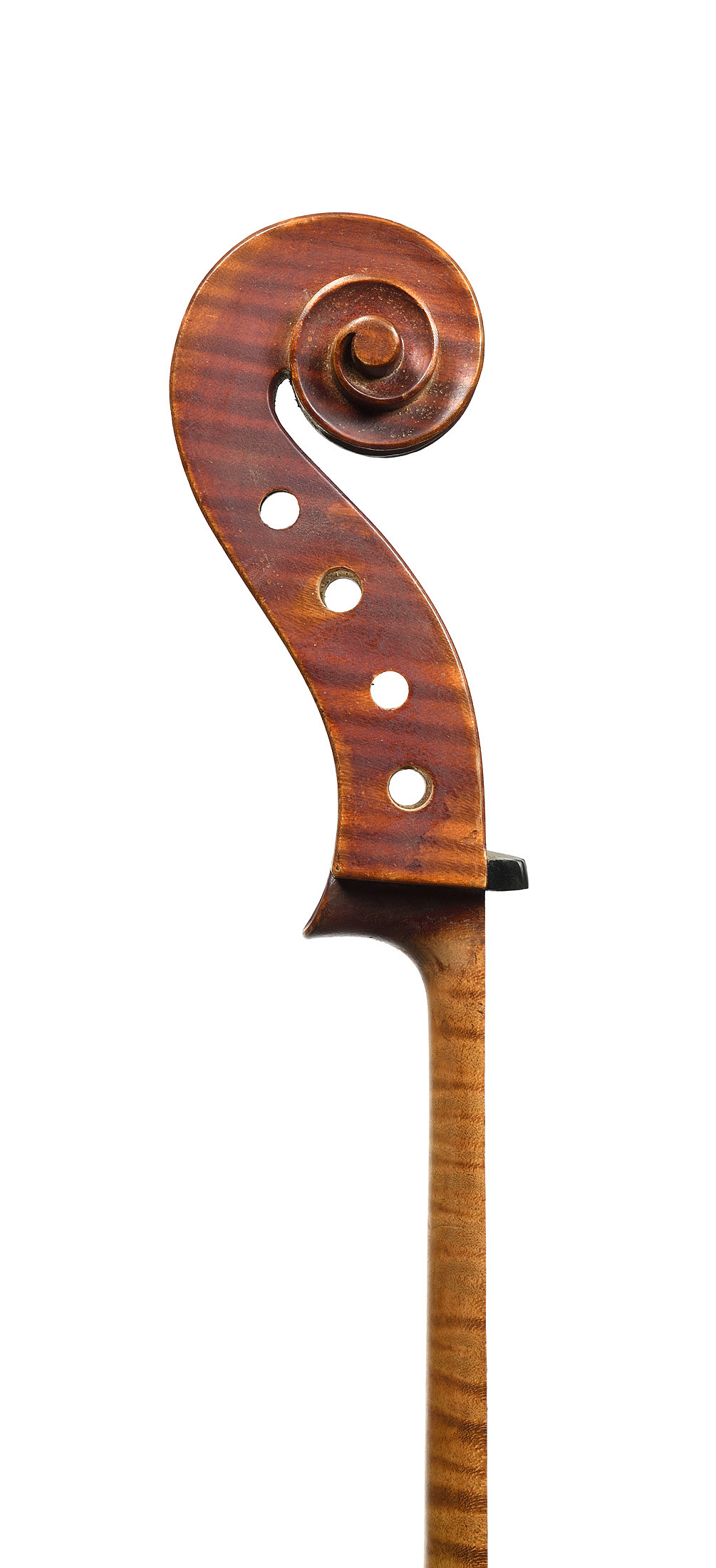 portant une étiquette "Charles RESUCHE, élève de Gand et Bernardel de Paris. Lyon. N° 7. 1896". Marques au fer. Fond de deux pièces en érable. Vernis brun rouge sur fond doré. Joint du fond à revoir. Cassure à revoir au talon du manche. Cassures d'éclisses. 763 mm.