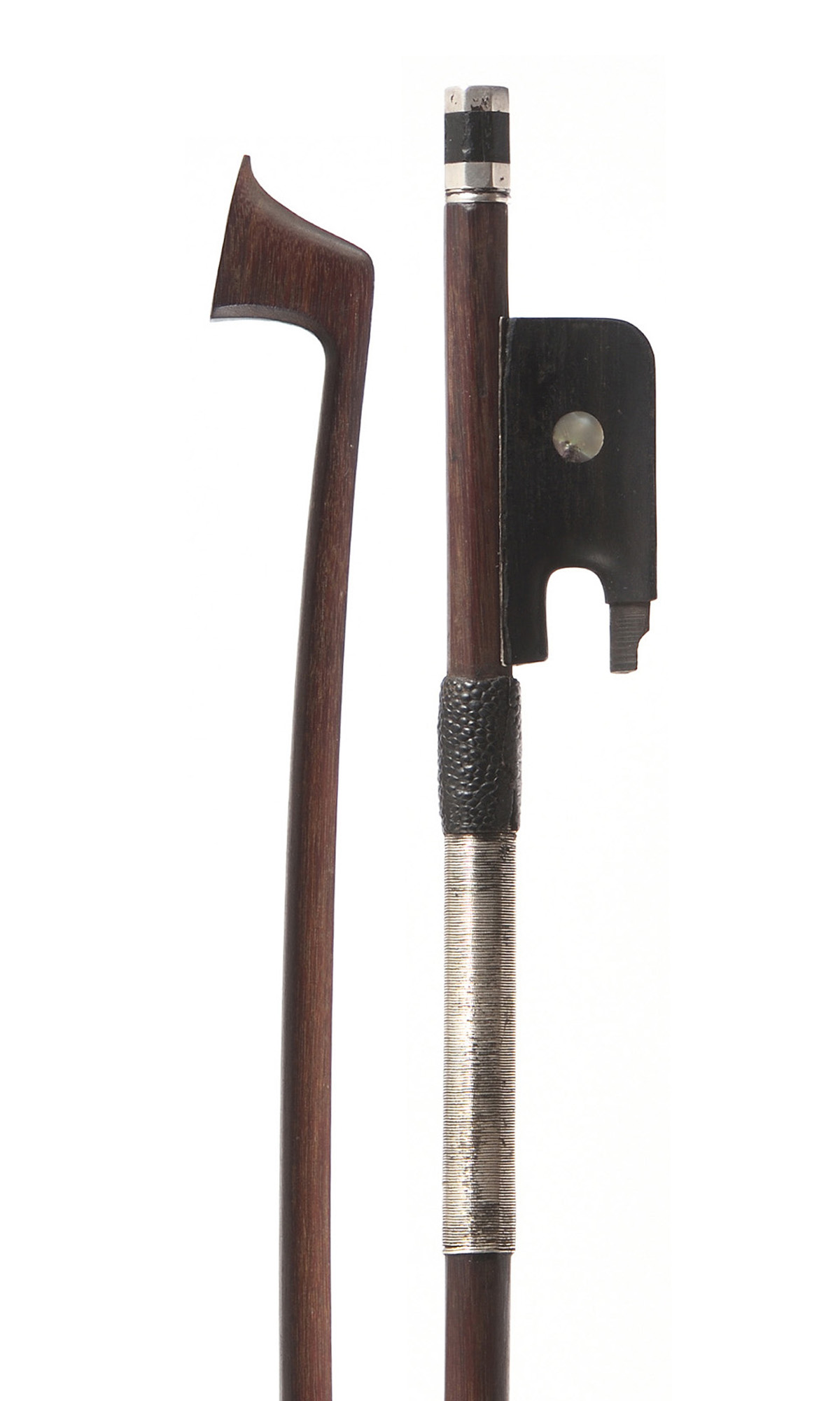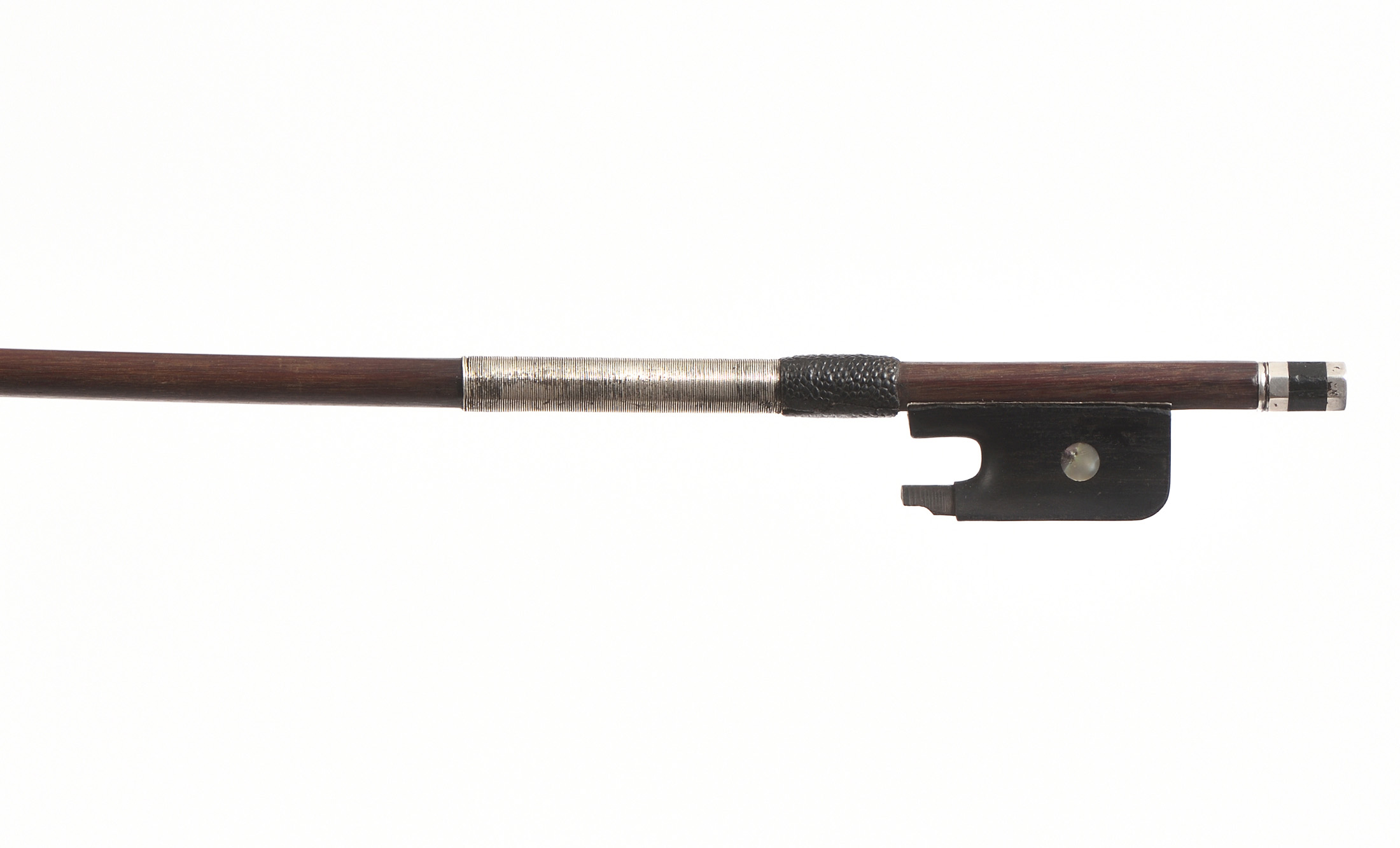 dont il porte la marque au fer et les trois C sous la hausse. Belle baguette en beau bois de pernambouc. 723 mm. Hausse ébène montée argent, manque le passant. 59,2 g sans plaque de tête, sans mèche, sans passant. Garniture argent sur soie.