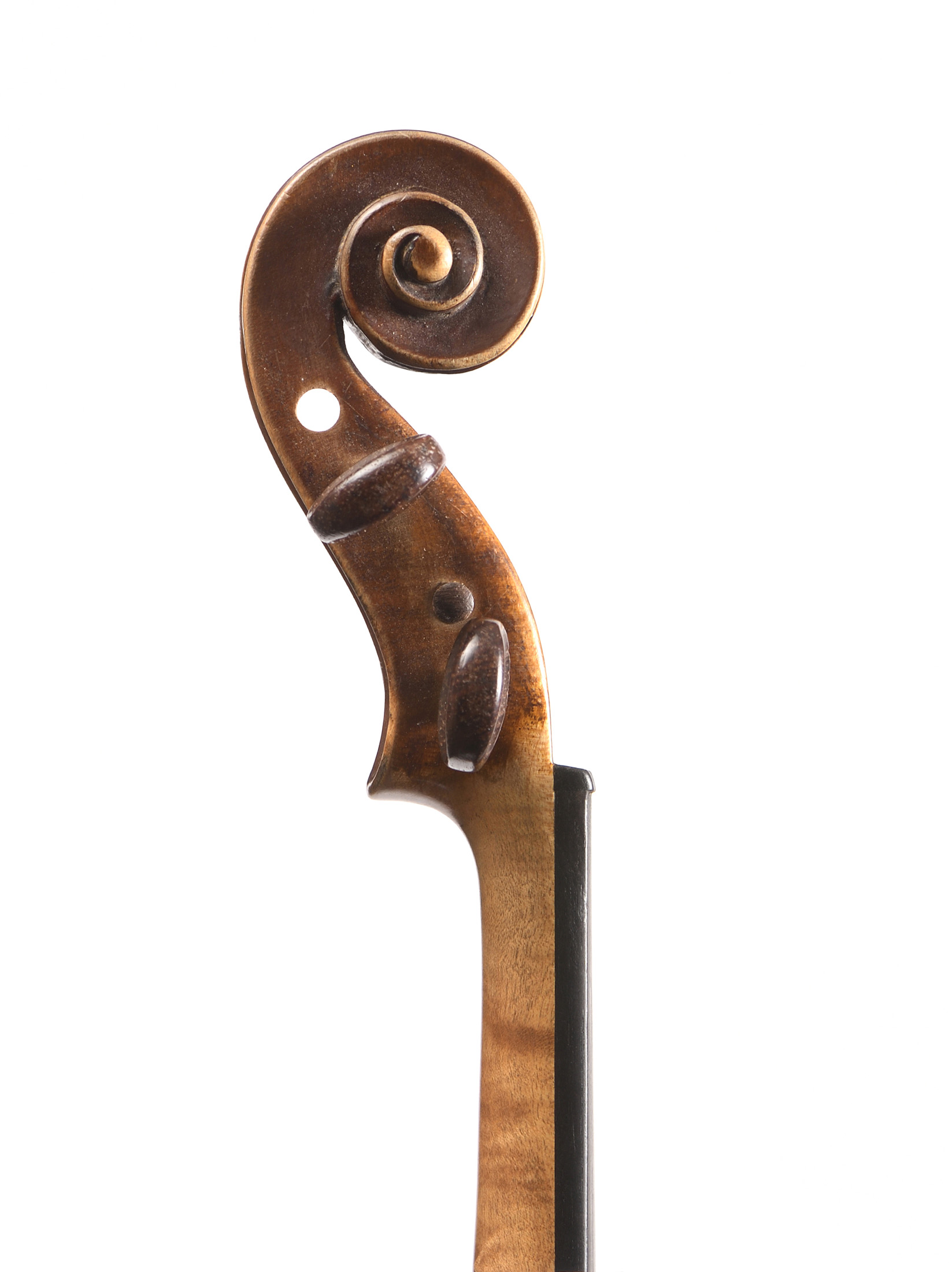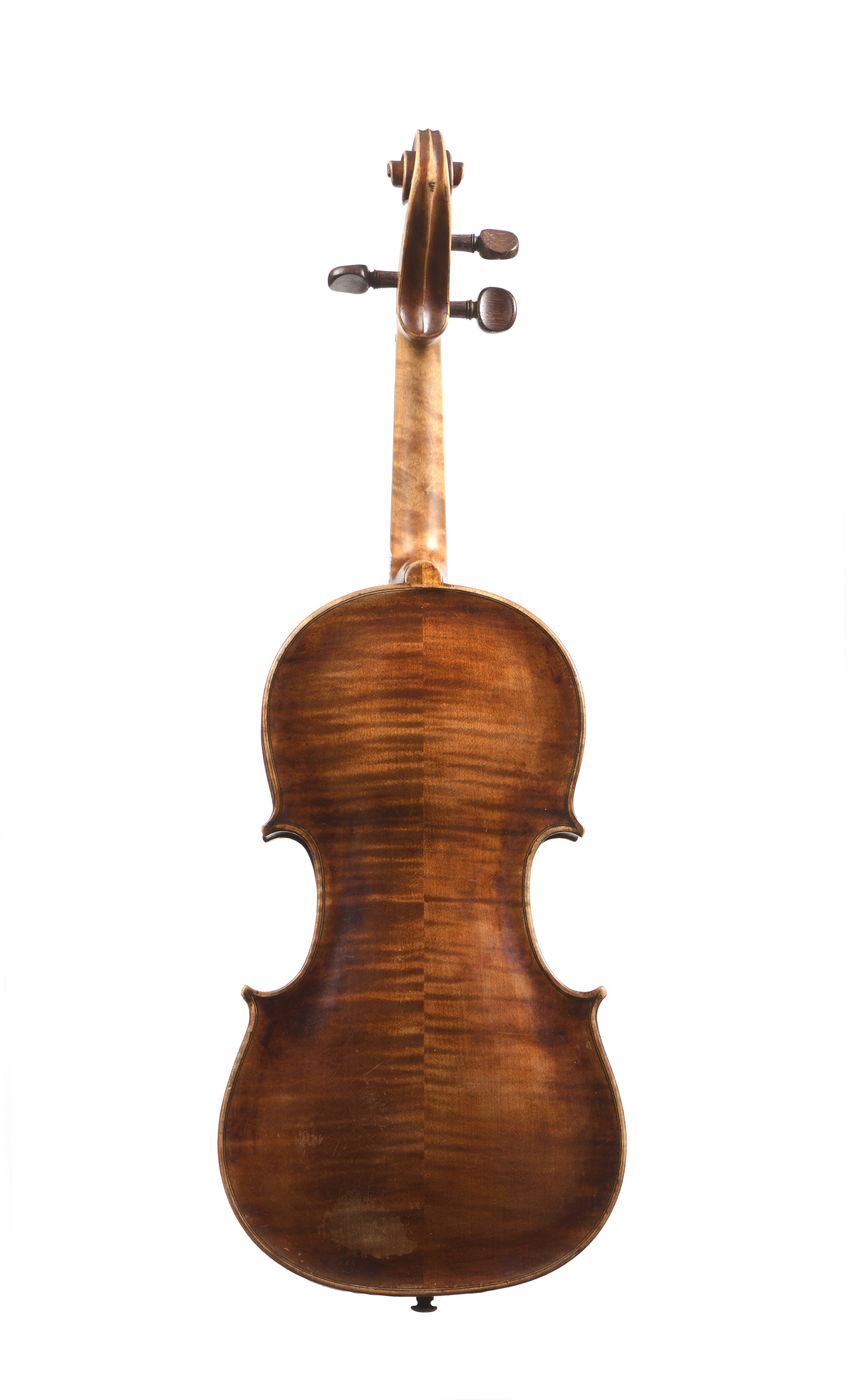 Portant une étiquette illisible. Fond de deux pièces en érable. Table en épicéa aux pores serré. Vernis brun sur fond doré. 359 mm.