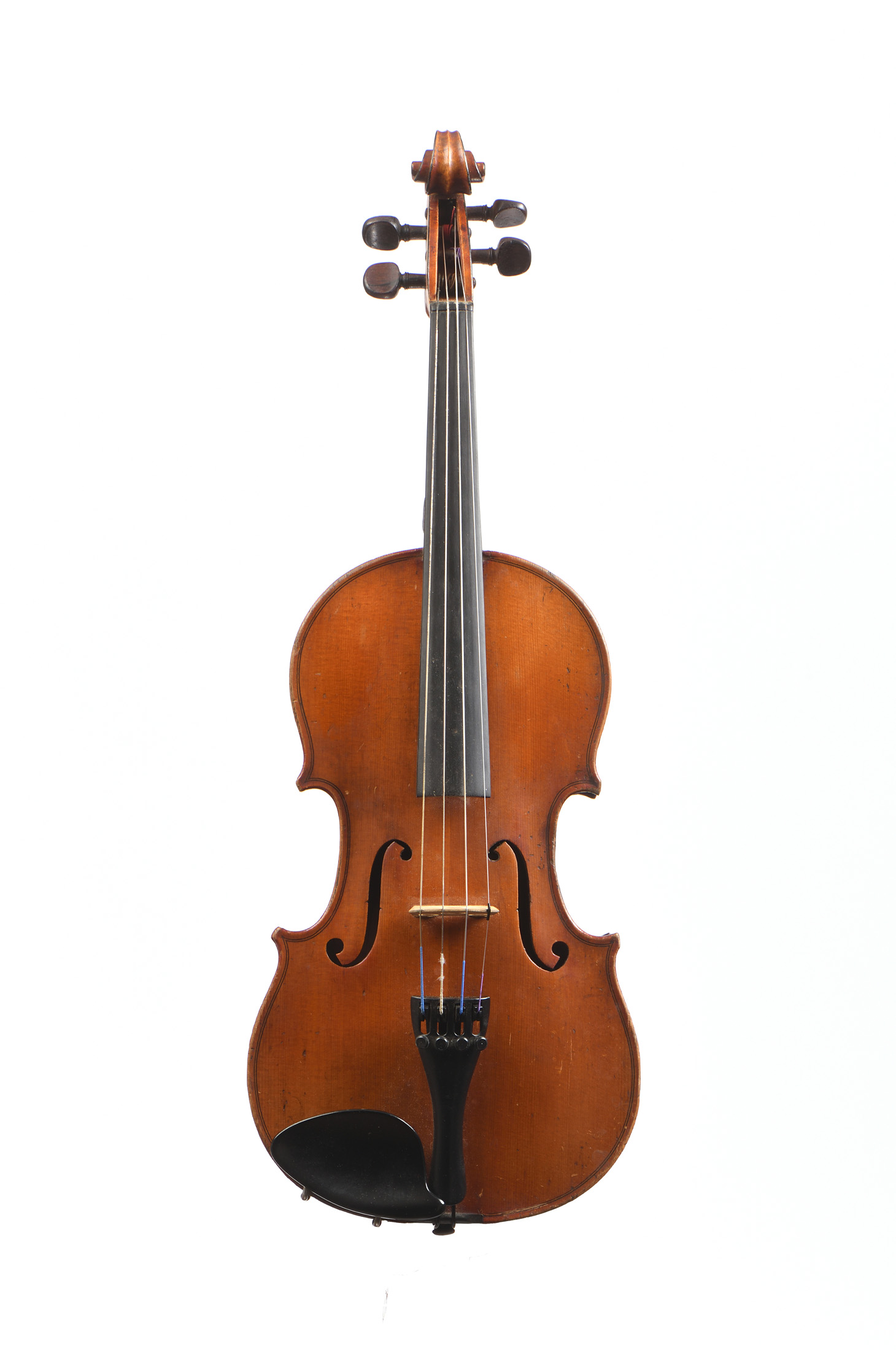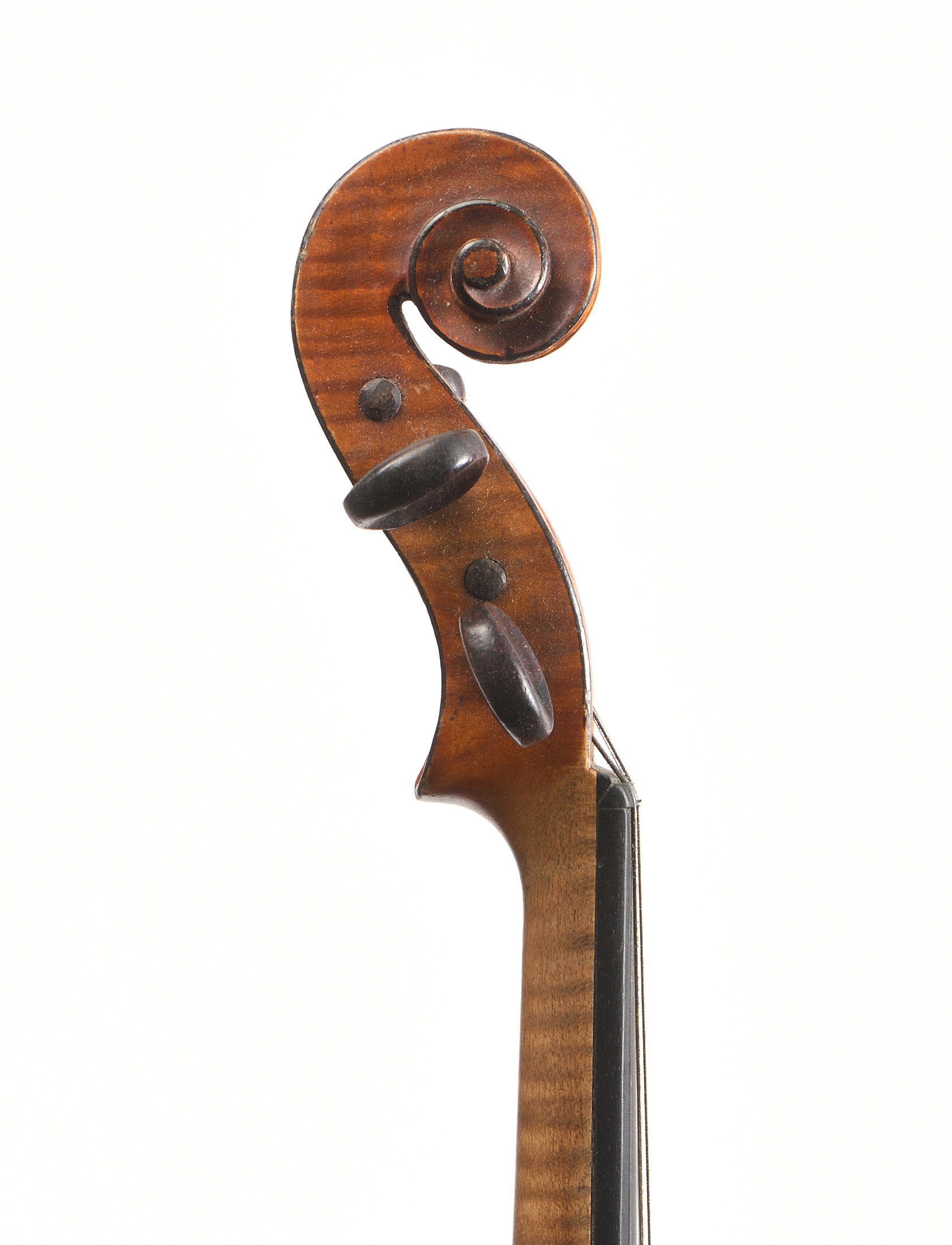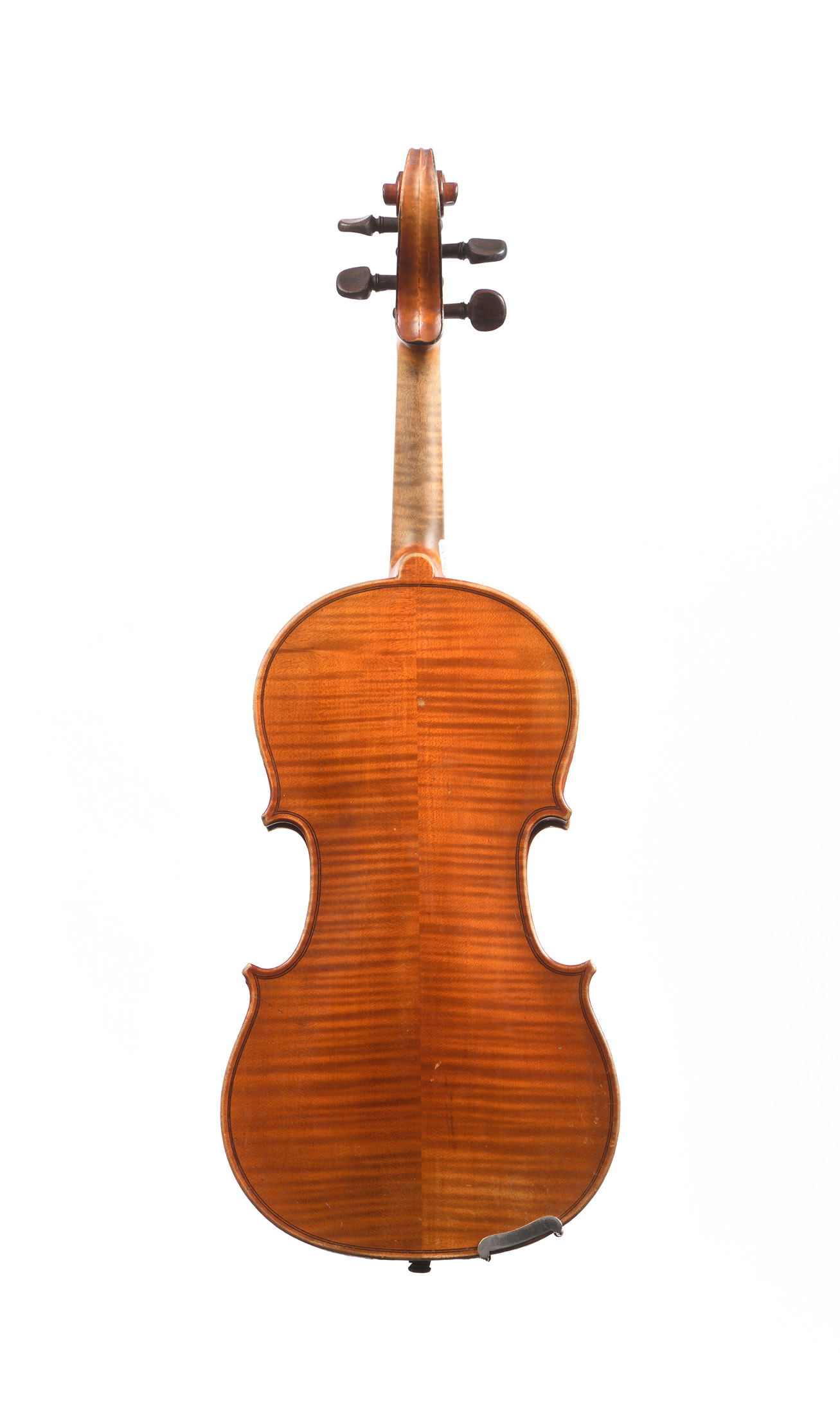 portant une étiquette "Stradivarius 1722...". Fond de deux pièces en bel érable aux ondes régulières. Table en épicéa aux pores réguliers. Vernis brun orangé sur fond doré. 339 mm.