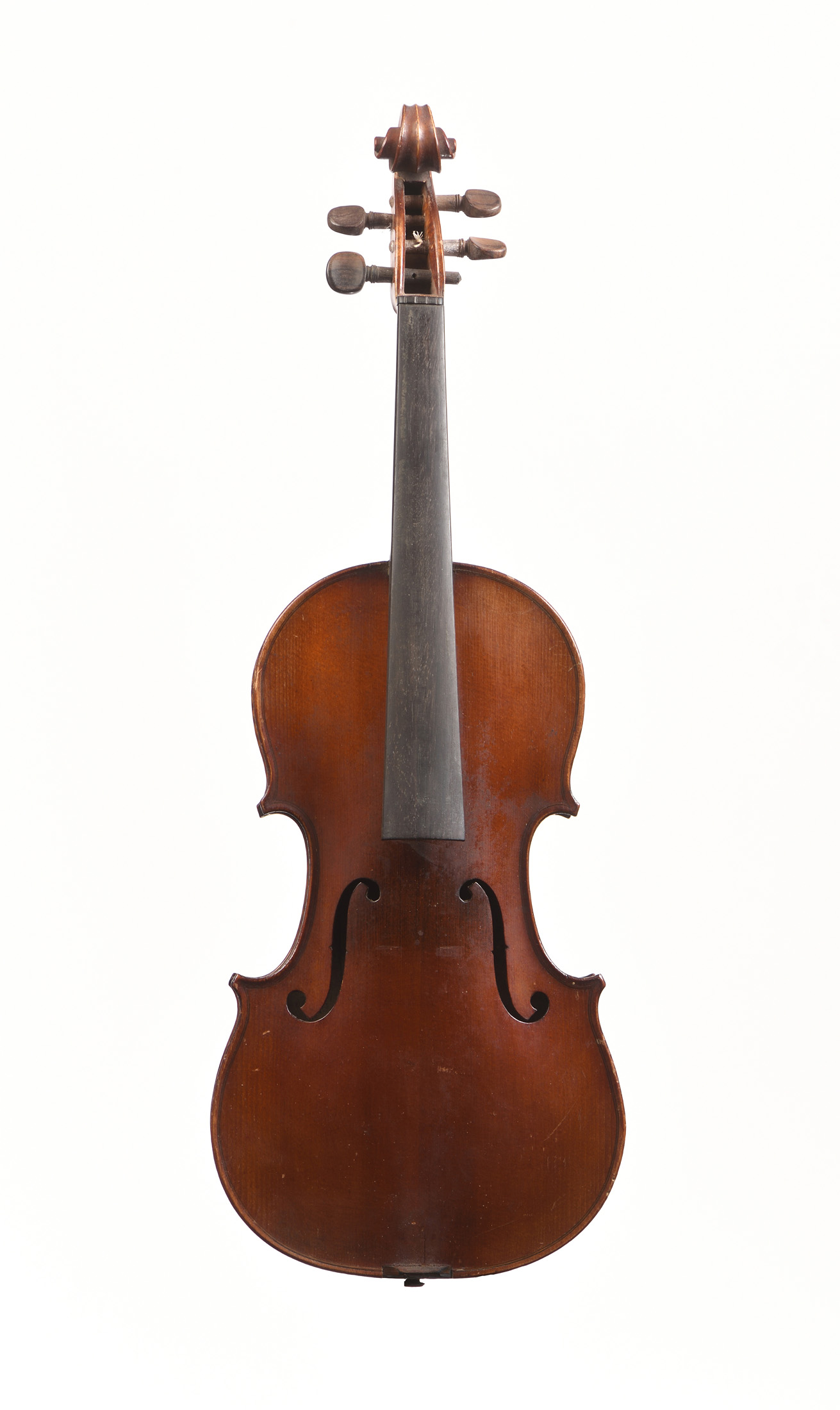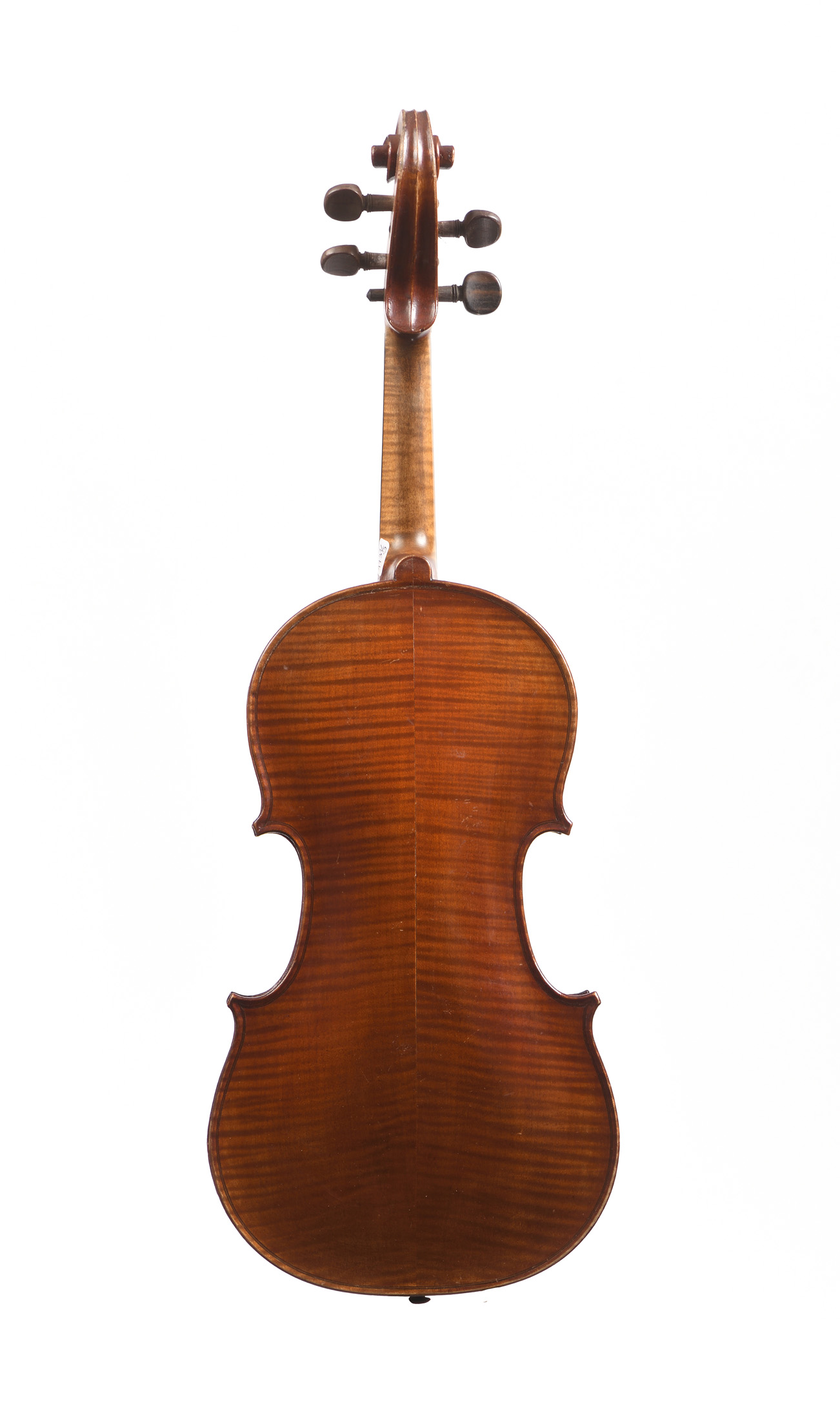 portant une étiquette "Modèle d'après Stradivarius 1721". Fond de deux pièces. Vernis brun sur fond doré. Joint du fond à revoir. Décollages. Petite cassure à la table au sillet du bas. 357 mm.