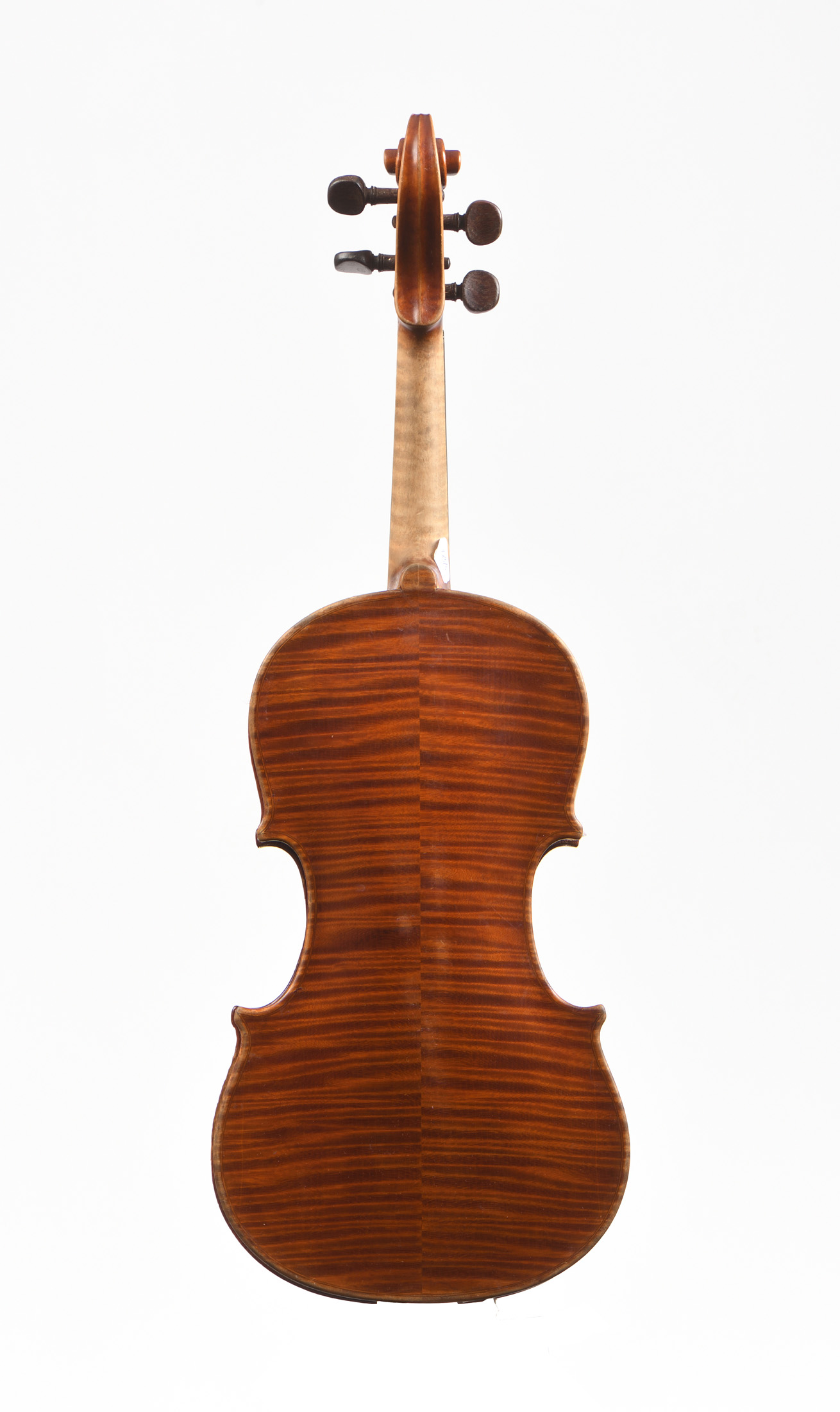 En modèle de Guarneri. Fond de deux pièces. Diverses cassures à la table réparées. Décollages. Manques aux éclisses.