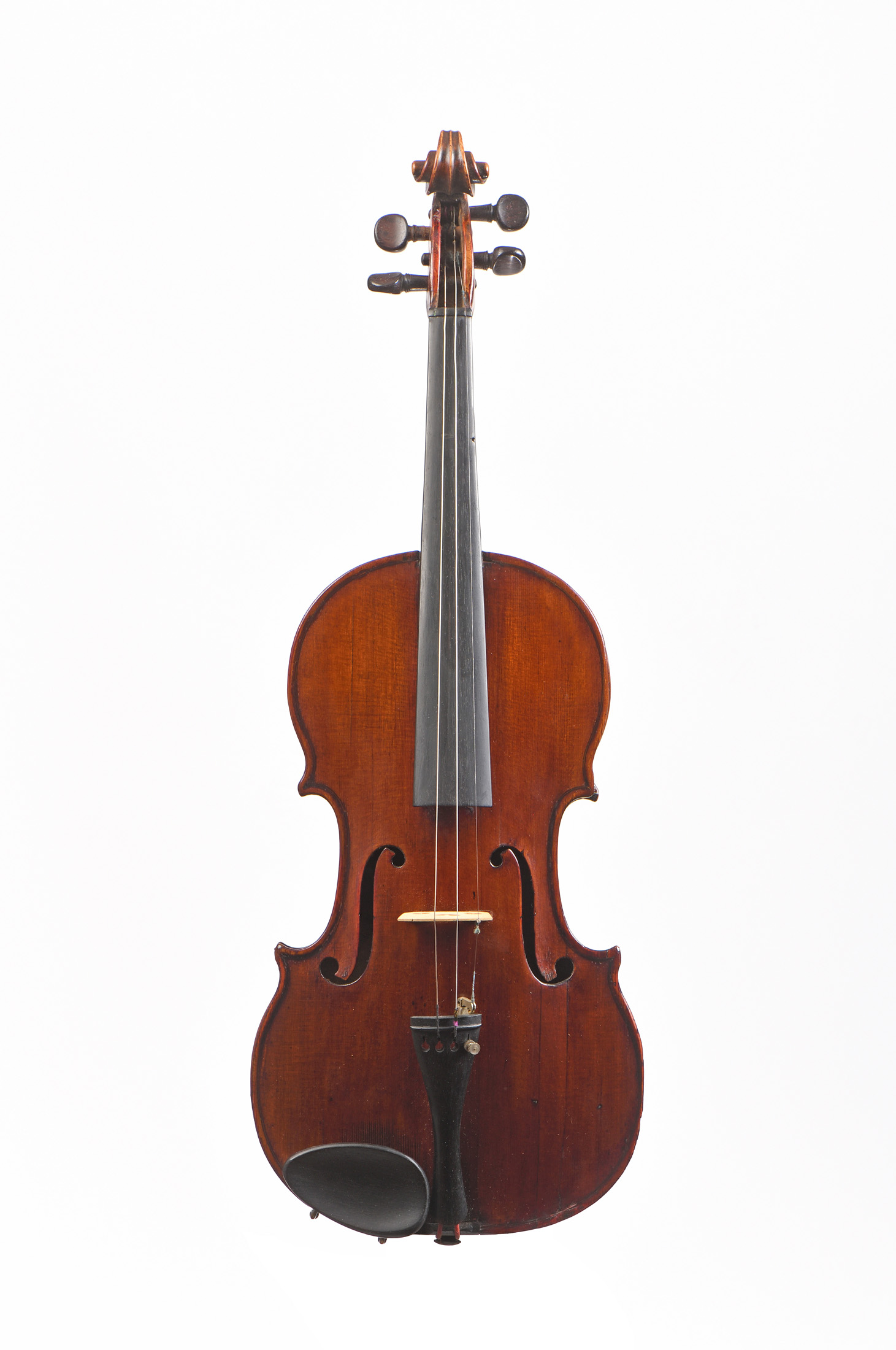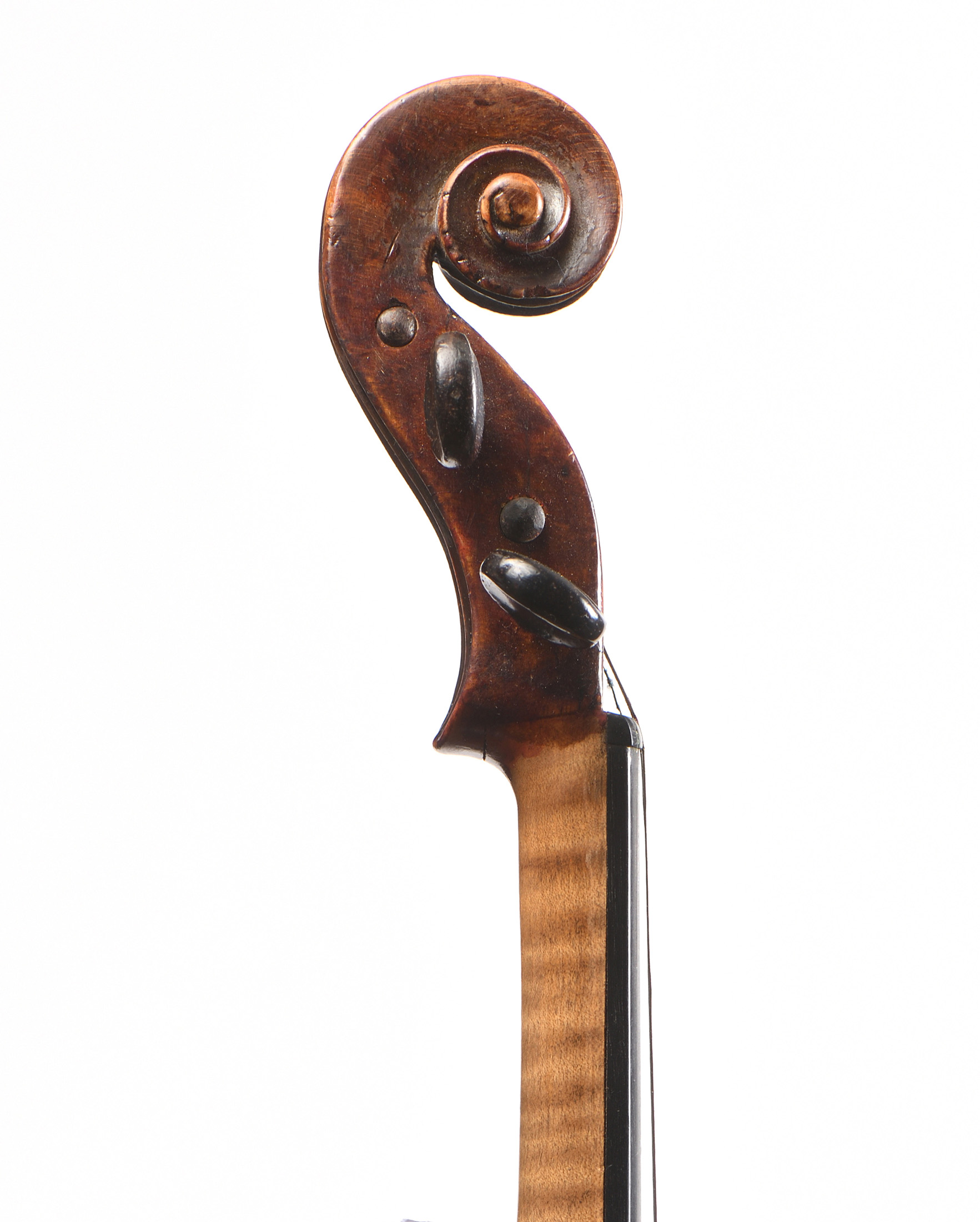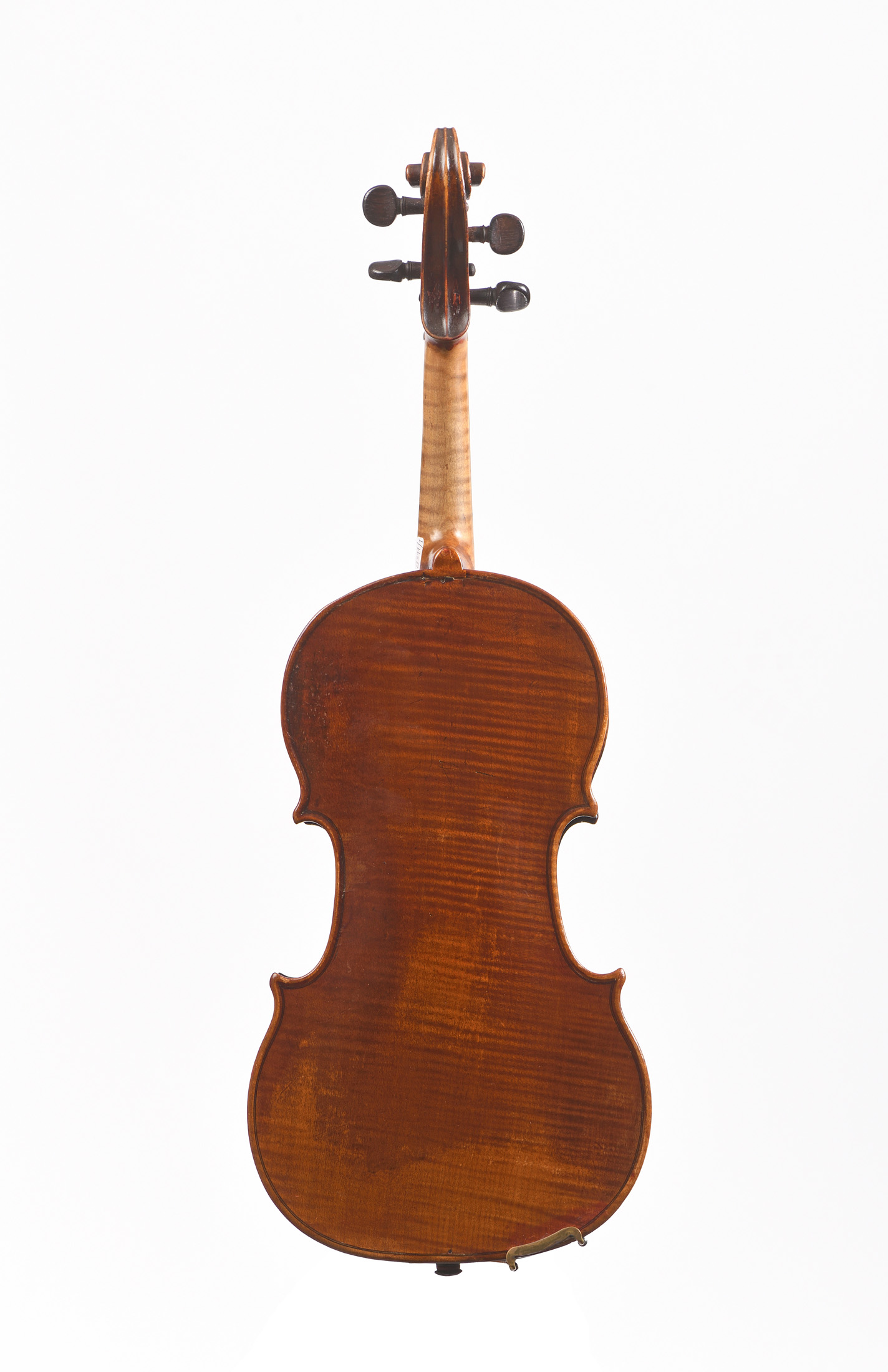 dont il porte la marque au fer "A la ville de CREMONNE...D. NICOLAS AINE". Fond d'une pièce. Vernis brun doré. Diverses cassures à la table, dont une à l'âme. Restauration au talon du manche. En l'état. 363 mm