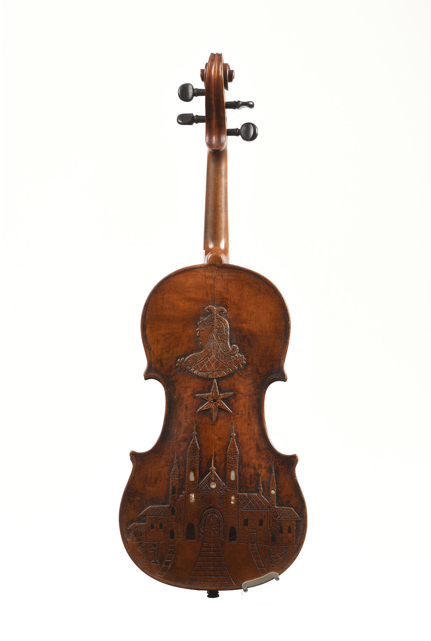 portant une étiquette apocryphe " Carlo Bergonzi... 1741". Fond de deux pièces d'un fond sculpté. Usures et cassures. 357 mm.