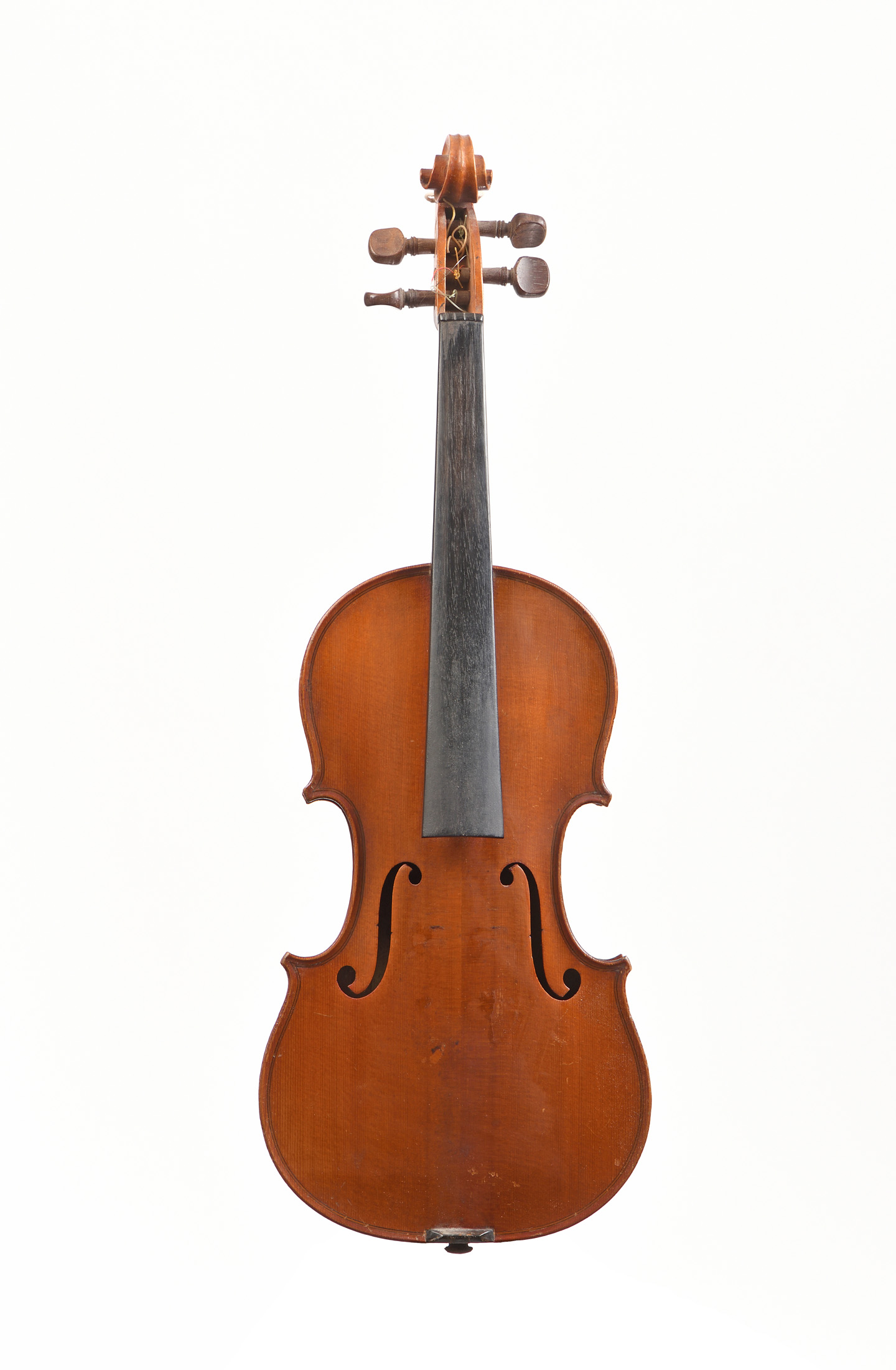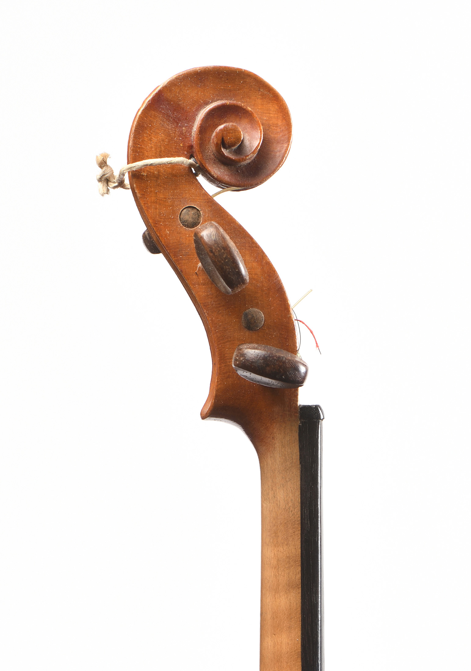 portant une étiquette "Modèle d'après Antonius Stradivarius... 1721". Fond de deux pièces. vernis brun orangé sur fond doré. Avec boite et archet sans valeur commerciale.