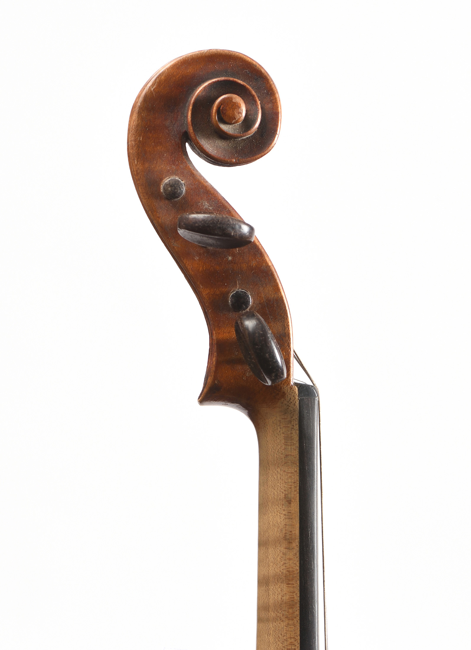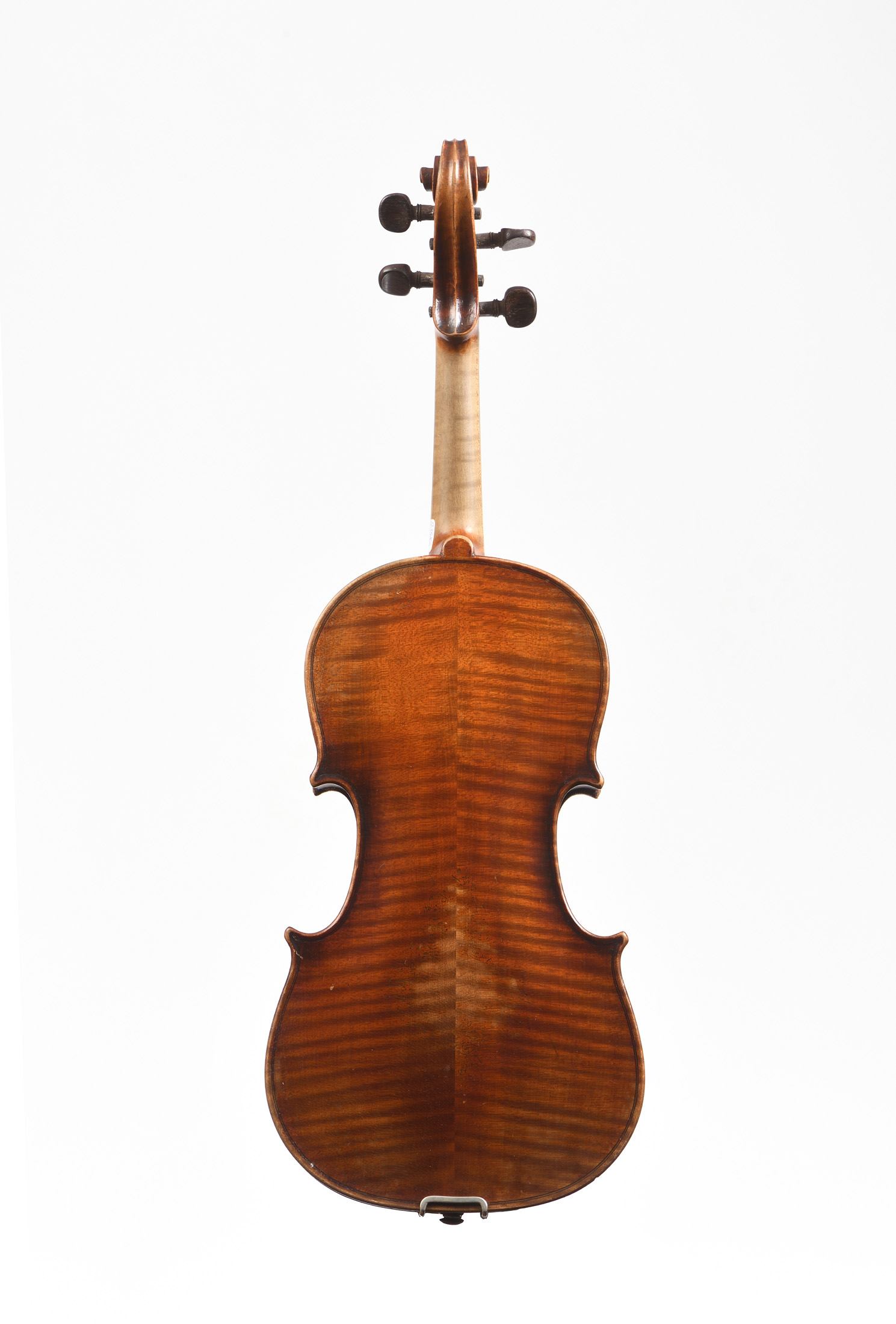 portant une étiquette "Francesco RUGGIERI...". Fond de deux pièces en bel érable, ondes régulière descendantes. Diverses cassures à la table. Table en sapin aux pores plutôt réguliers, larges au centre, plus fins sur les bords. Deux cassures recollées sur le flan gauche du haut. Avec boite et trois archets. 357 mm.